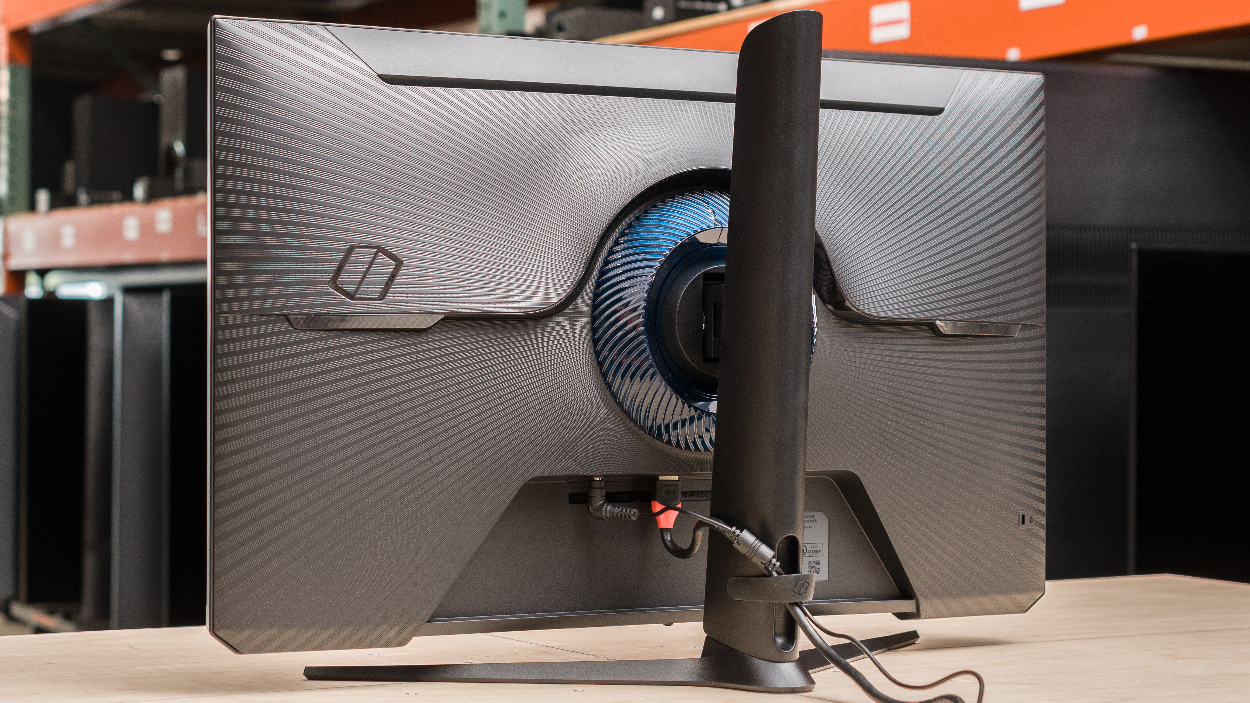 The Samsung Odyssey G51C has a gamer-oriented aesthetic with etched lines on the back. There's a blue ring where the stand attaches to the back, but it doesn't feature RGB lighting like on other monitors.