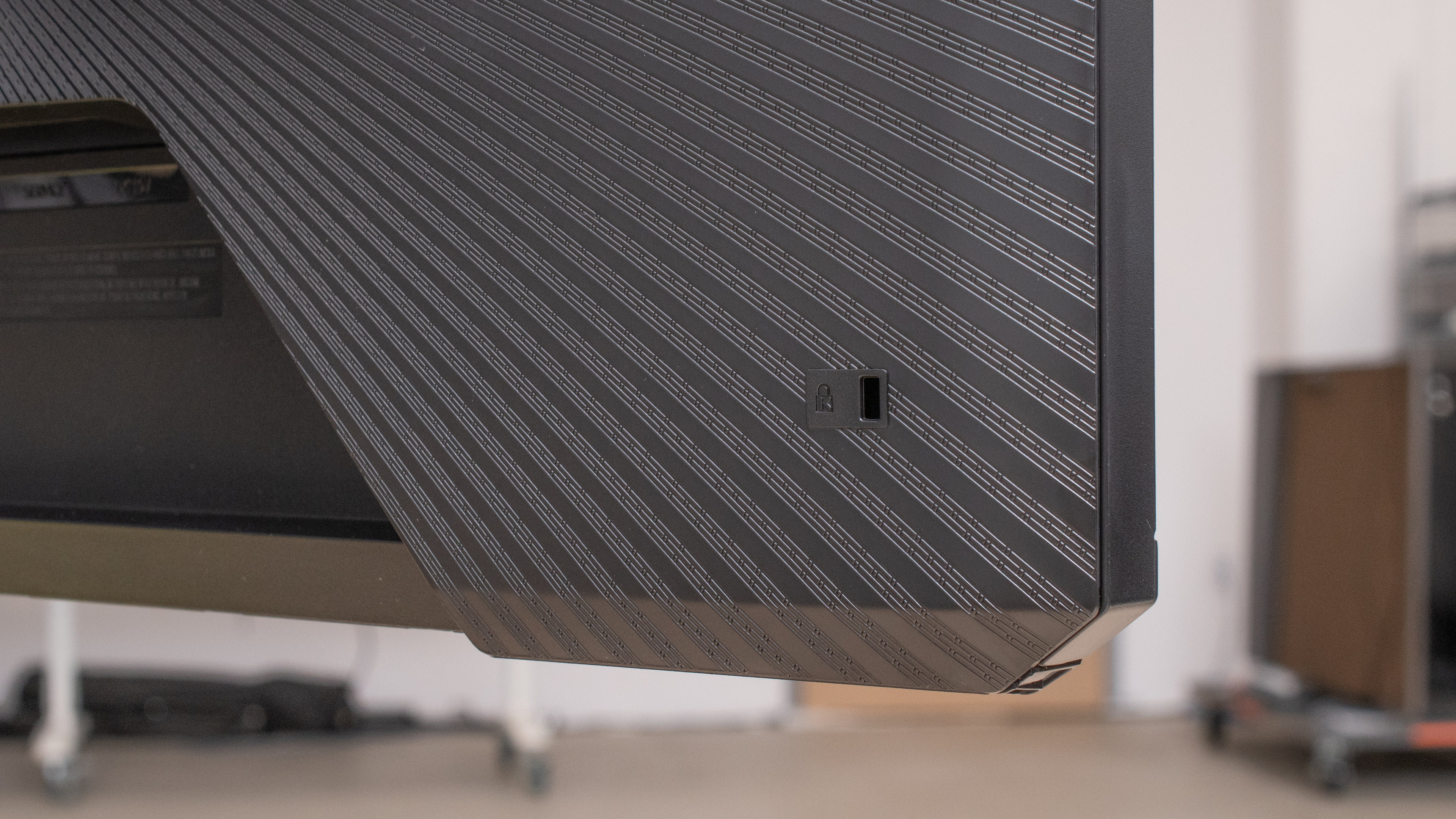 This monitor has a gaming-oriented design with a flat screen. It's made mainly out of plastic with an etched design on the back, and it should look nice in any gaming setup. It also has a Kensington lock to secure the monitor to a solid object.