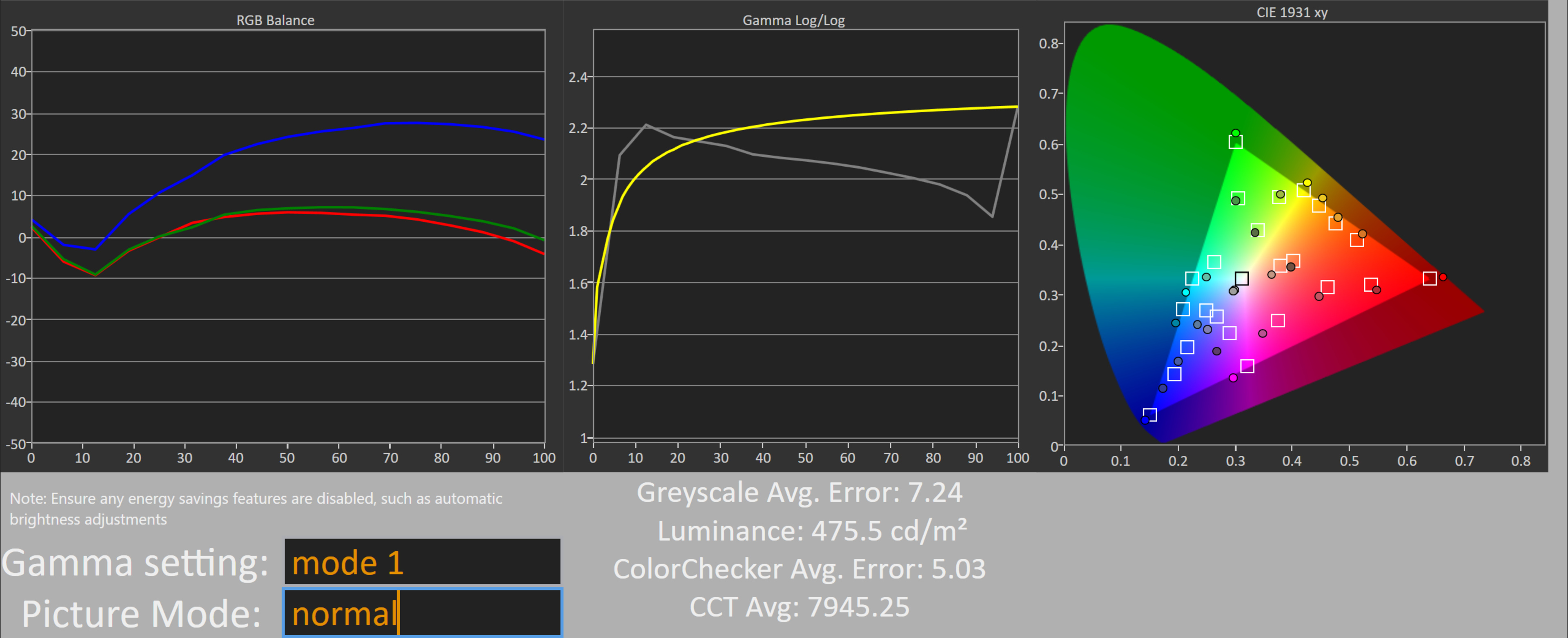 The accuracy before calibration is decent. The sRGB mode locks the colors to the sRGB colors space, so they don't look oversaturated. However, some colors are still off, and the white balance is terrible. The color temperature is also much colder than the 6500K target, giving the image a blue tint. Gamma doesn't follow the target sRGB curve well either, as most scenes are too bright. The sRGB mode also locks some picture settings, so if you want more customizability, you'll need to use another picture mode that has oversaturated colors.