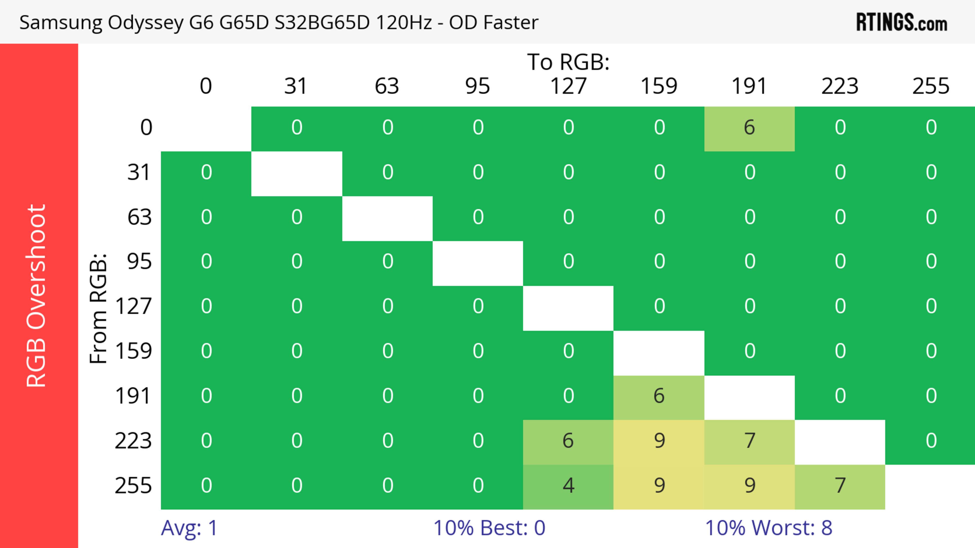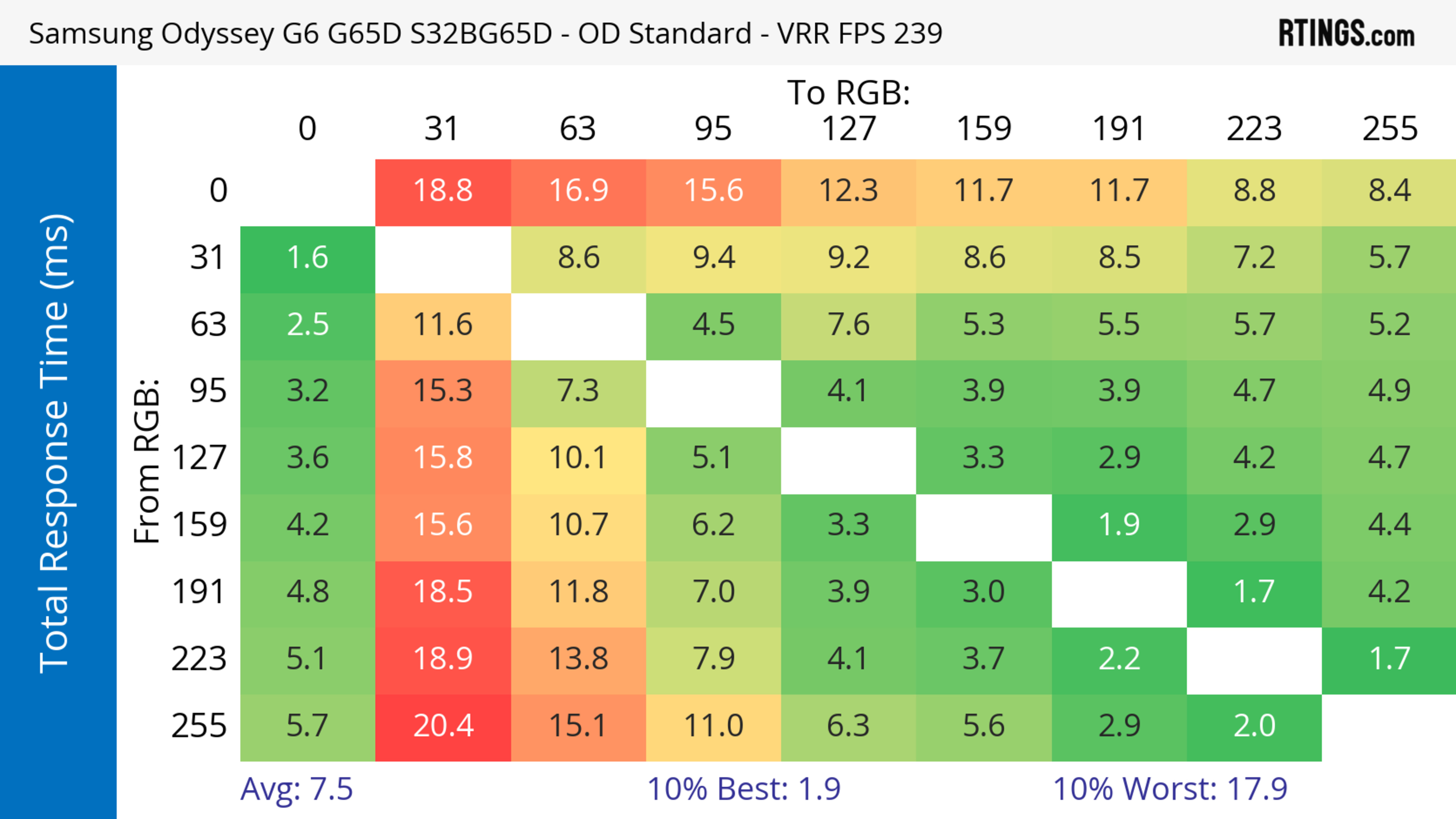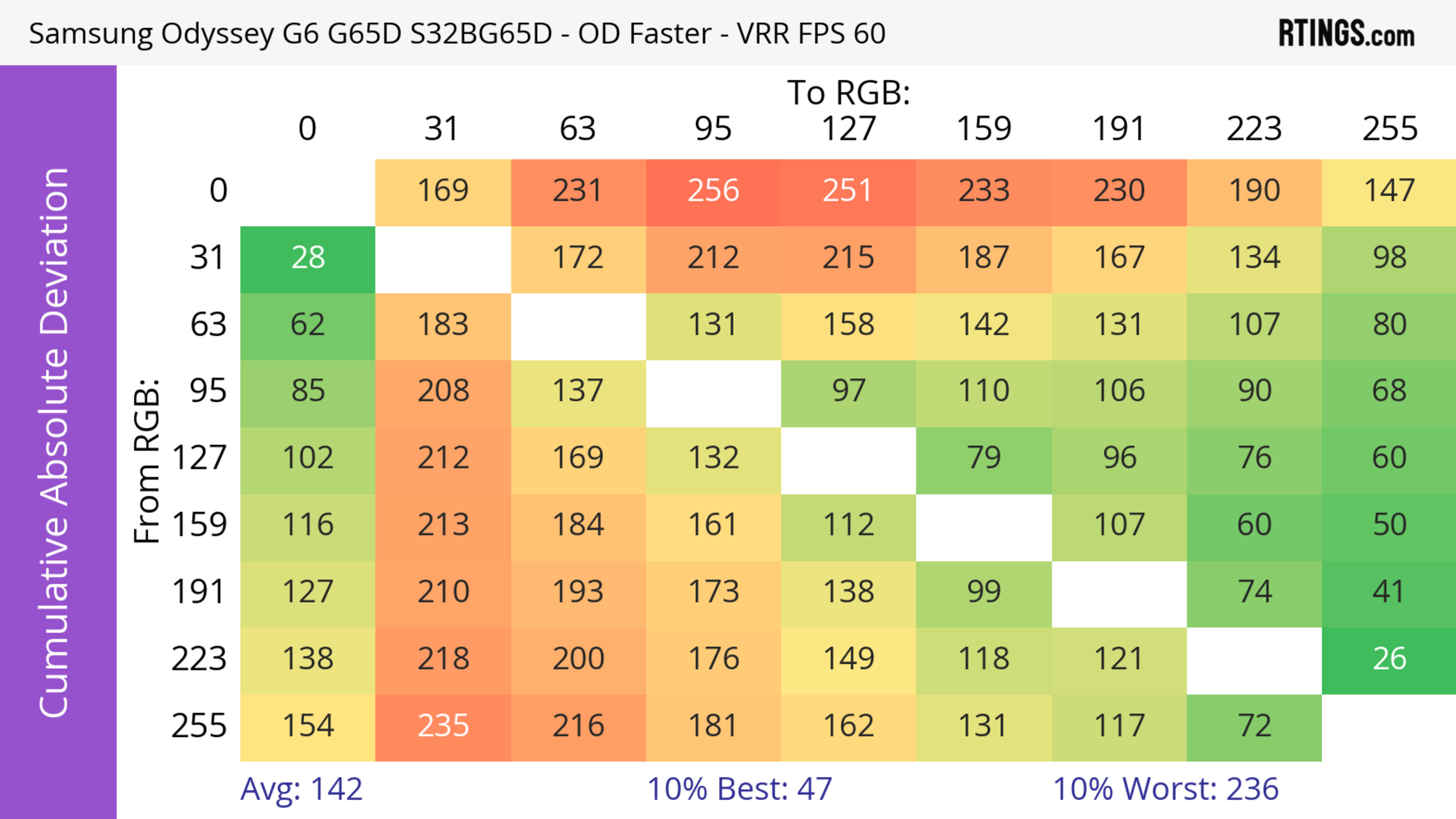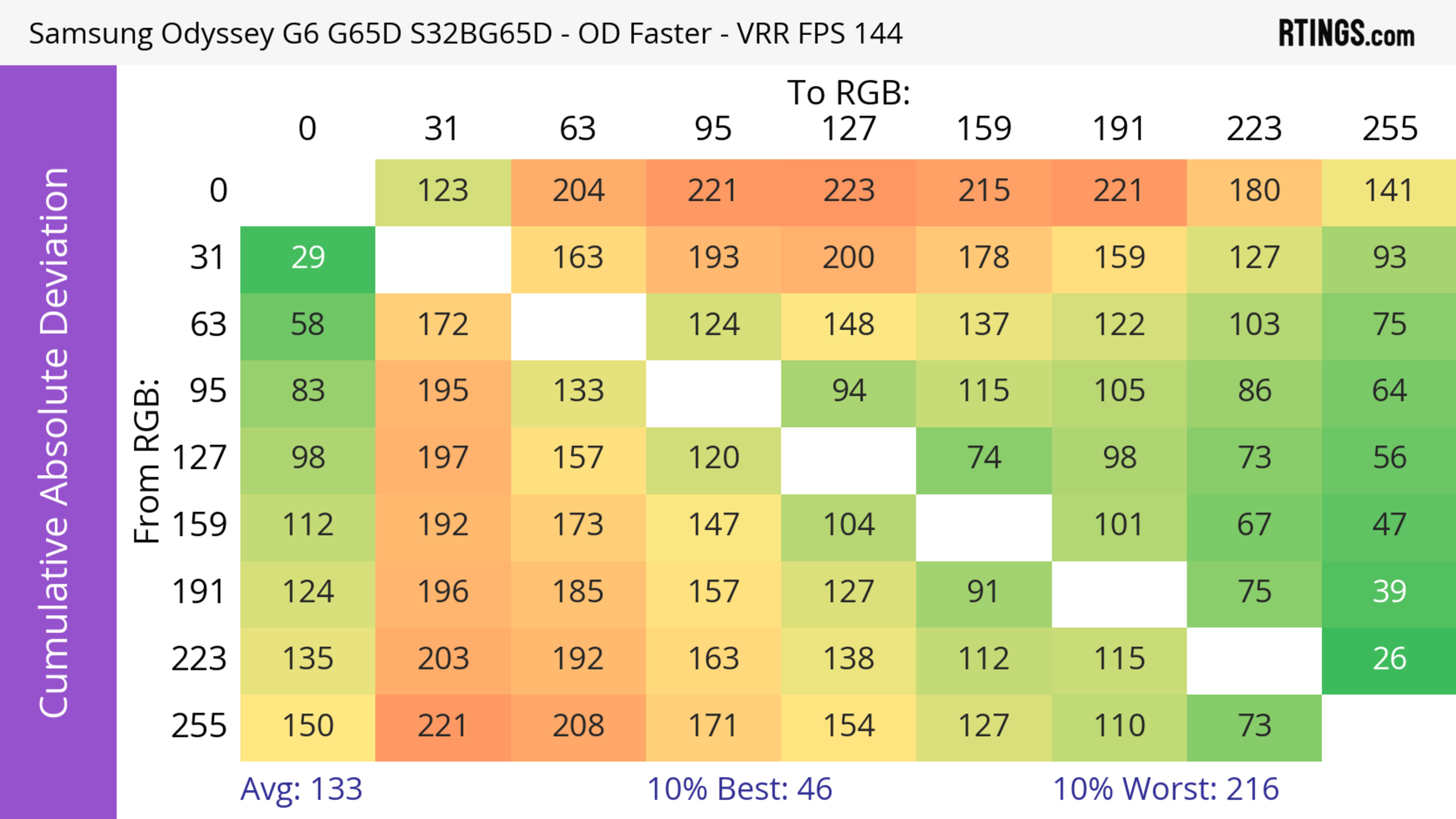 The refresh rate compliance is great. Although its response time isn't fast enough to make full color transitions before the monitor draws the next frame at the max refresh rate, it's much better at lower refresh rates.