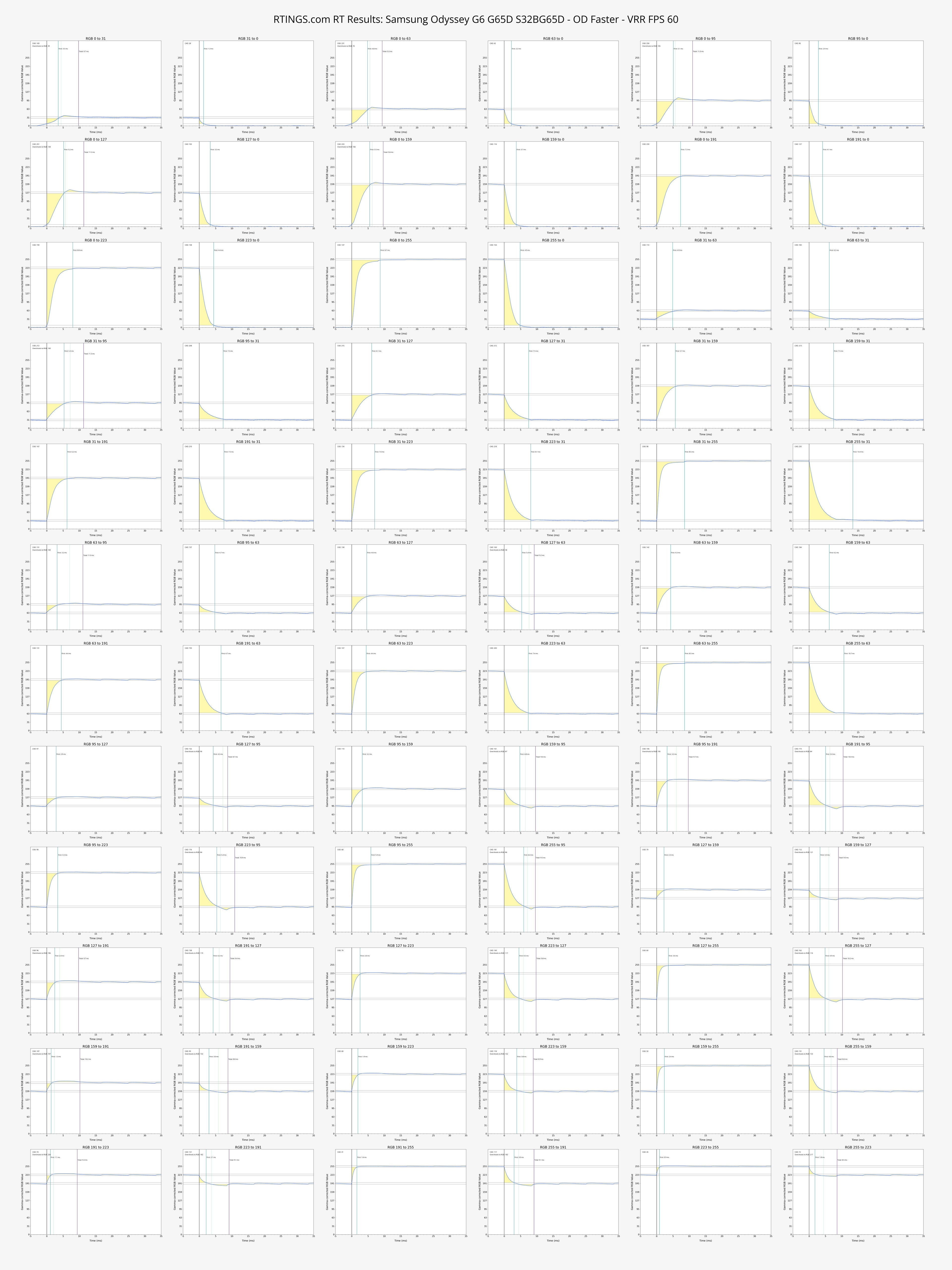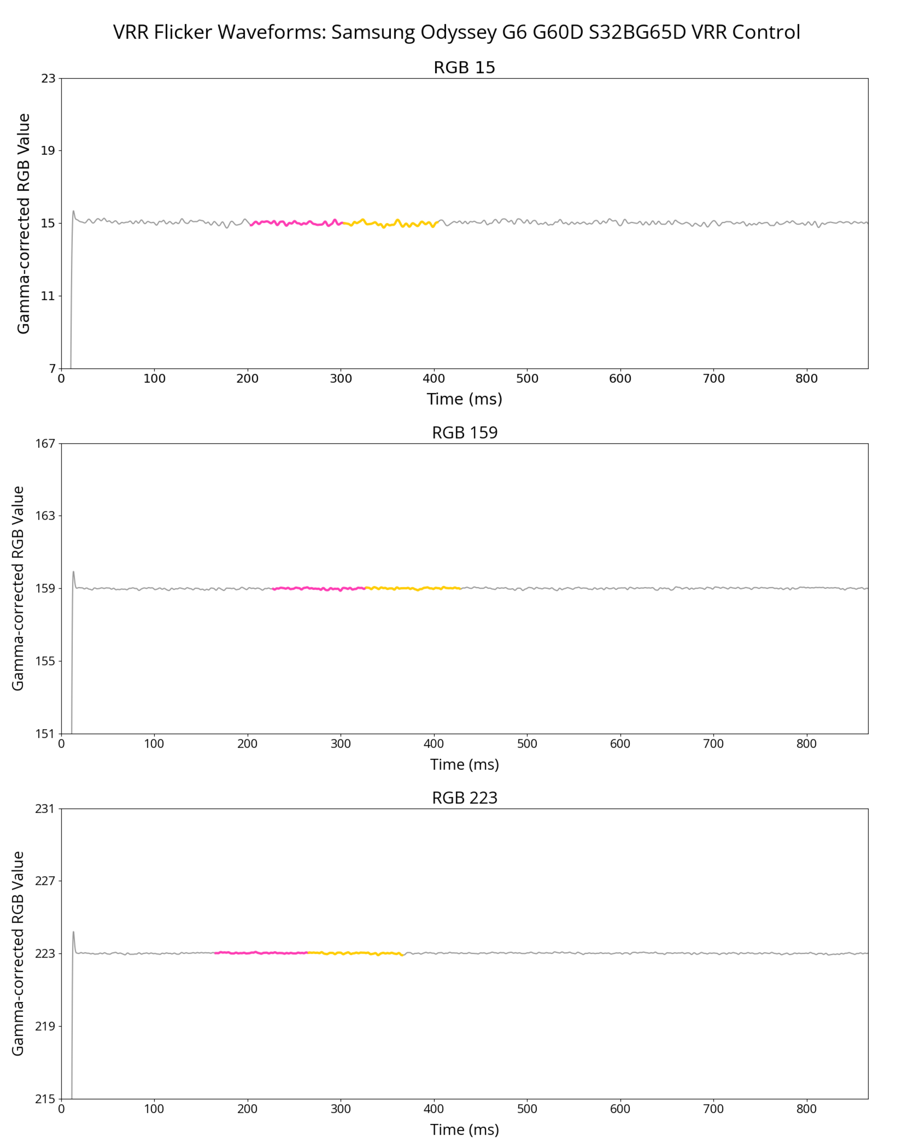 The Samsung Odyssey G65D has terrible VRR flicker with changing frame rates. It's mostly distracting in dark scenes and dark parts of brighter scenes. There's a VRR Control setting that eliminates the VRR flicker, but it introduces stutter and increases the input lag instead. You can see the results for it below:
