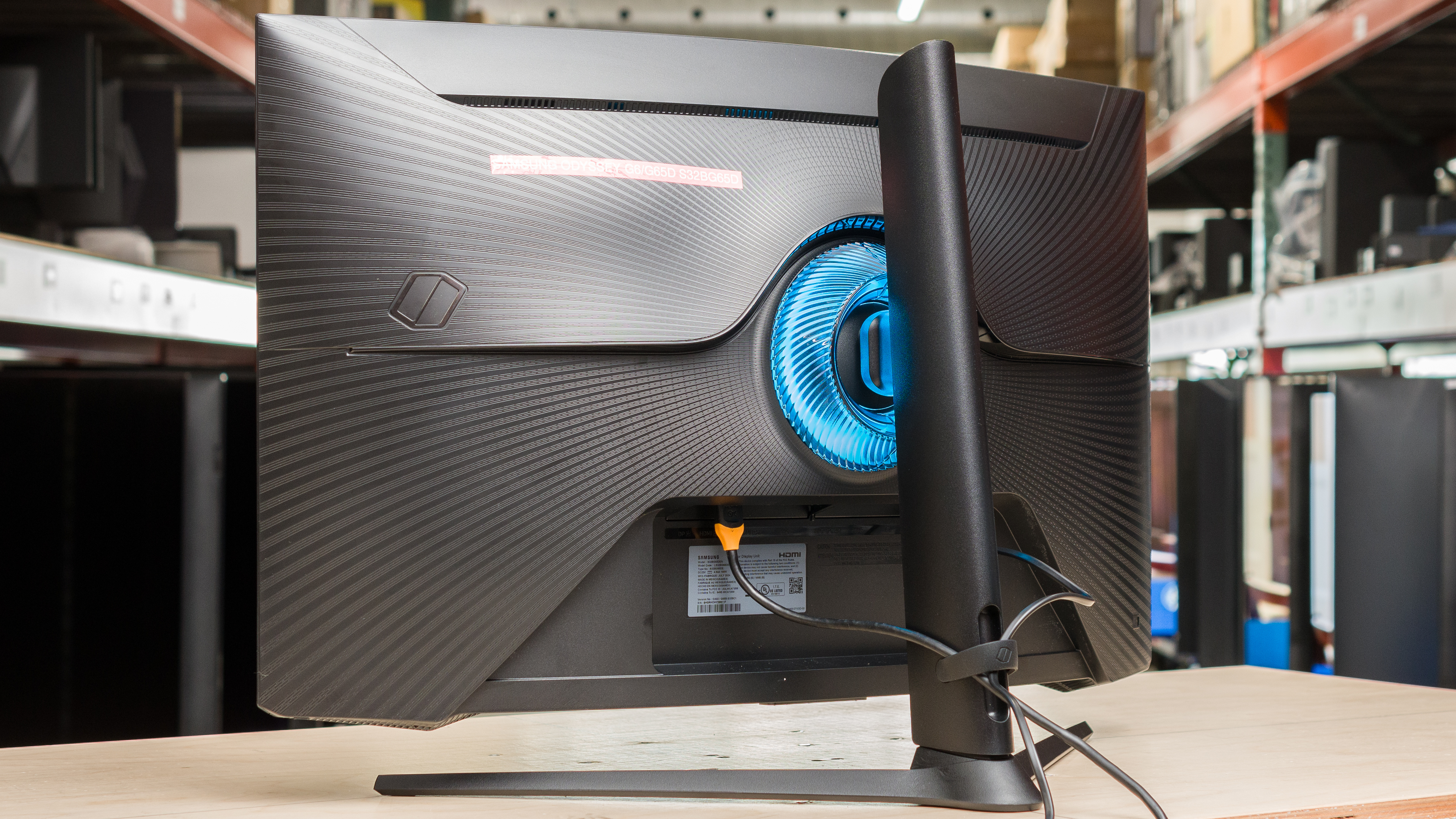 The Samsung Odyssey G65D has a gaming-oriented design with an aggressively curved screen. It's made entirely of black plastic, and there are some etched designs on the back. It also features RGB lighting below the bottom bezel and on the ring where the stand attaches to the screen.