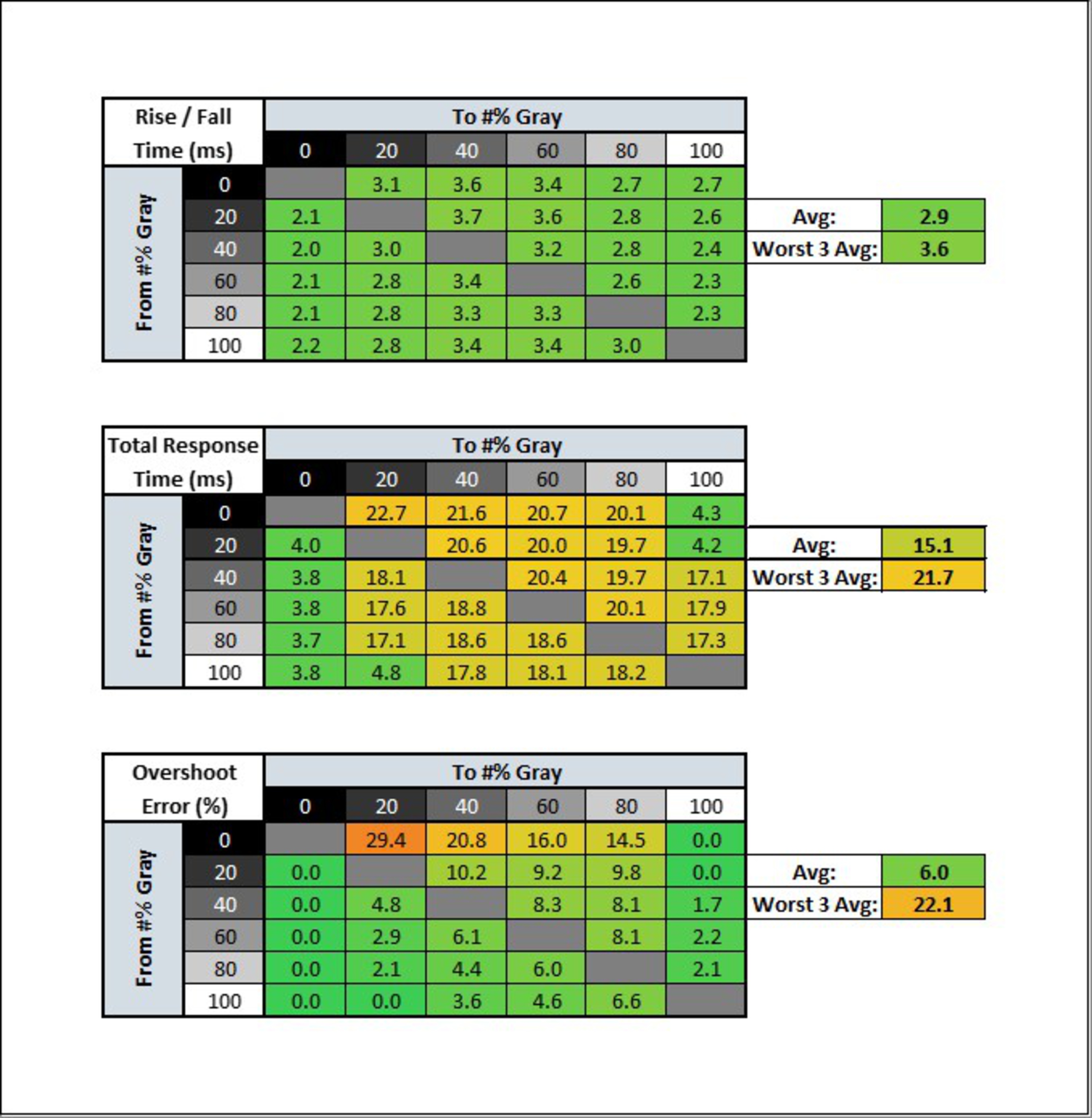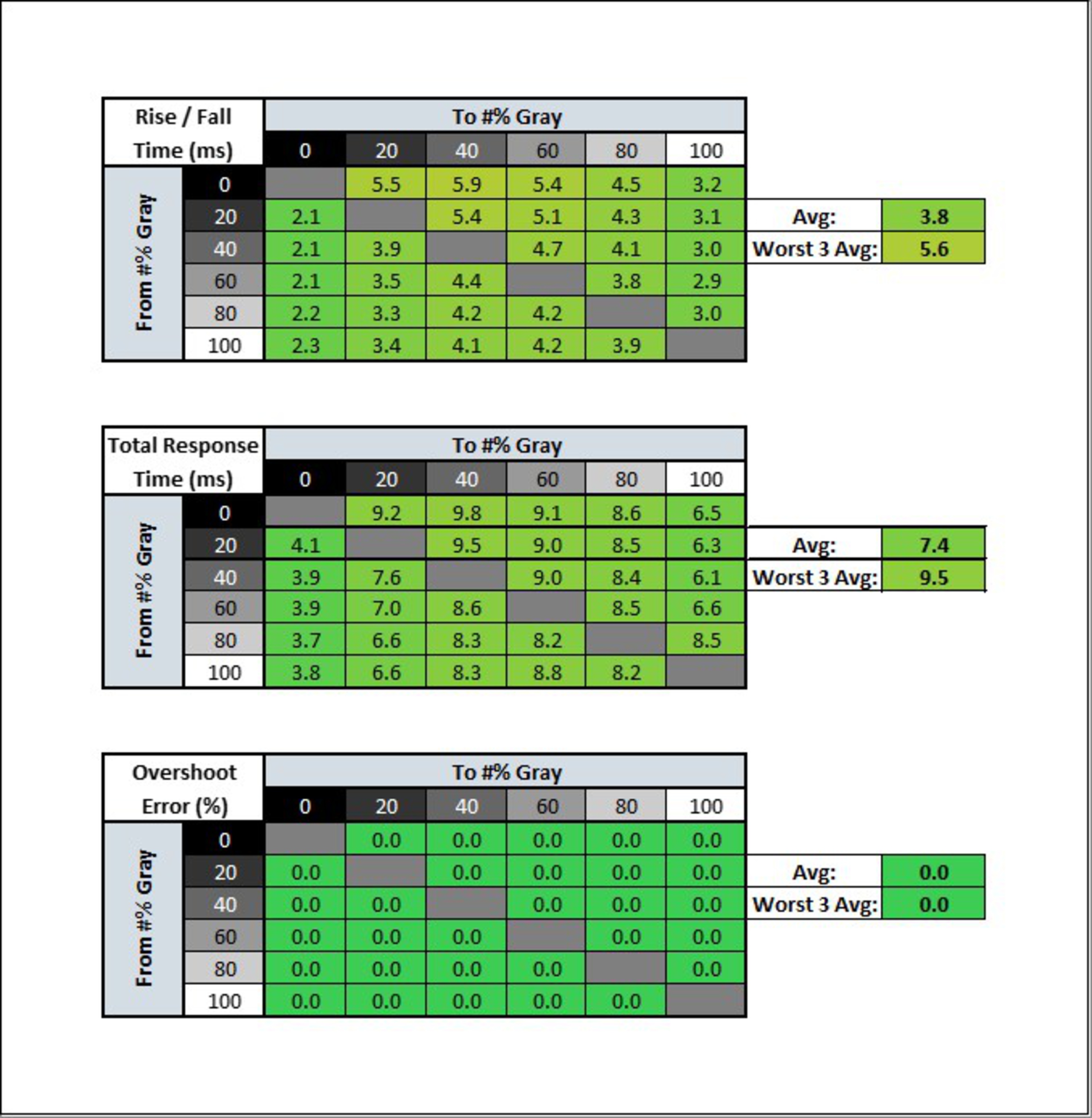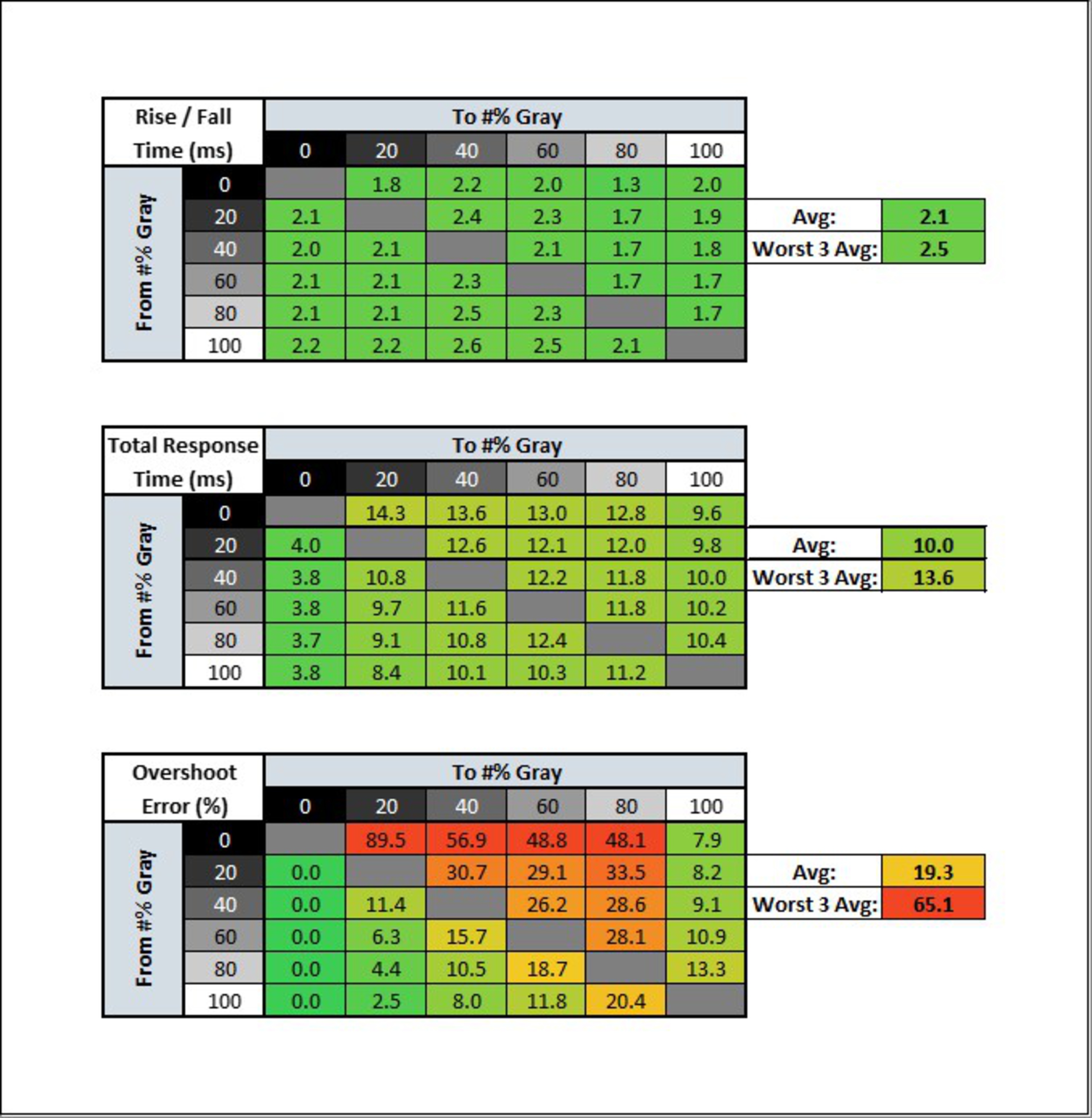 The refresh rate compliance is good. Although its response time isn't fast enough to make full color transitions at the max refresh rate, it's much better at lower refresh rates, especially with the recommended overdrive of 'Standard.'