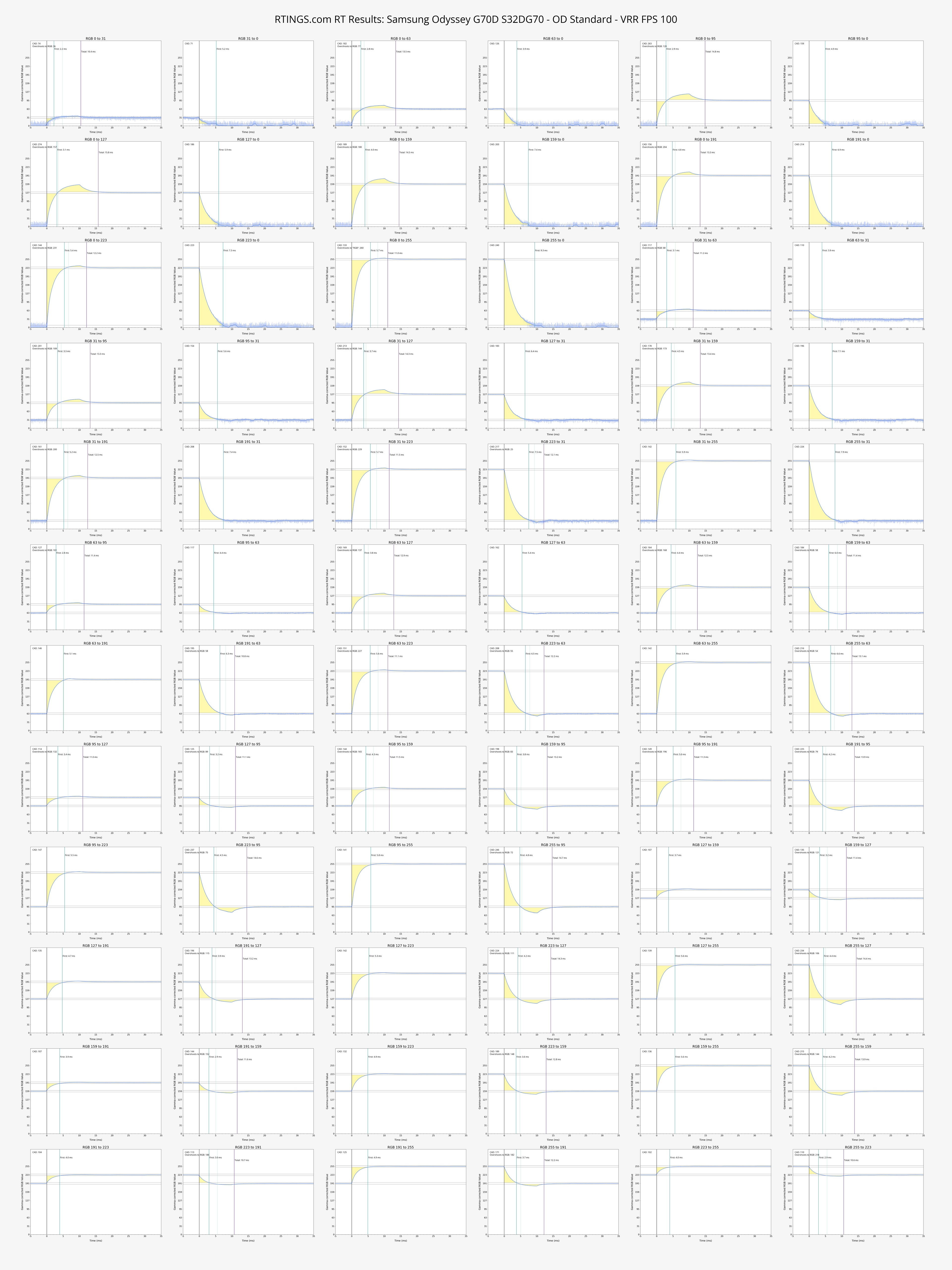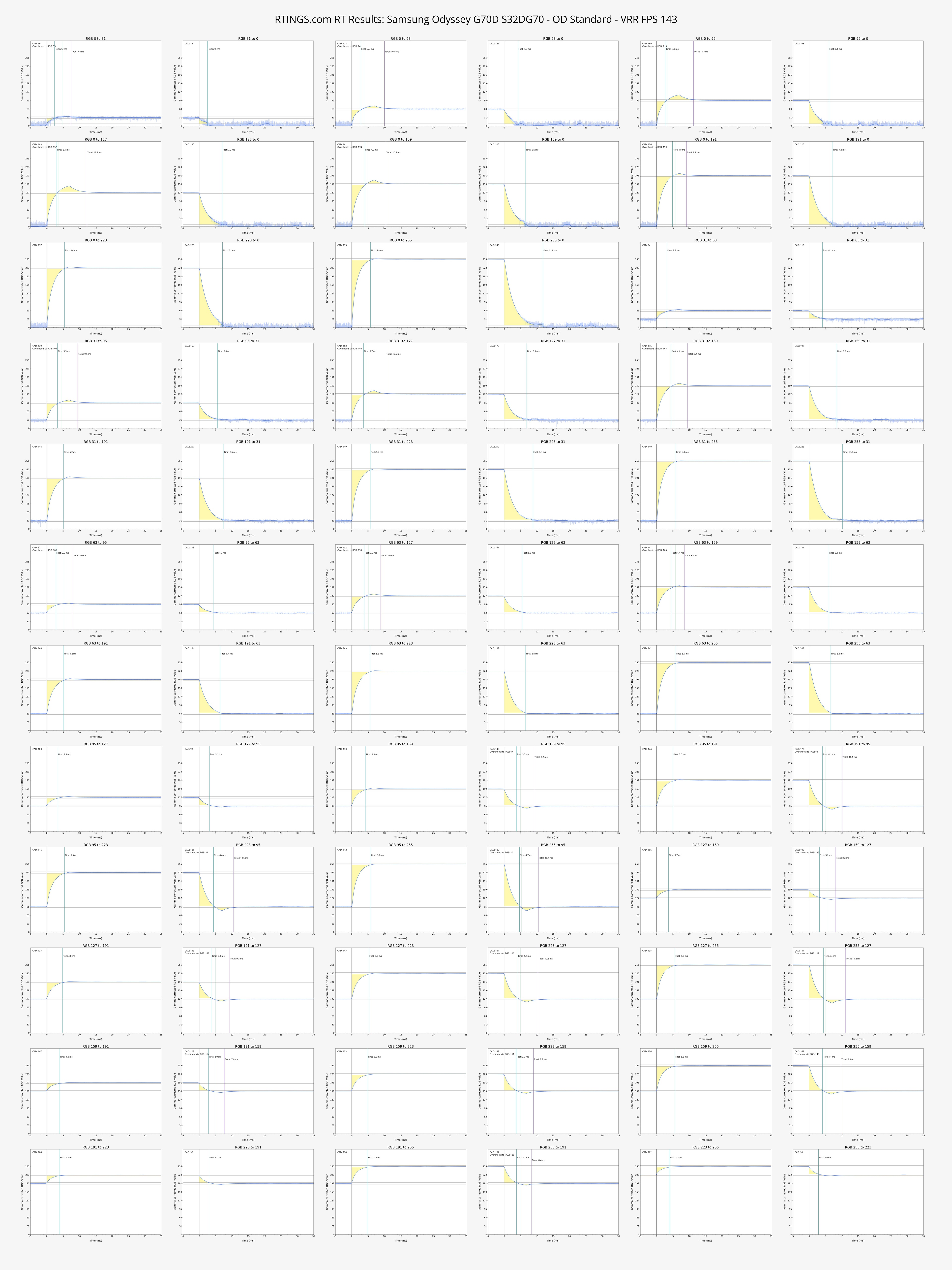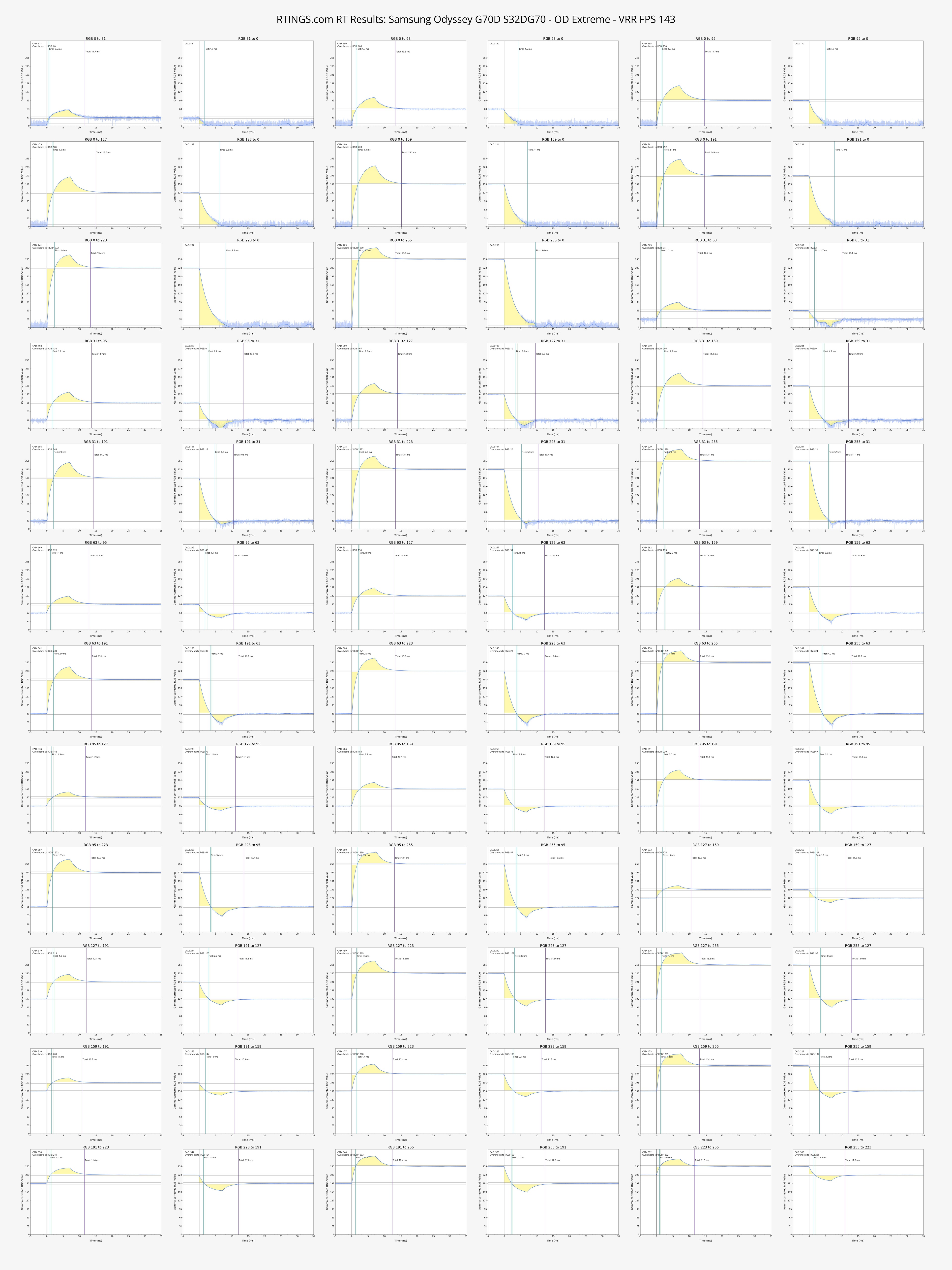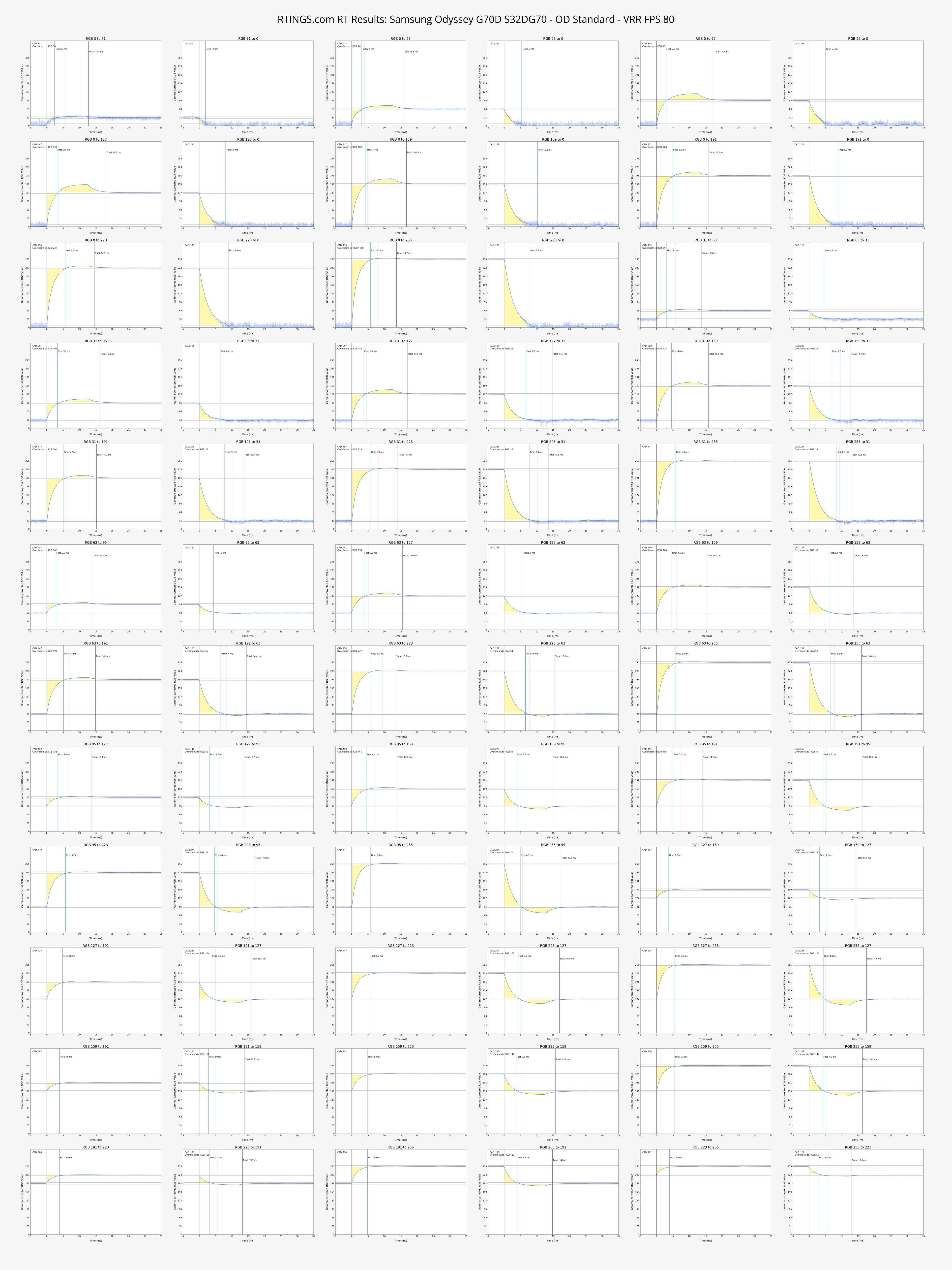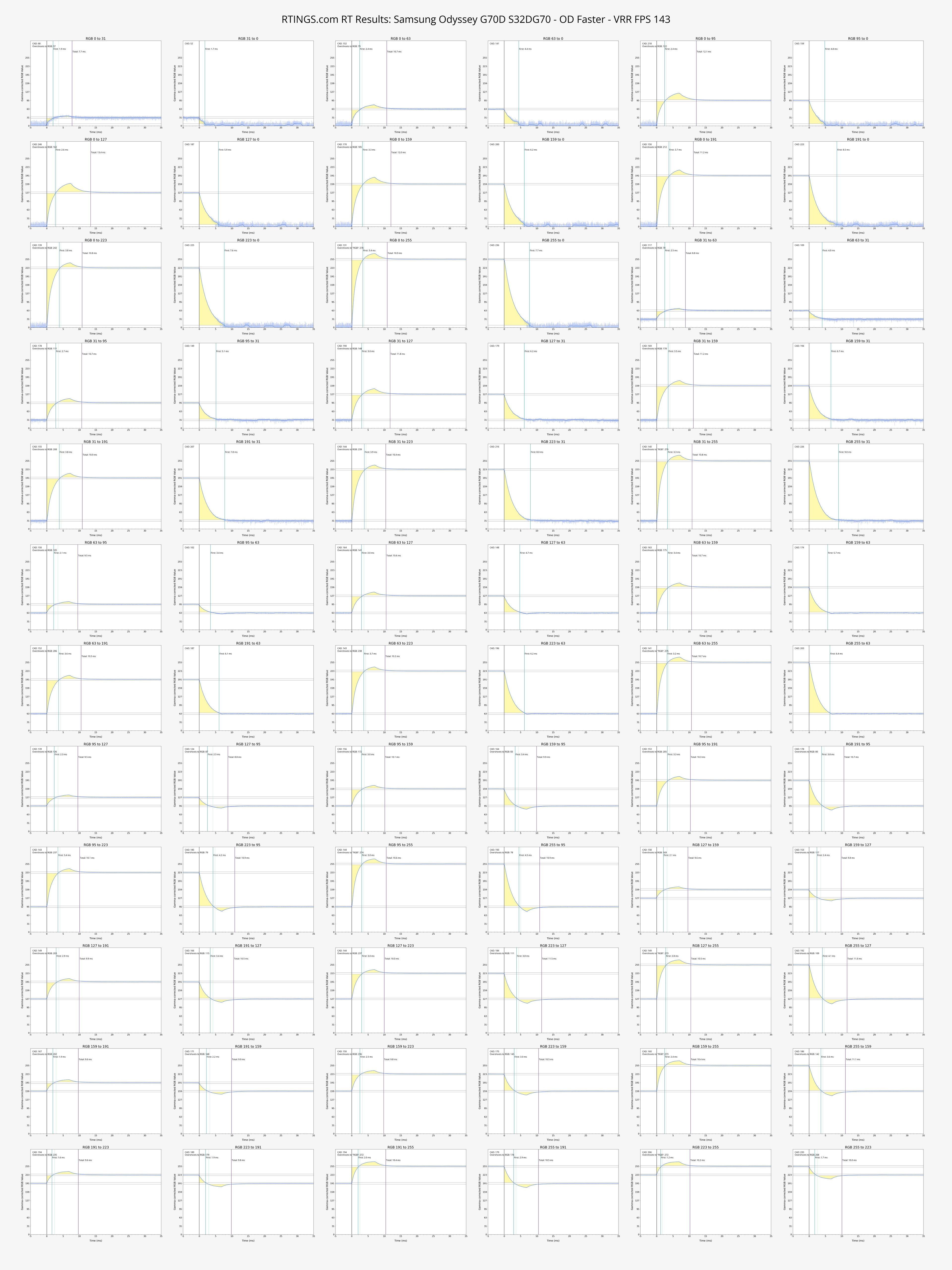 The Samsung Odyssey G70D S32DG70 has very good motion handling across its VRR range. The 'Standard' Response Time setting looks best at all refresh rates. While 'Faster' is just a bit worse, 'Extreme' is much blurrier, and in some places exceeds the limits of the graph. We've created an alternate graph at a different scale to illustrate how high the CAD gets.