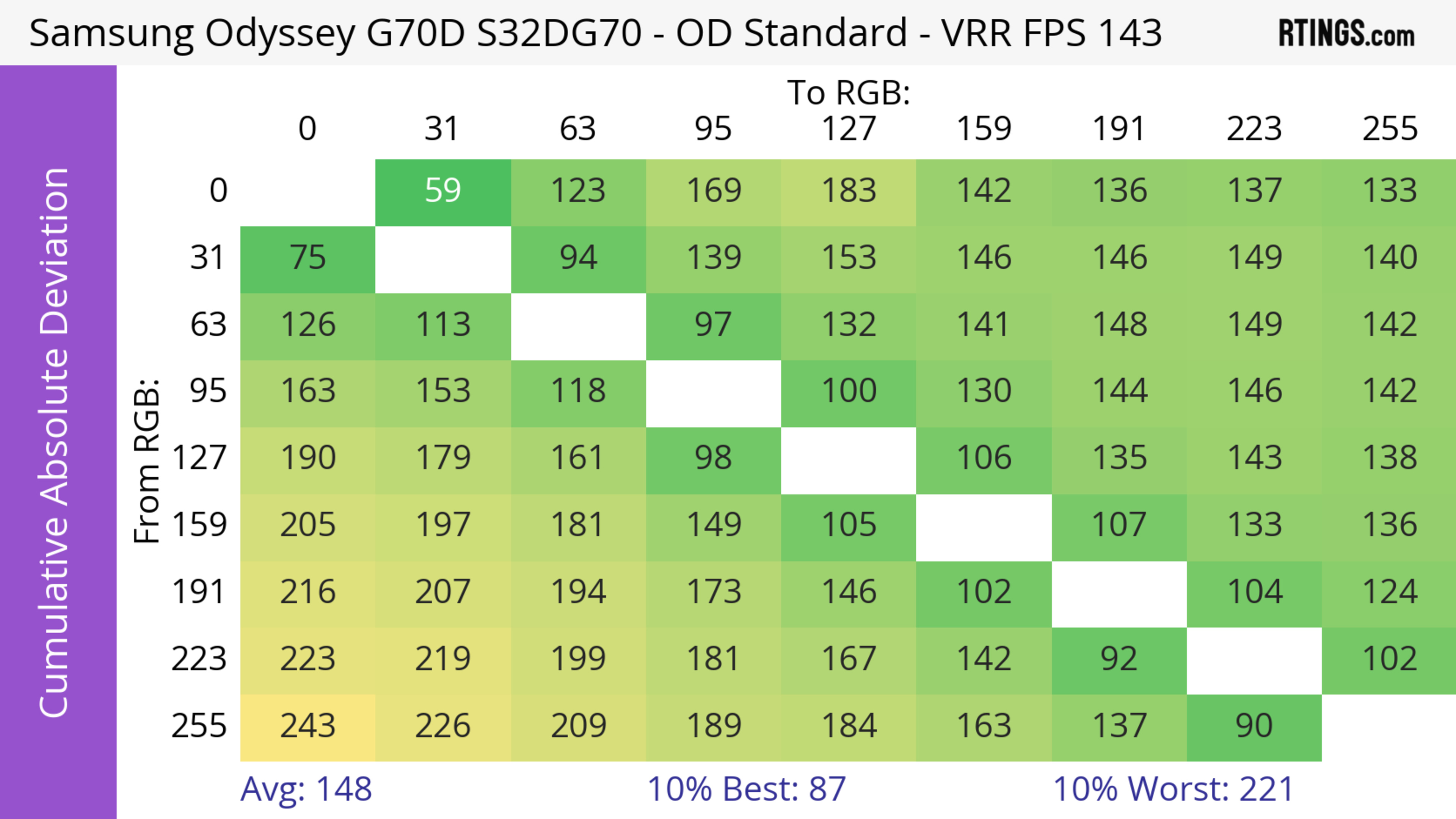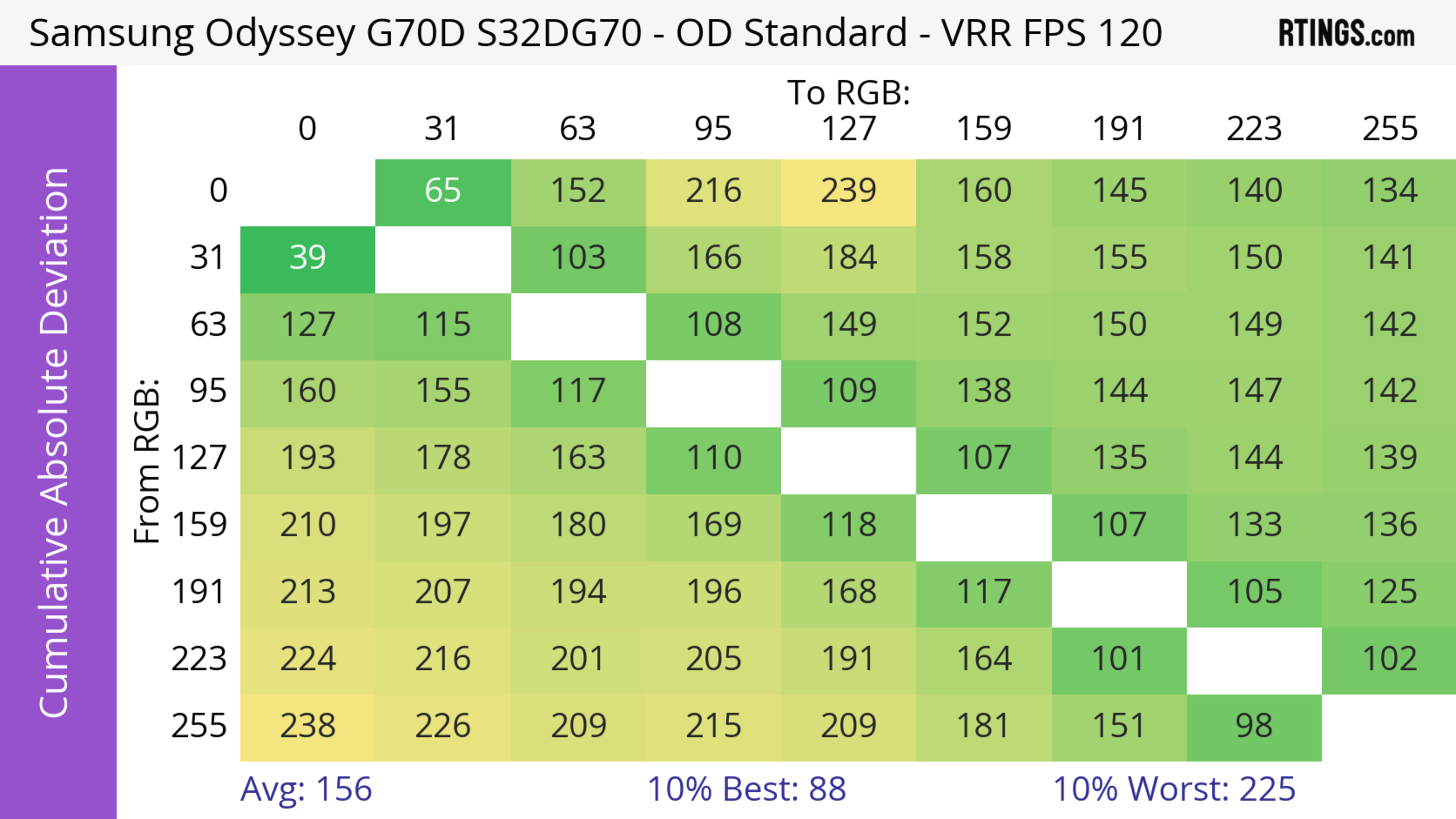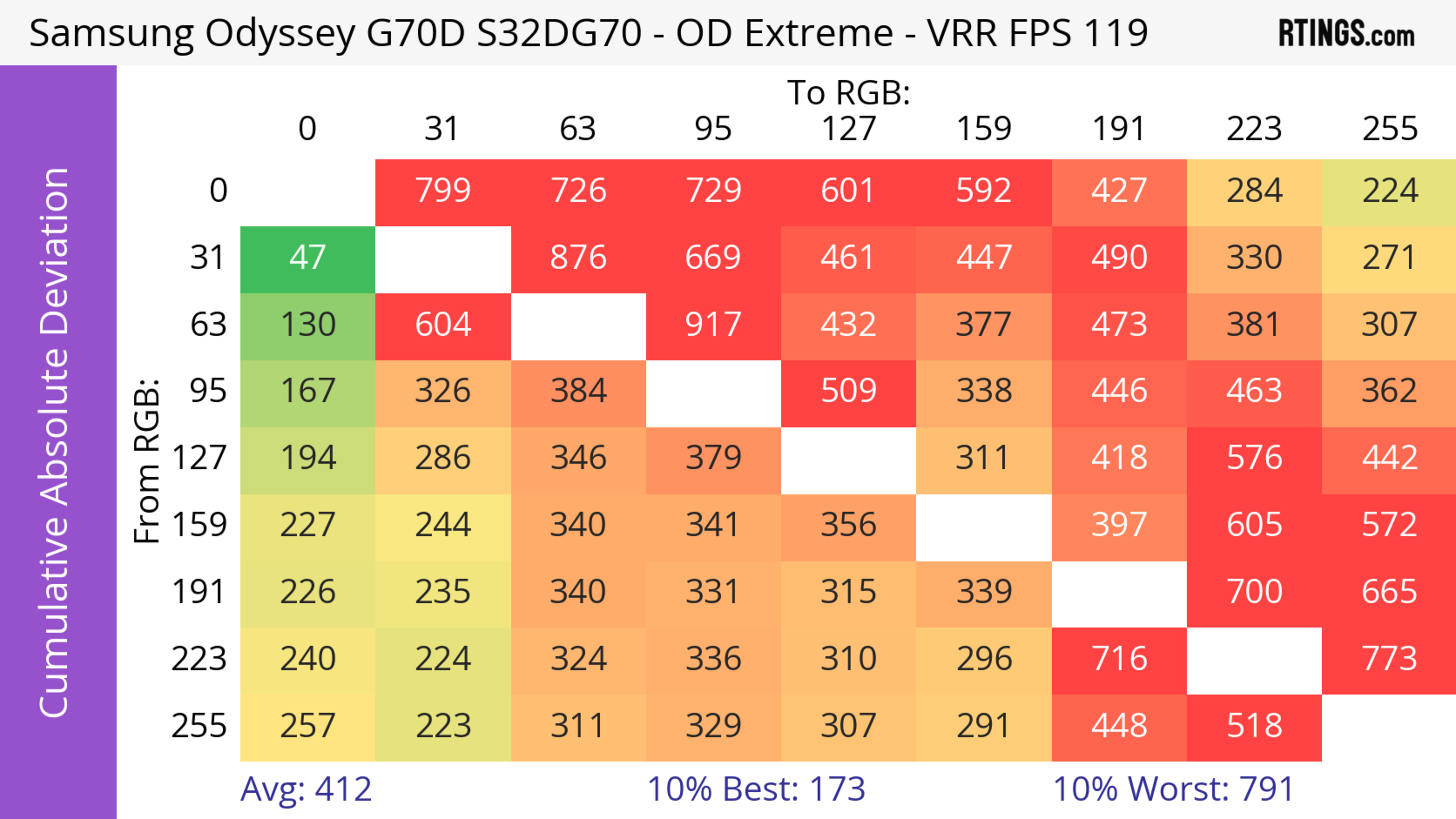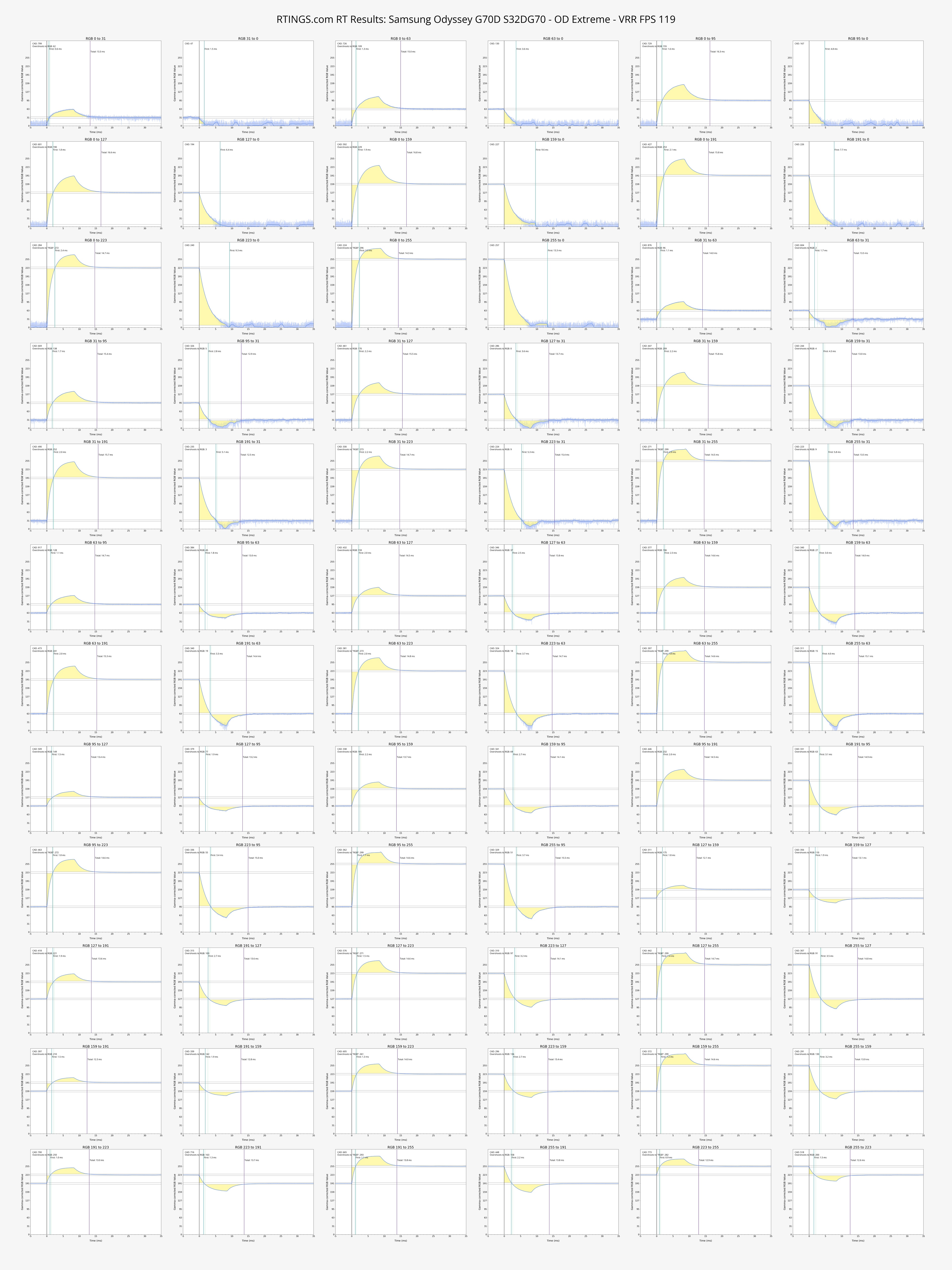 The Samsung Odyssey G70D S32DG70 has very good motion handling across its VRR range. The 'Standard' Response Time setting looks best at all refresh rates. While 'Faster' is just a bit worse, 'Extreme' is much blurrier, and in some places exceeds the limits of the graph. We've created an alternate graph at a different scale to illustrate how high the CAD gets.