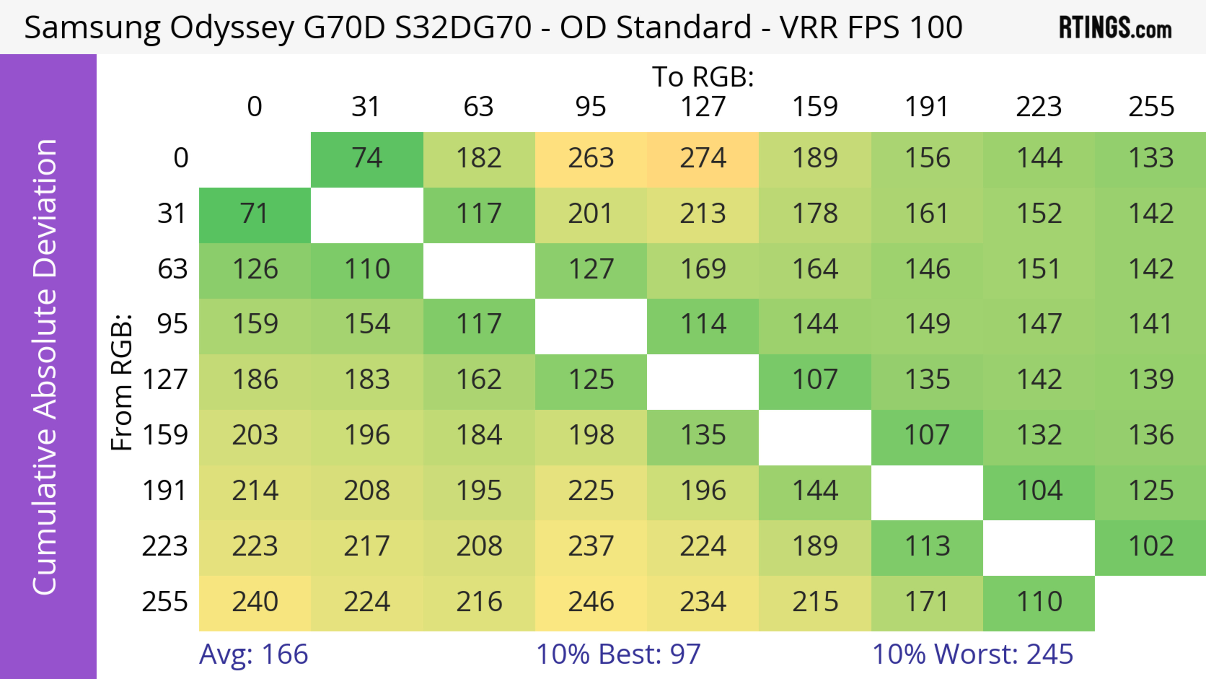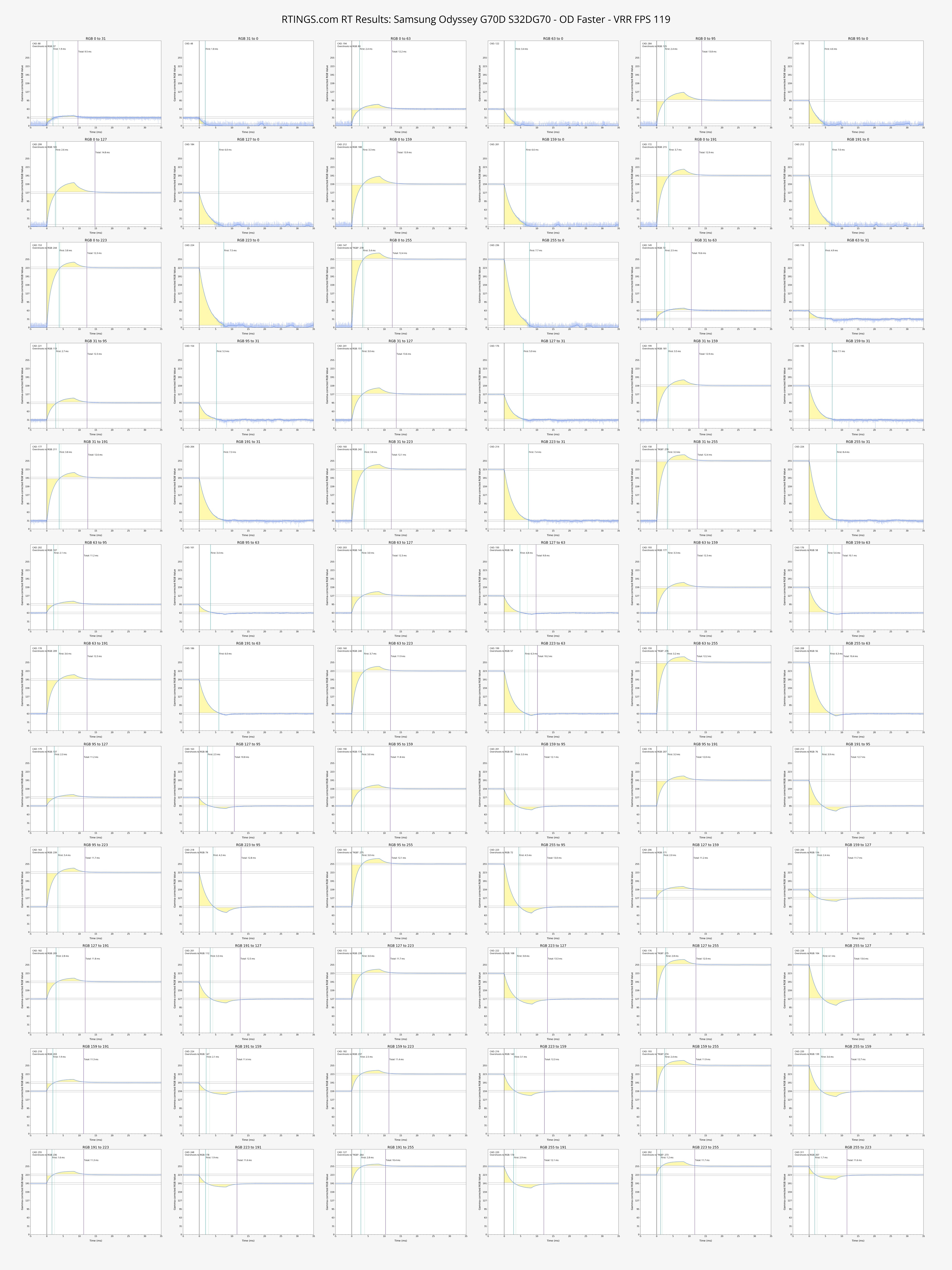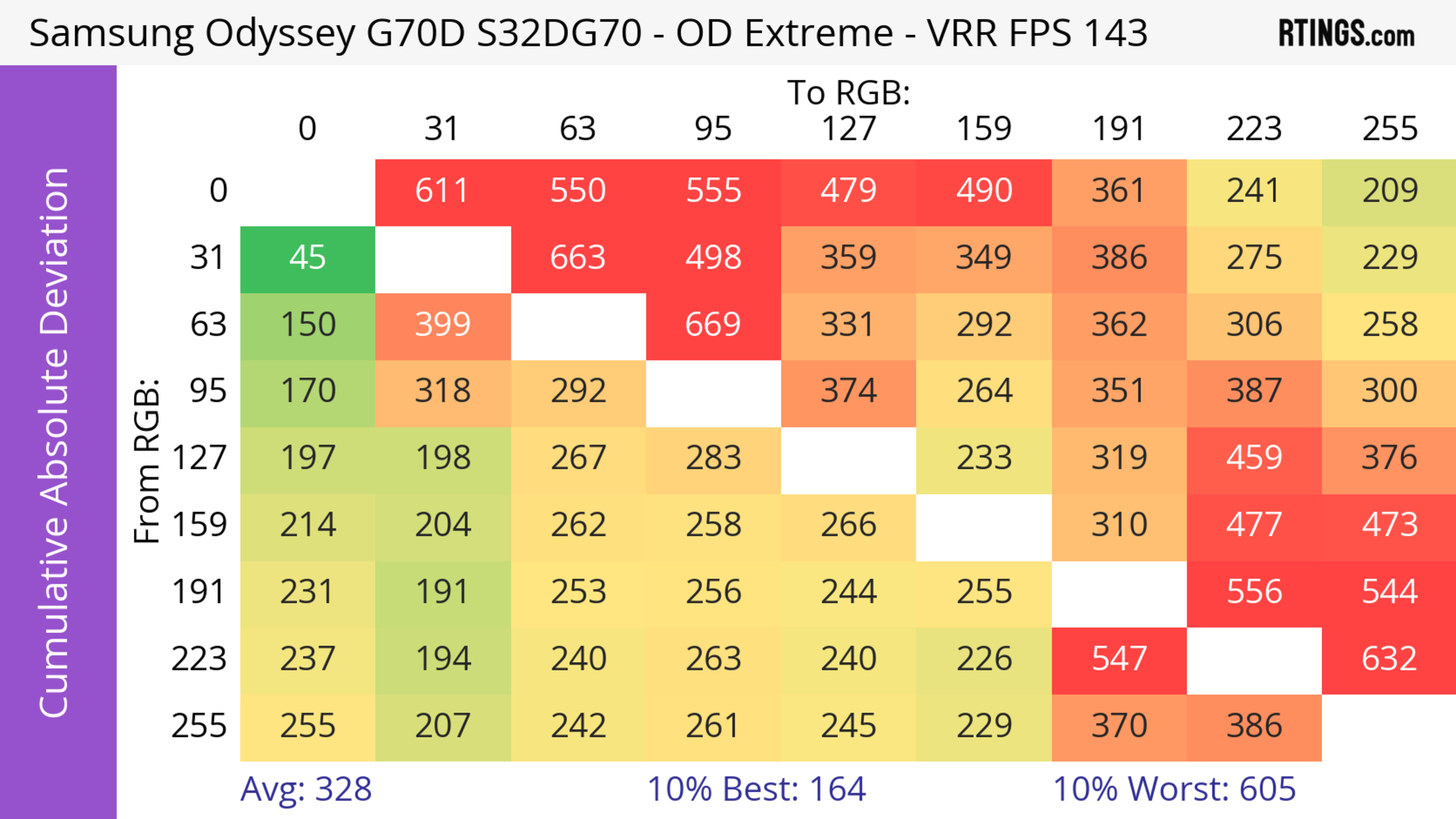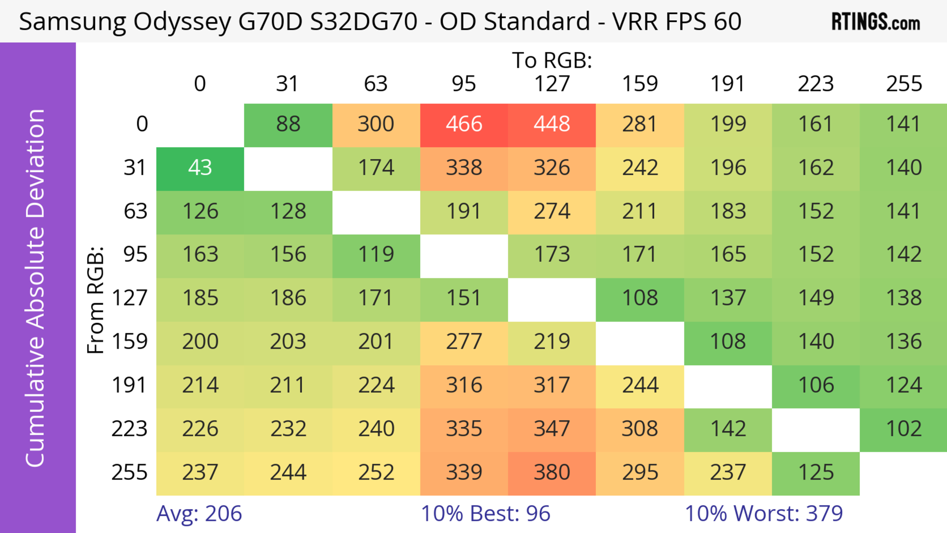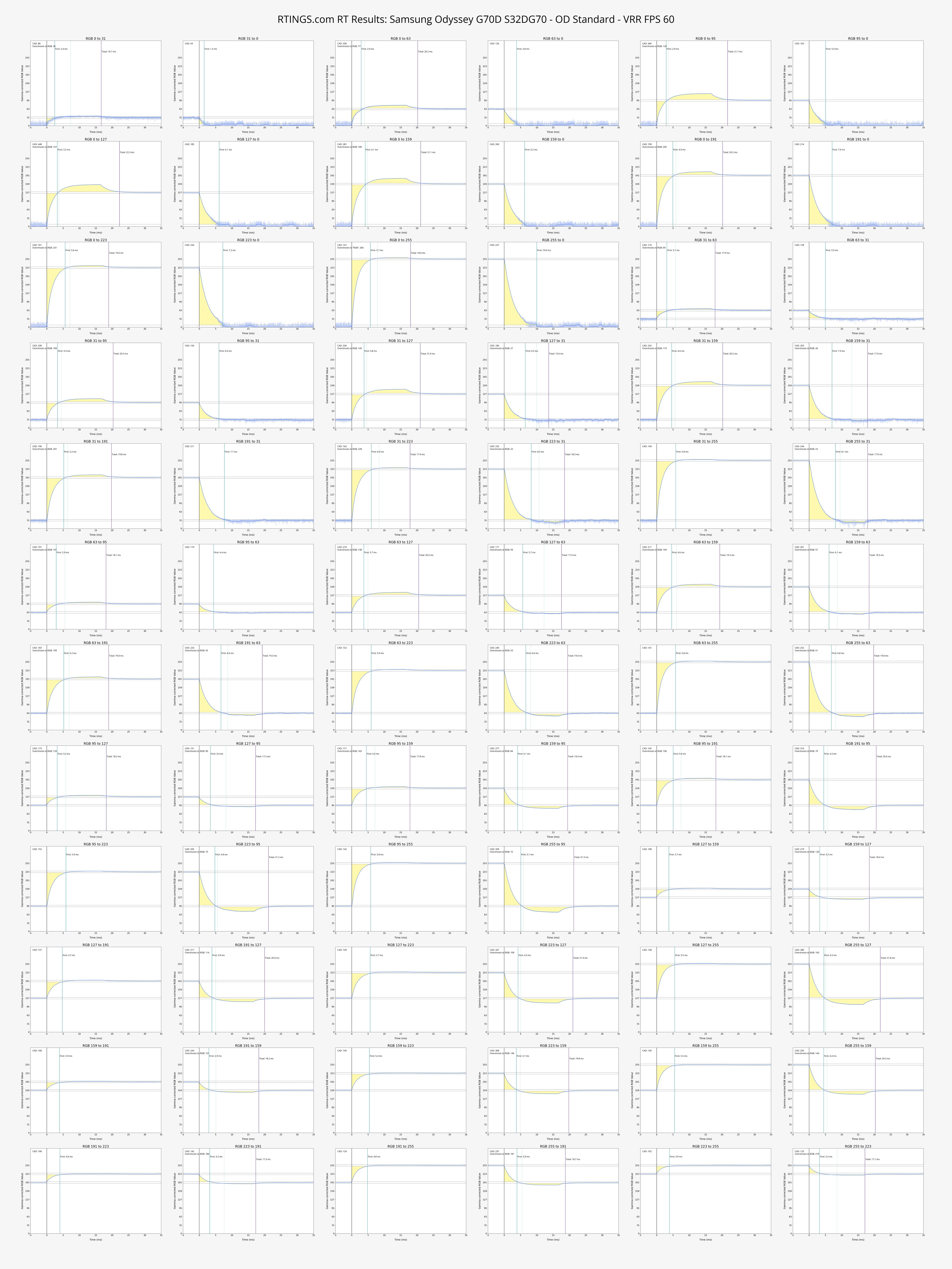 The Samsung Odyssey G70D S32DG70 has very good motion handling across its VRR range. The 'Standard' Response Time setting looks best at all refresh rates. While 'Faster' is just a bit worse, 'Extreme' is much blurrier, and in some places exceeds the limits of the graph. We've created an alternate graph at a different scale to illustrate how high the CAD gets.