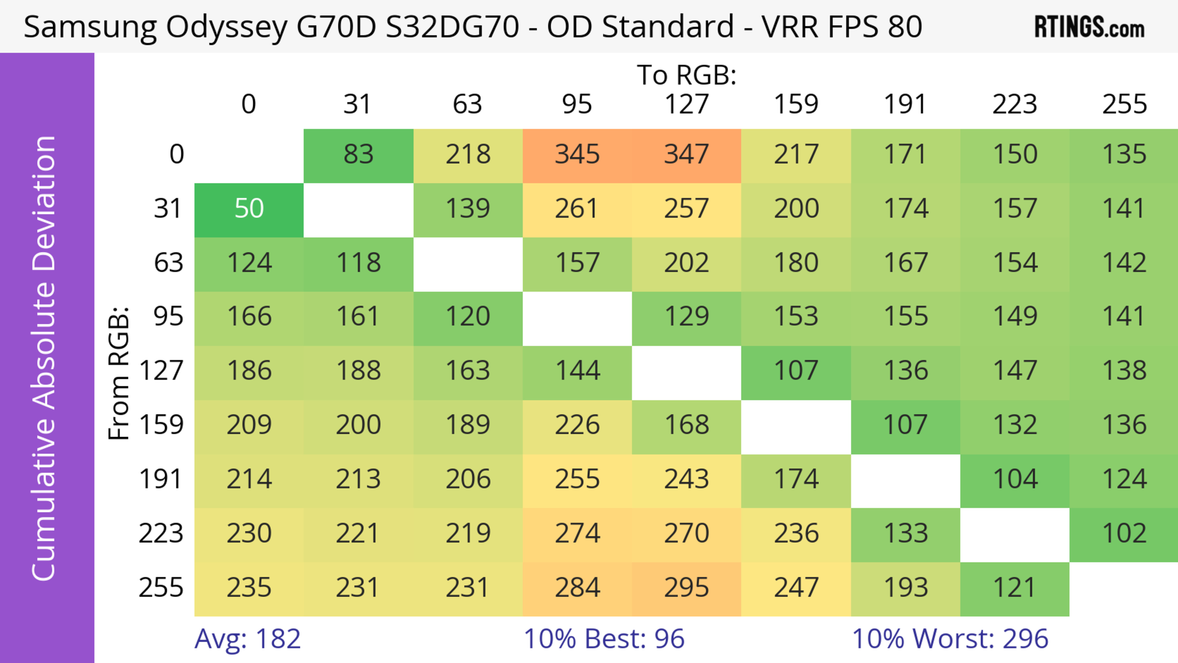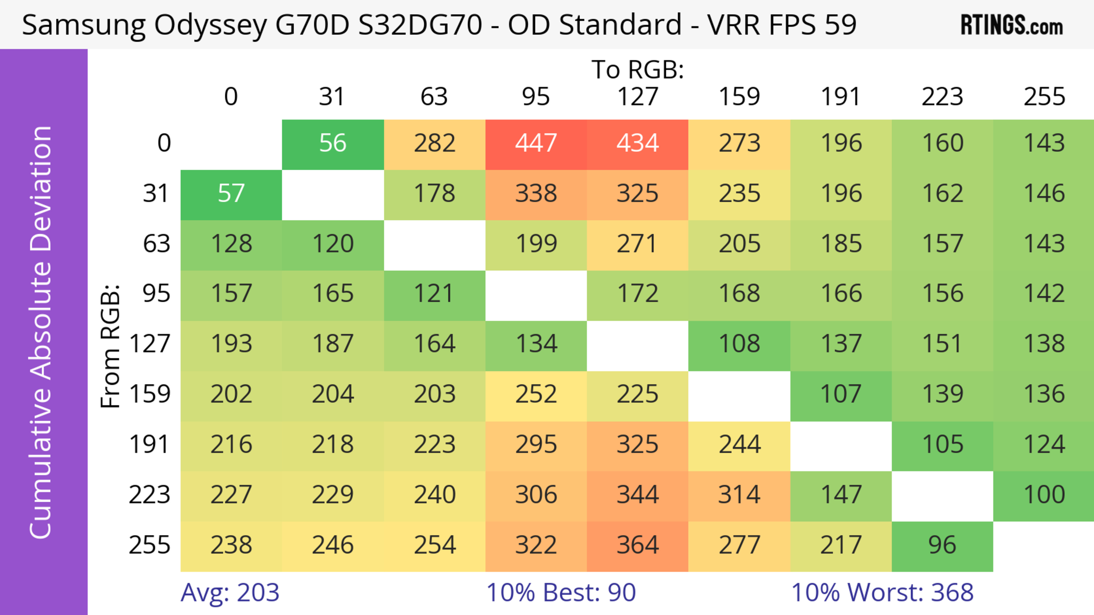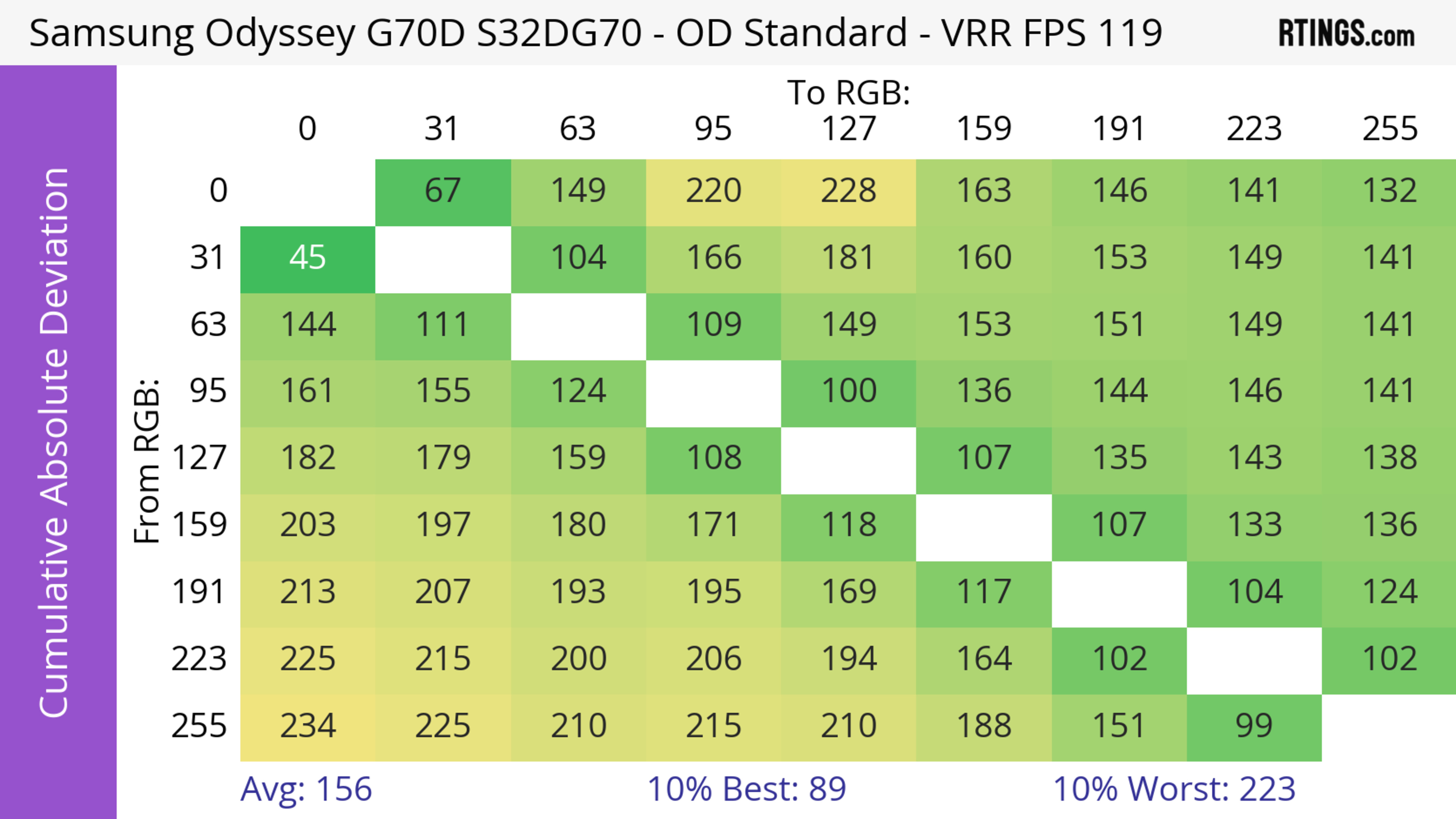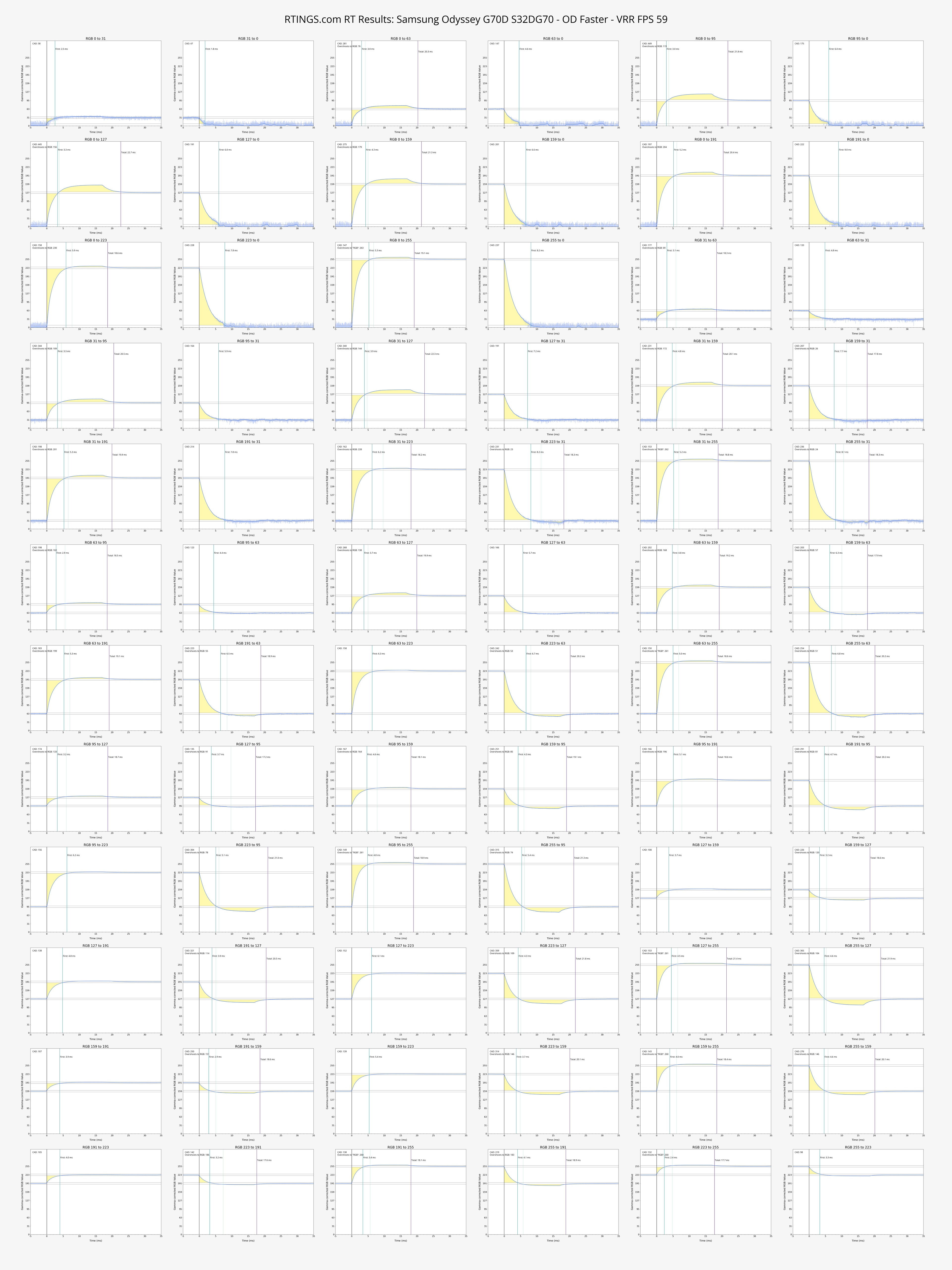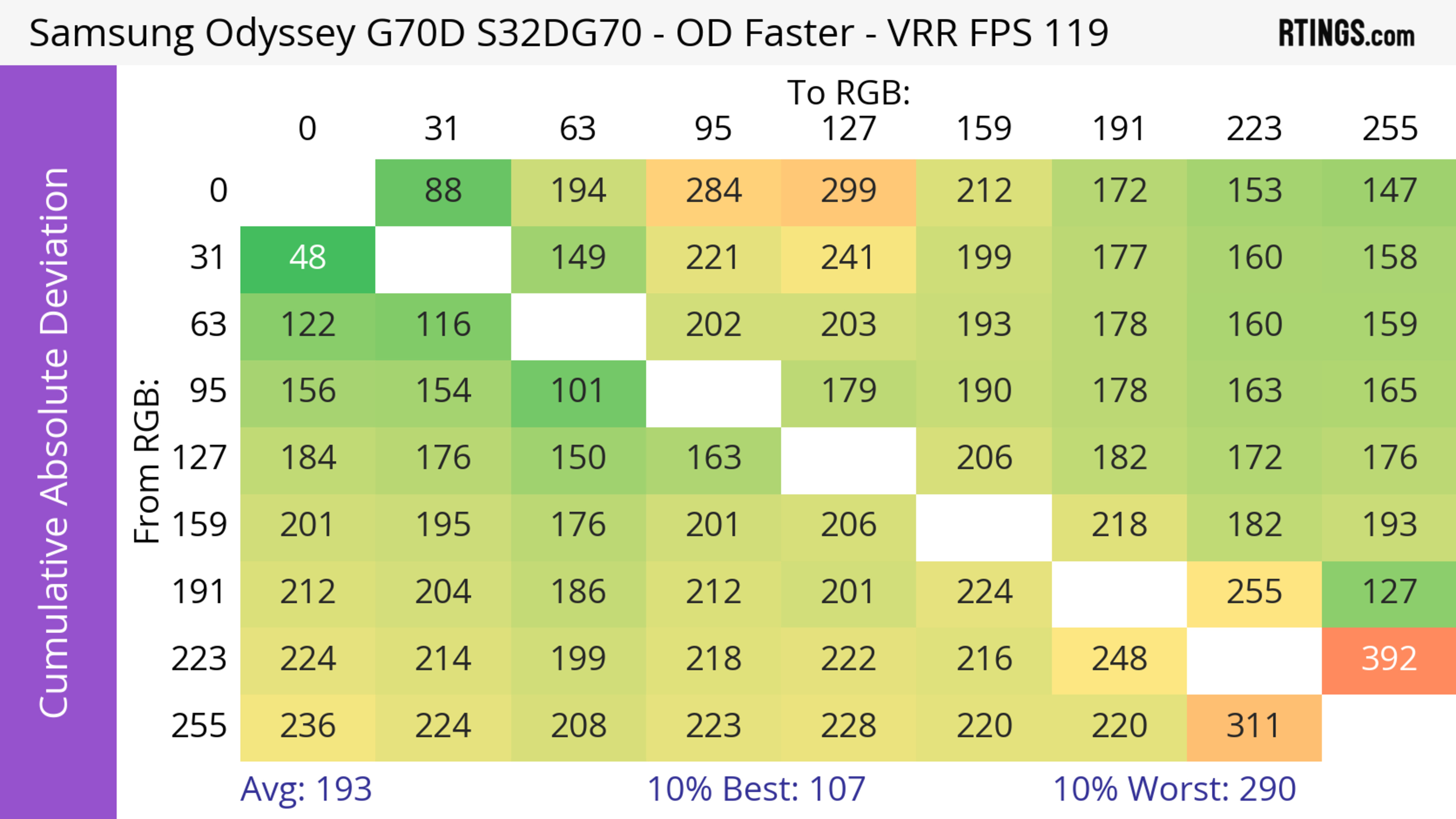 The Samsung Odyssey G70D S32DG70 has very good motion handling across its VRR range. The 'Standard' Response Time setting looks best at all refresh rates. While 'Faster' is just a bit worse, 'Extreme' is much blurrier, and in some places exceeds the limits of the graph. We've created an alternate graph at a different scale to illustrate how high the CAD gets.