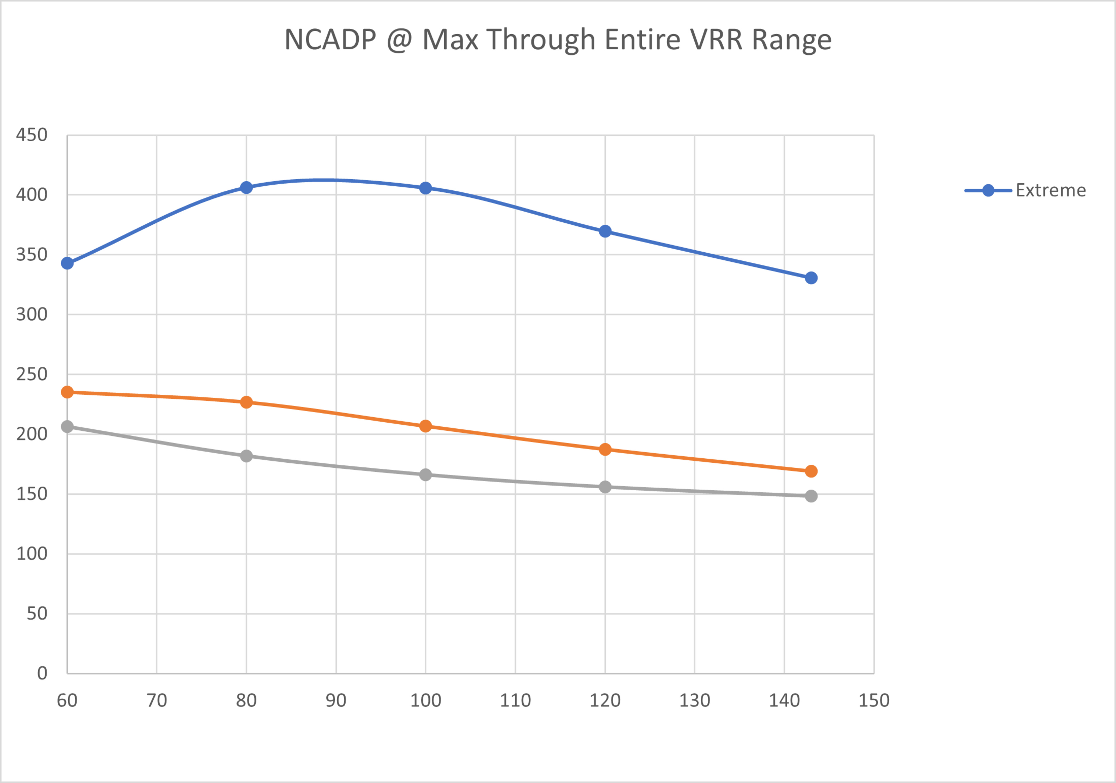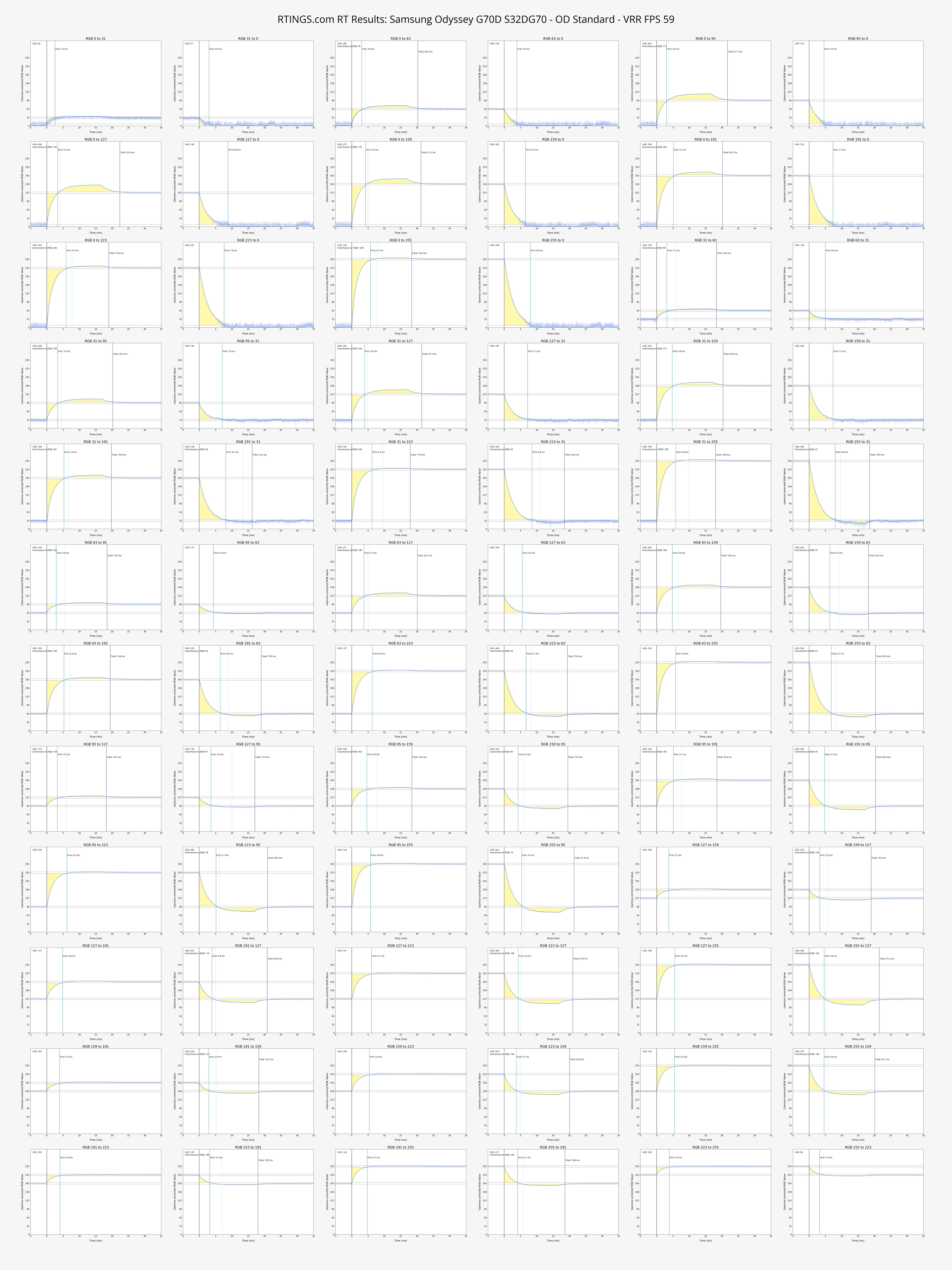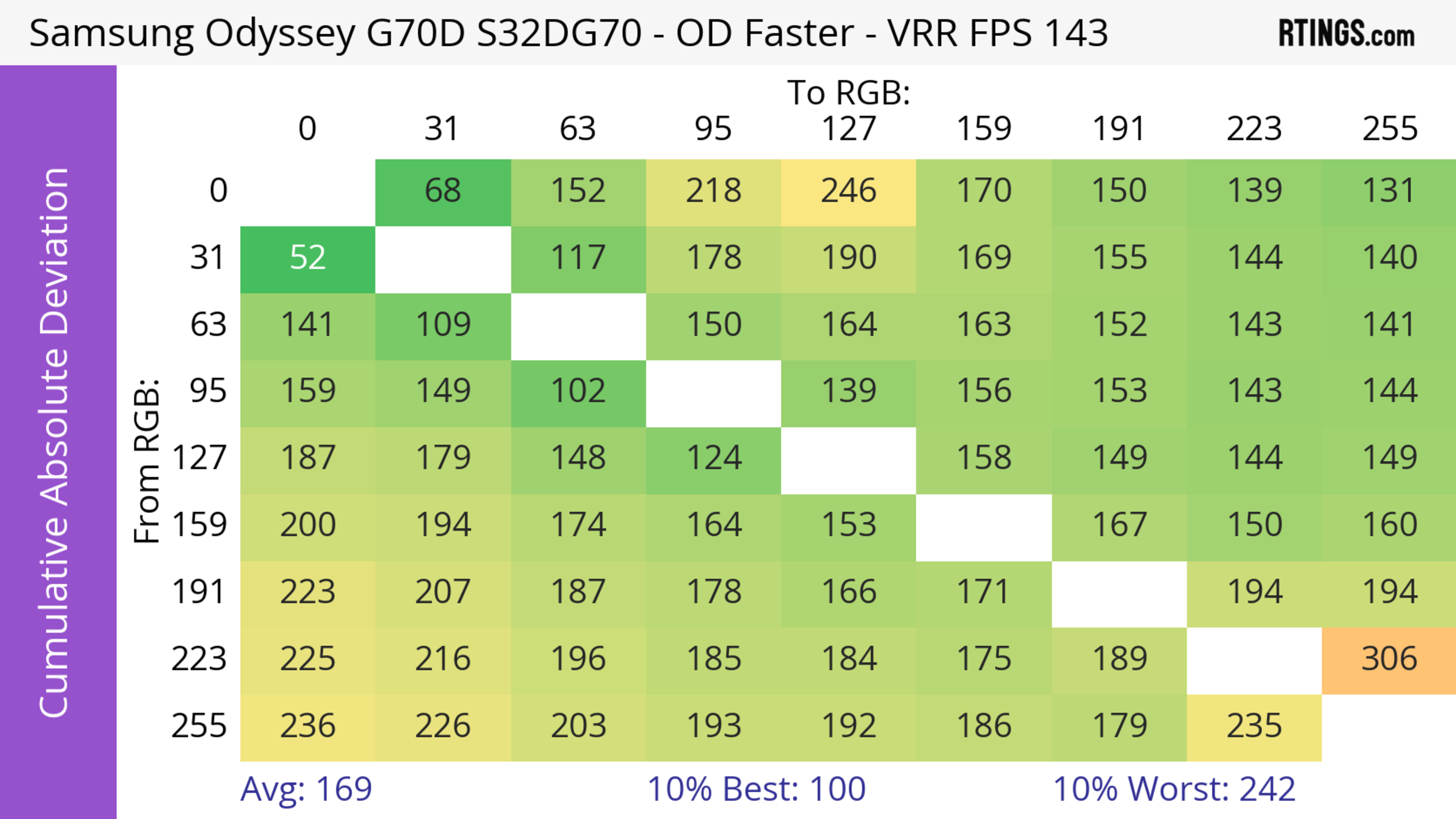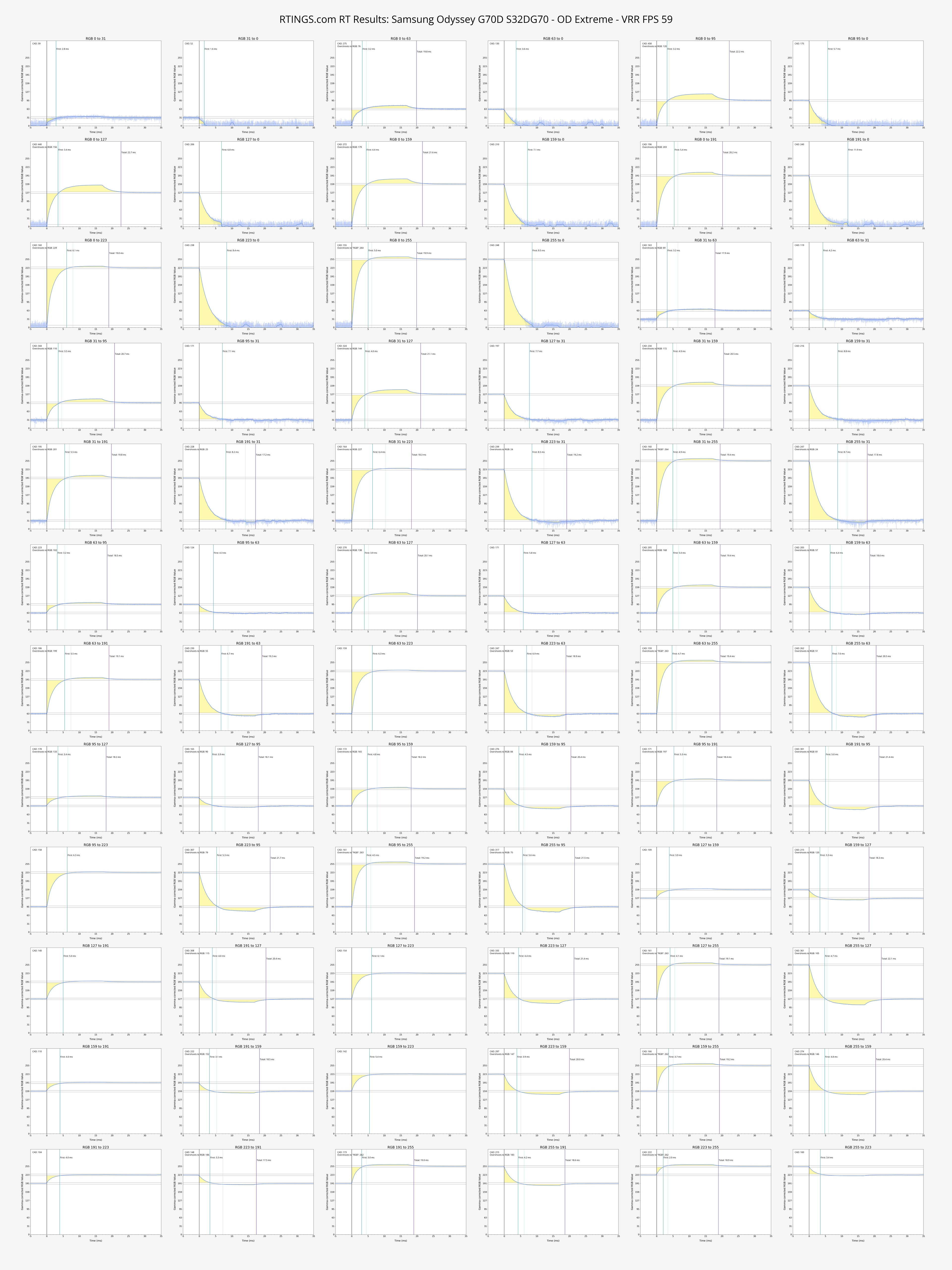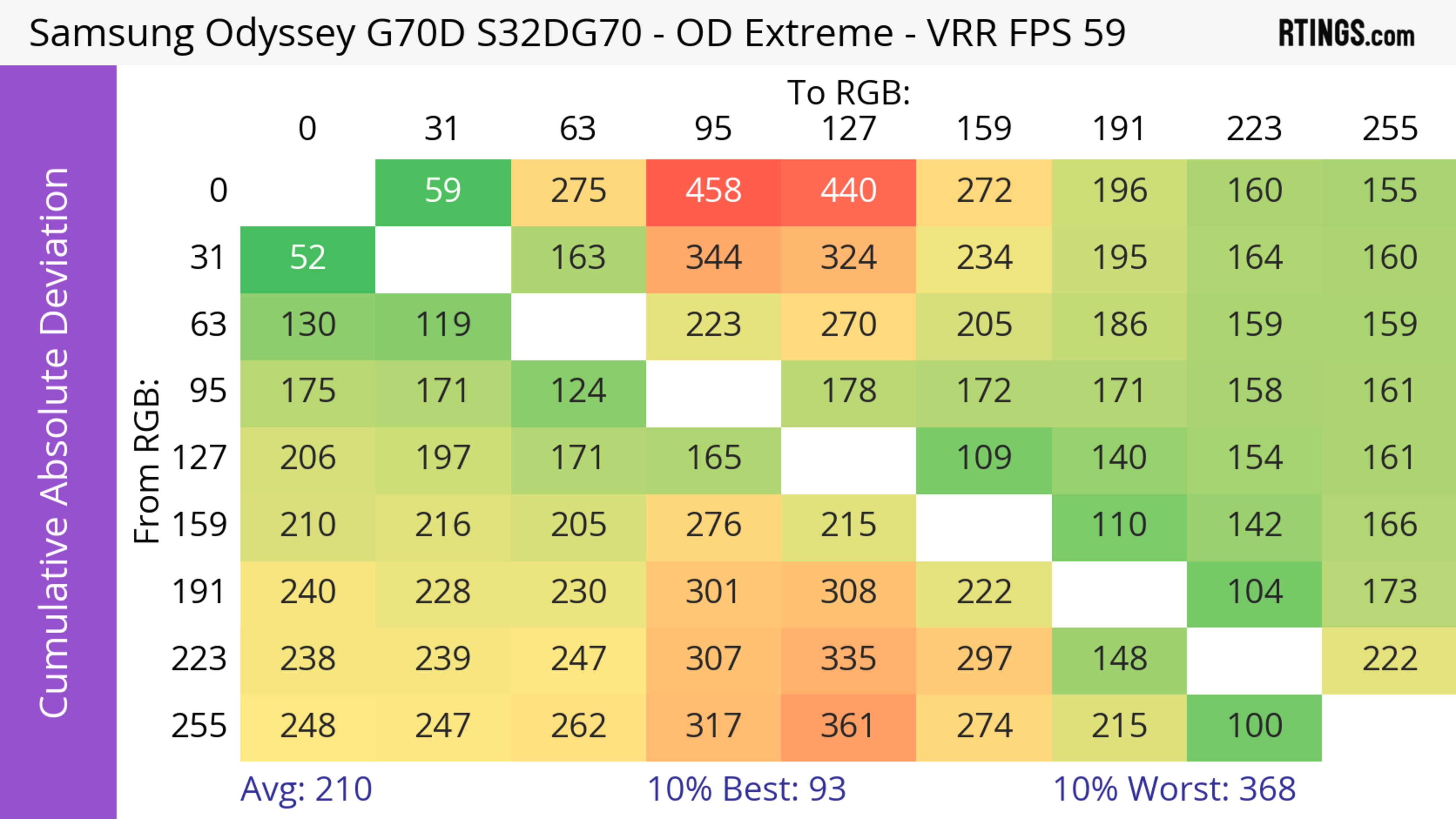 The Samsung Odyssey G70D S32DG70 has very good motion handling across its VRR range. The 'Standard' Response Time setting looks best at all refresh rates. While 'Faster' is just a bit worse, 'Extreme' is much blurrier, and in some places exceeds the limits of the graph. We've created an alternate graph at a different scale to illustrate how high the CAD gets.