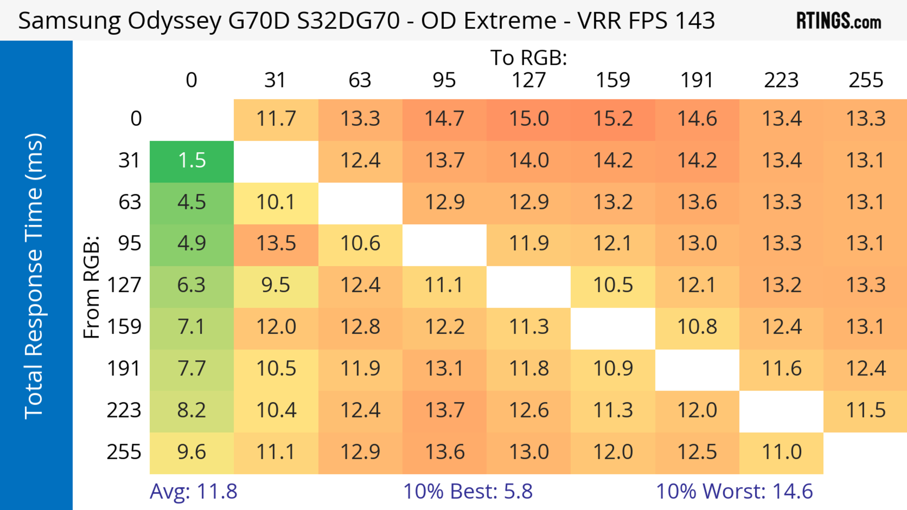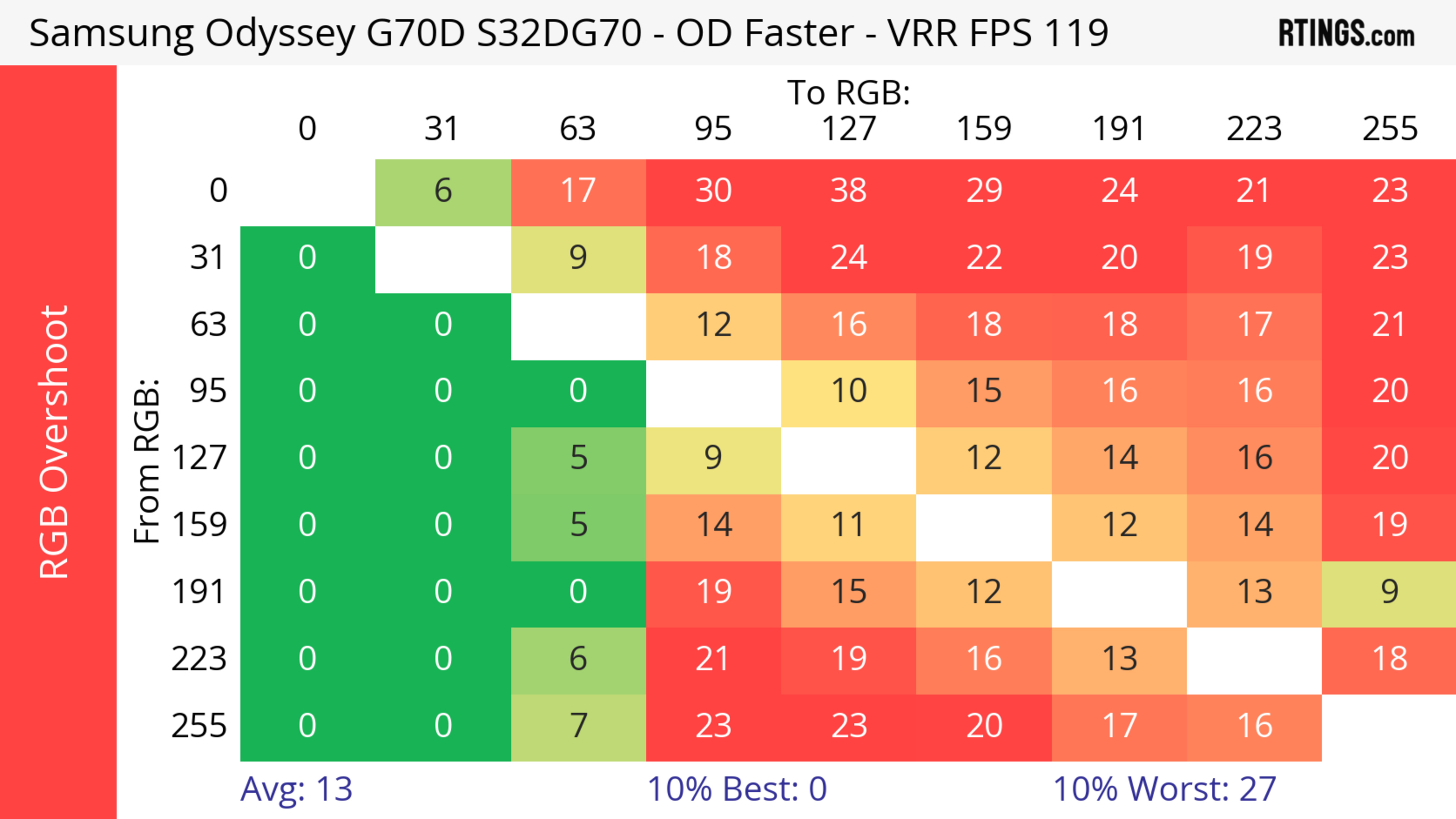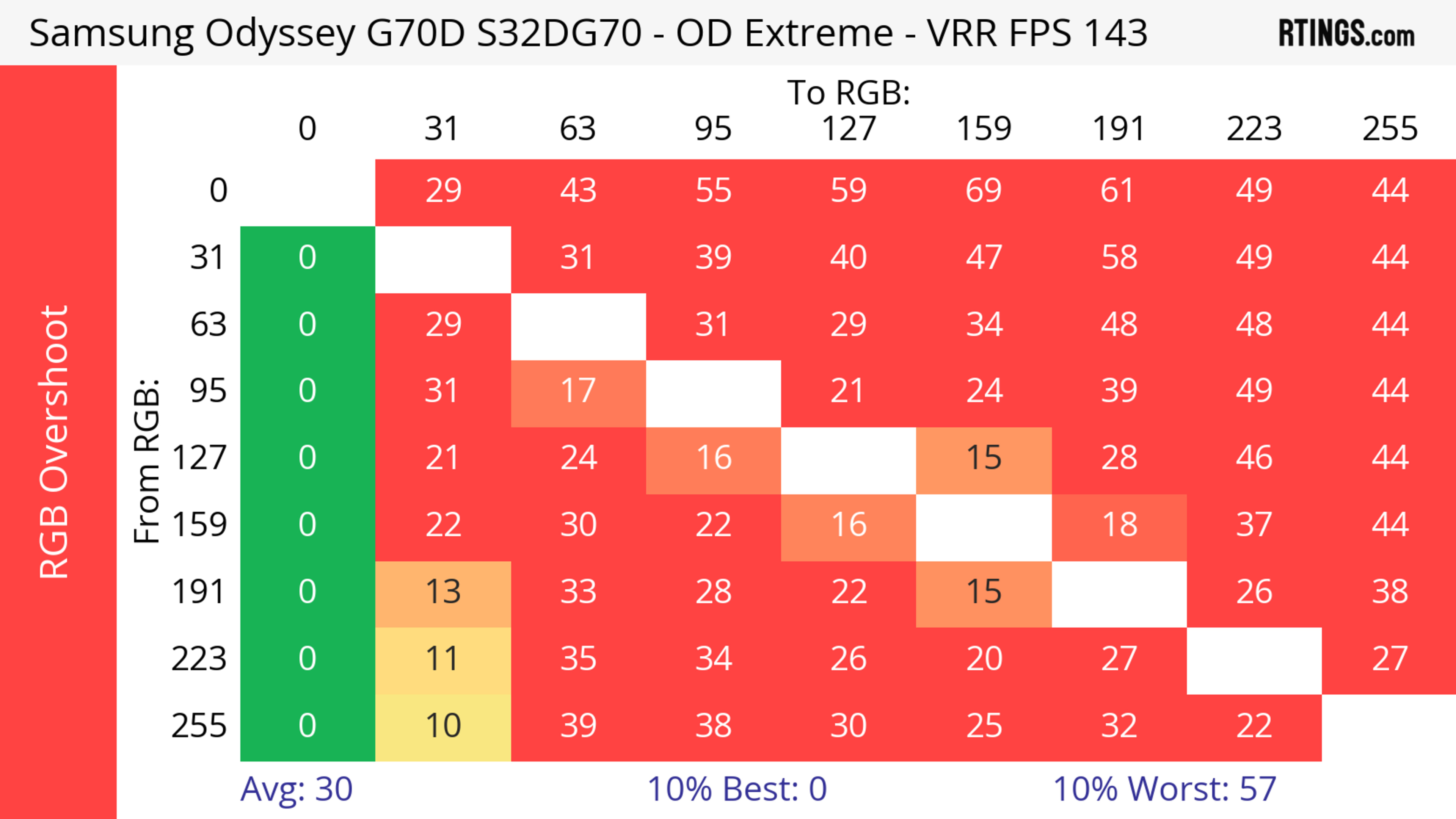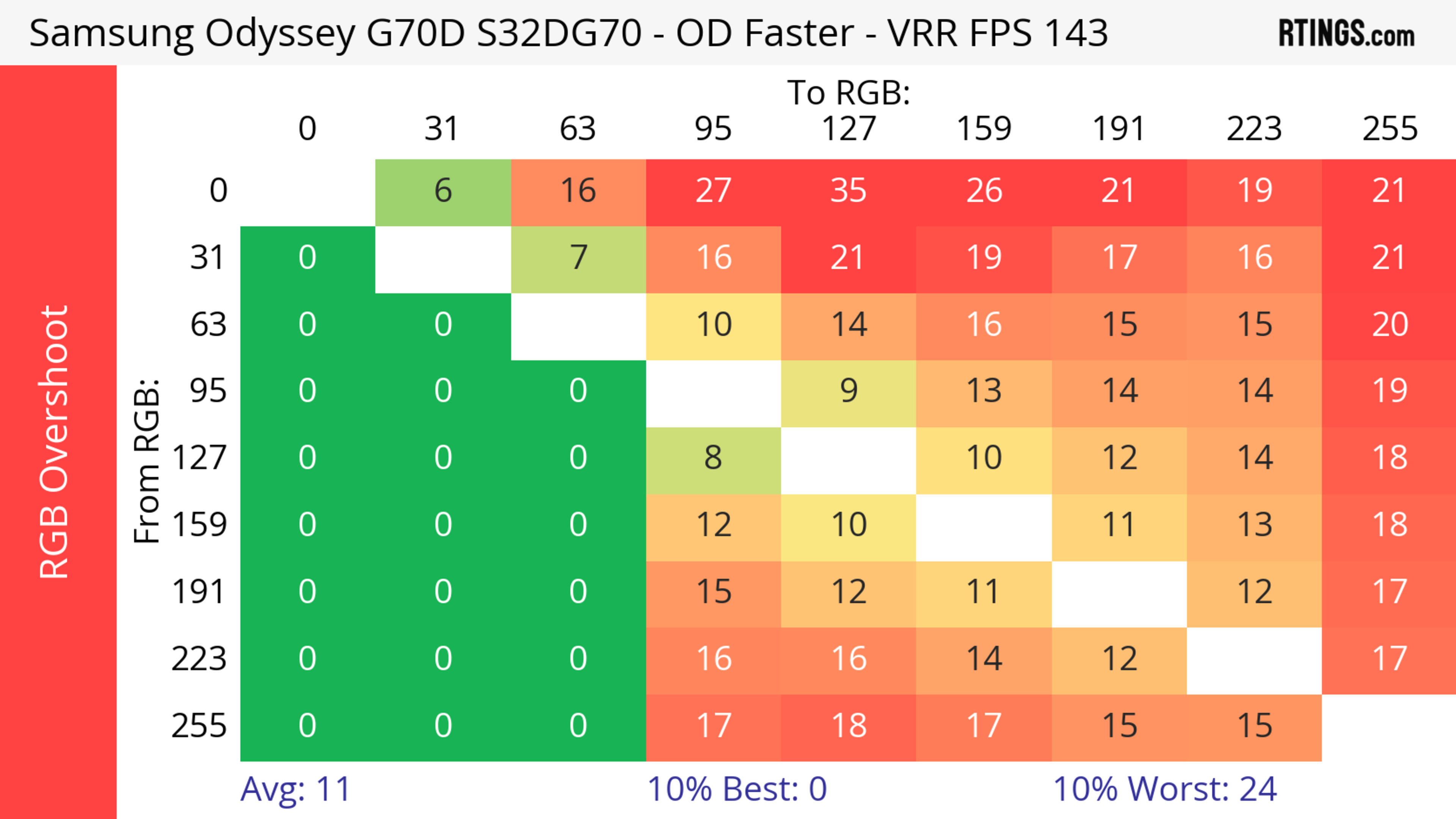 The Samsung Odyssey G70D S32DG70 has very good motion handling across its VRR range. The 'Standard' Response Time setting looks best at all refresh rates. While 'Faster' is just a bit worse, 'Extreme' is much blurrier, and in some places exceeds the limits of the graph. We've created an alternate graph at a different scale to illustrate how high the CAD gets.