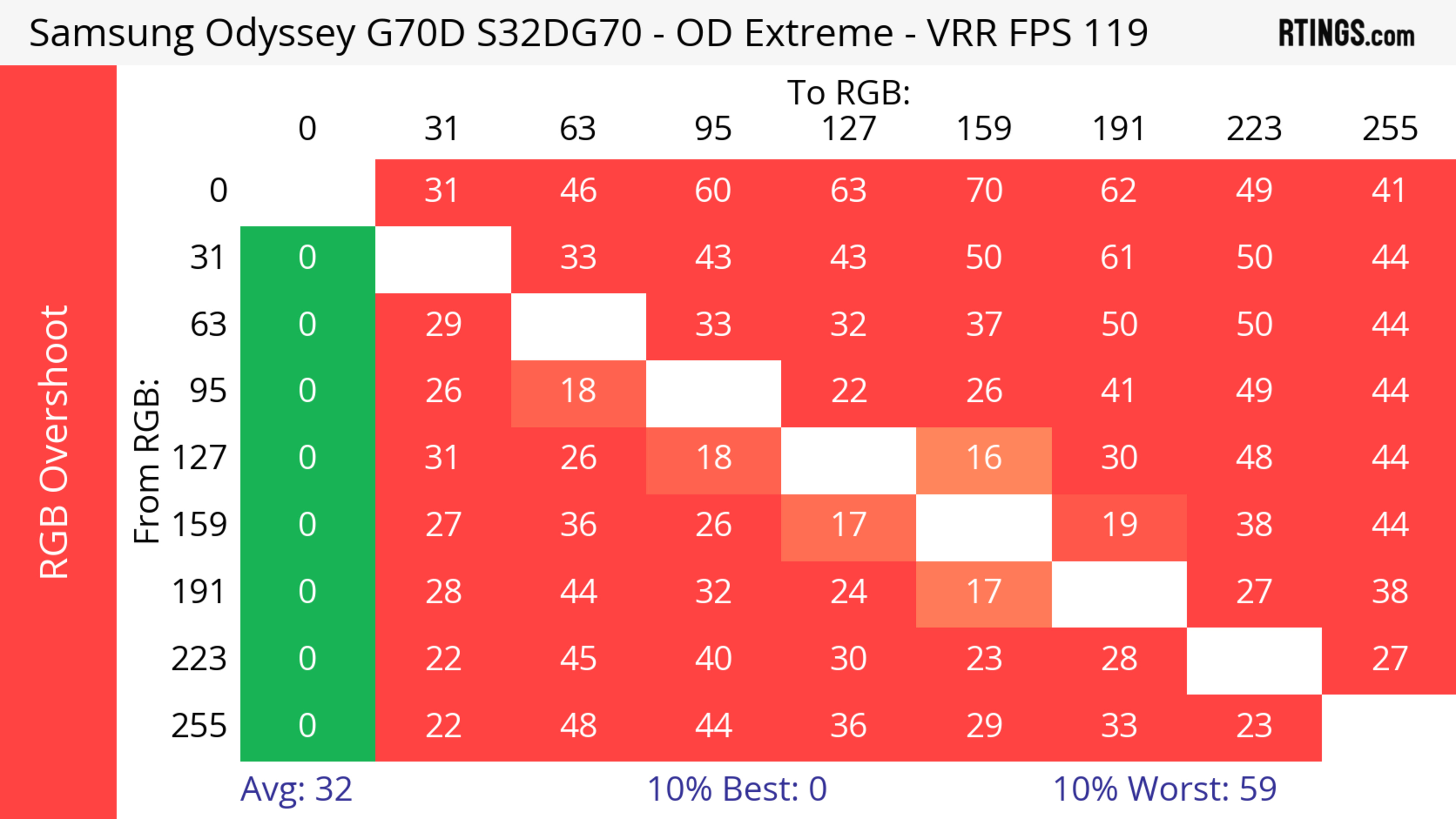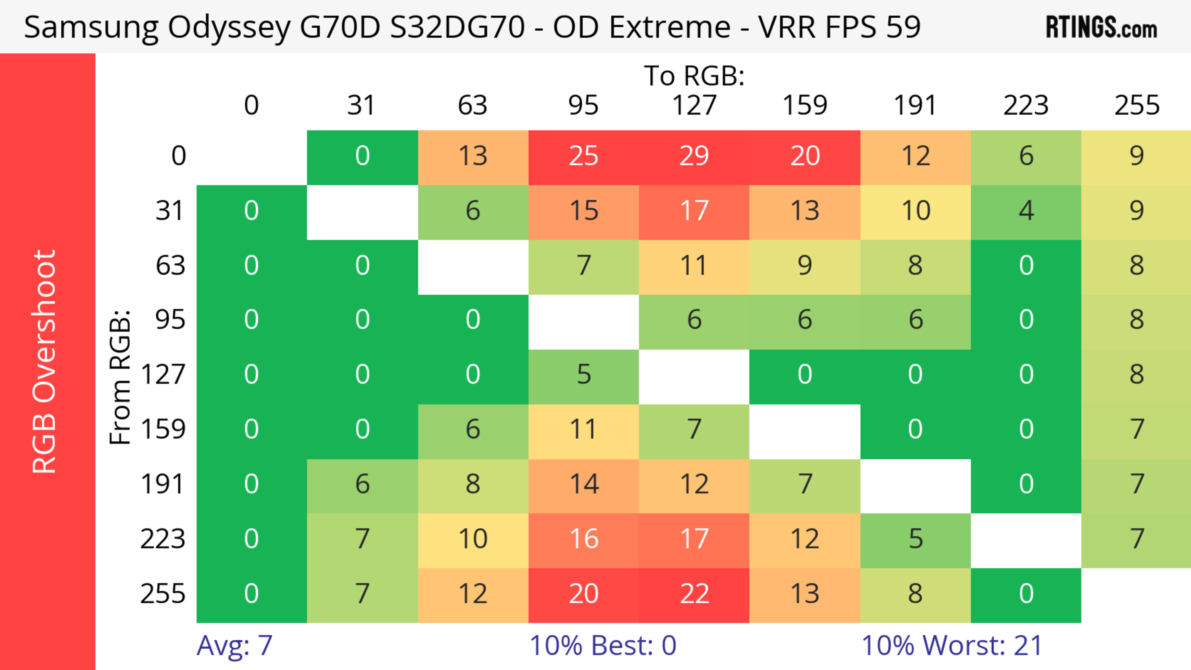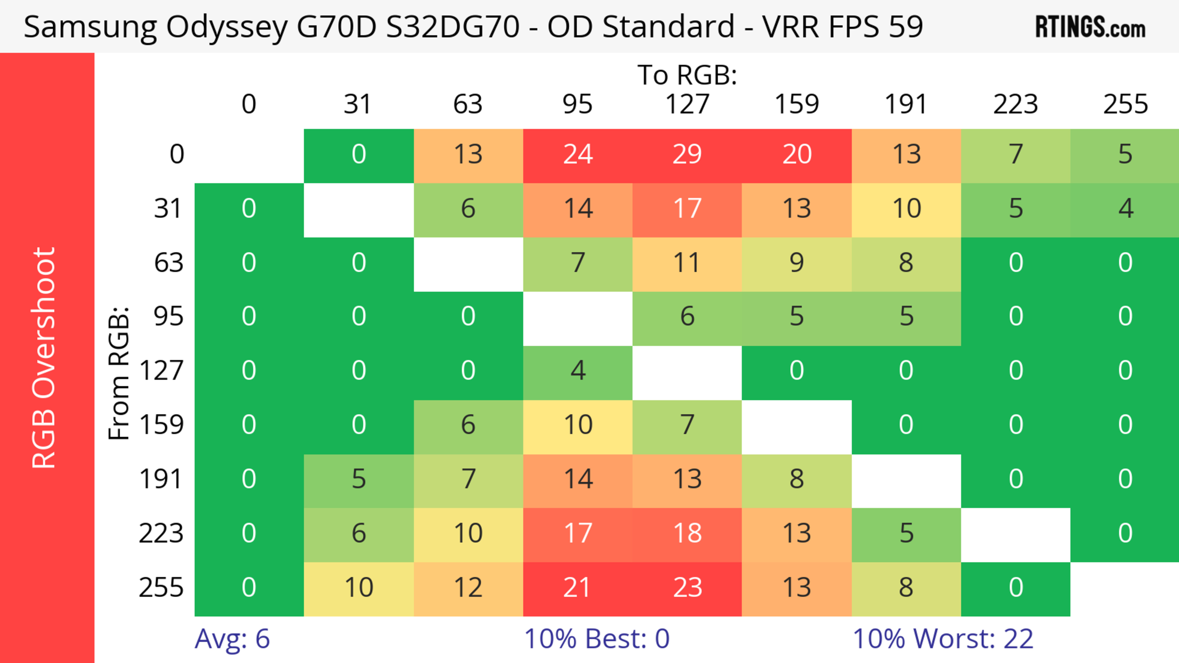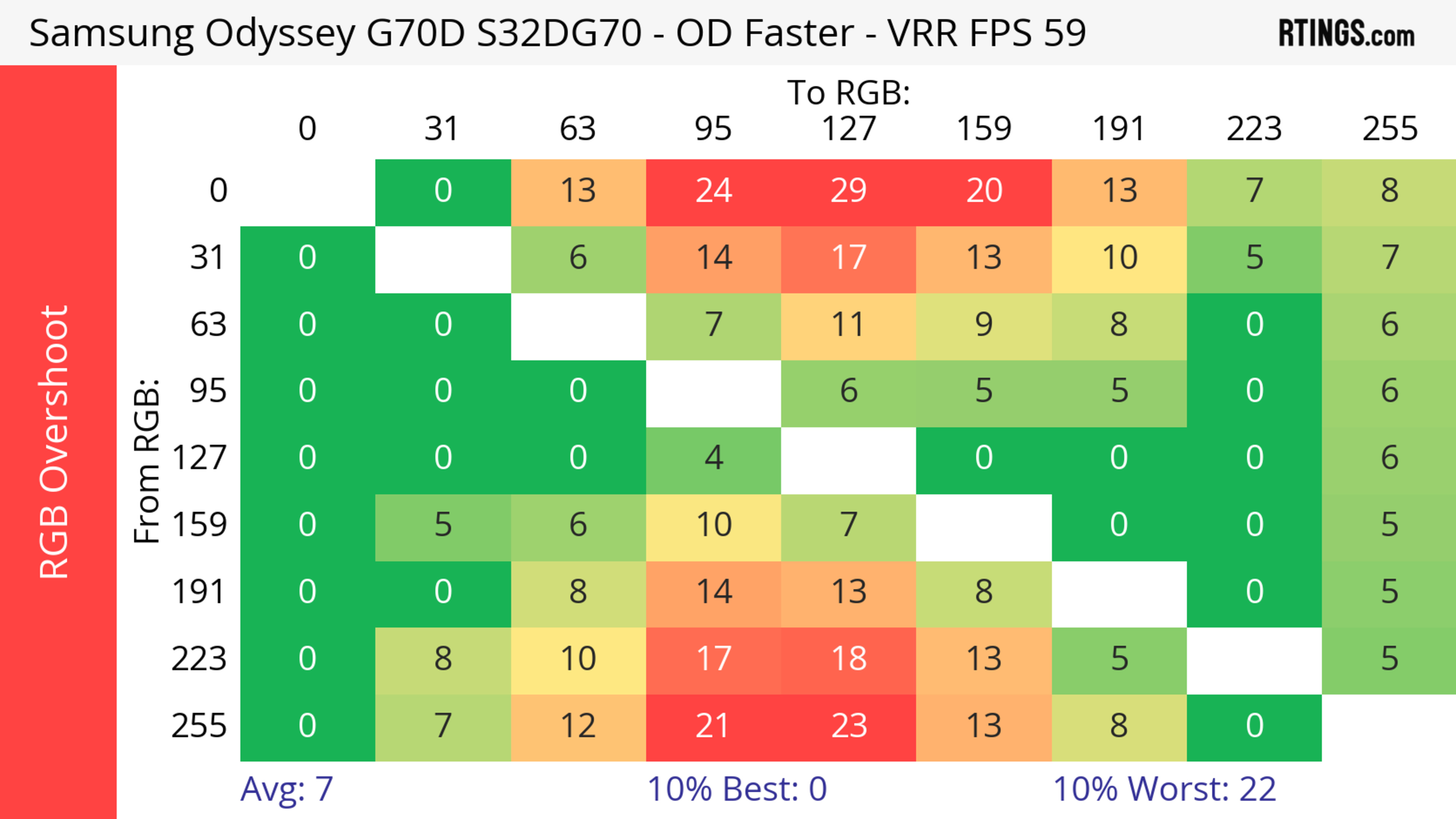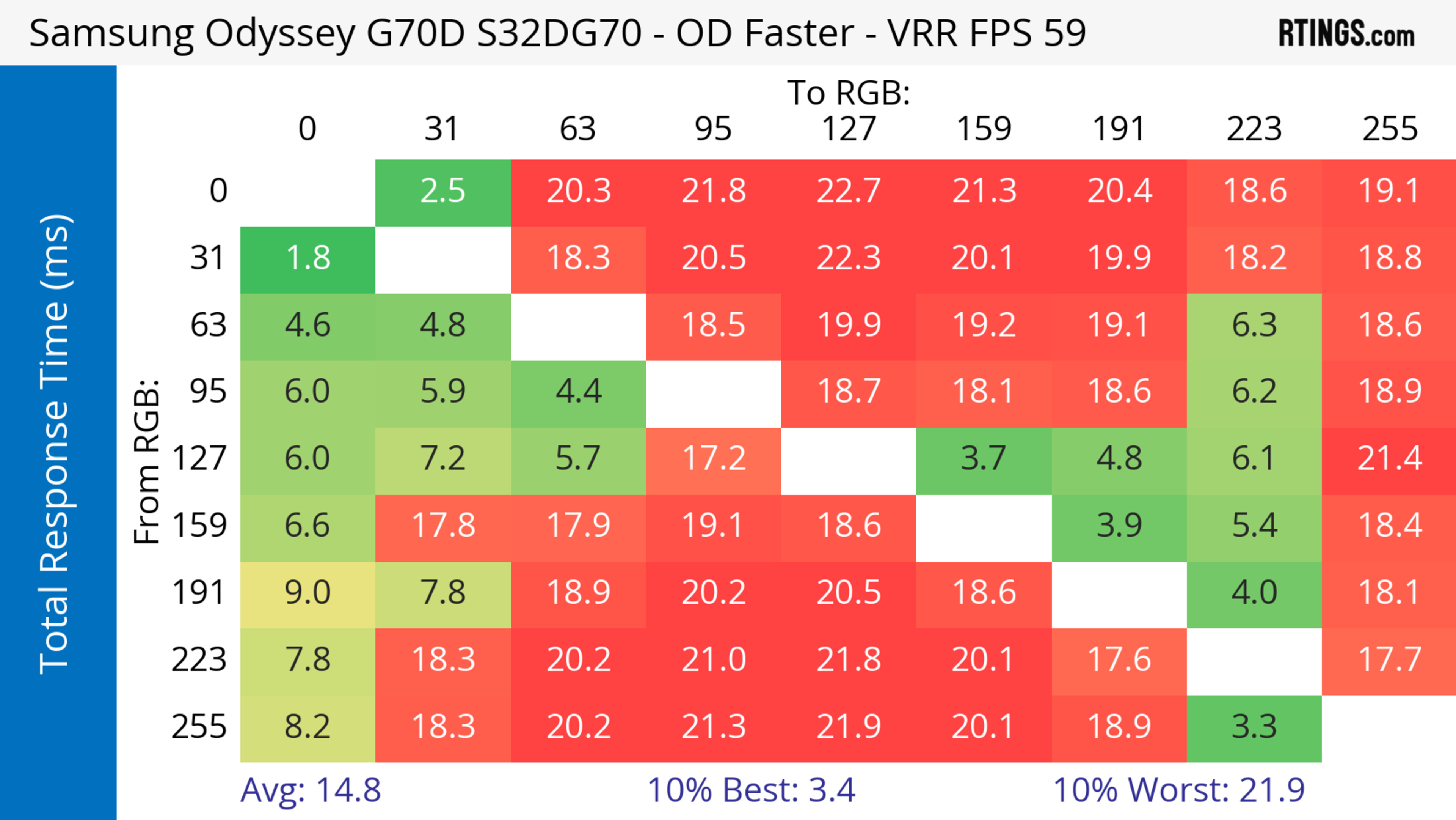 The Samsung Odyssey G70D S32DG70 has very good motion handling across its VRR range. The 'Standard' Response Time setting looks best at all refresh rates. While 'Faster' is just a bit worse, 'Extreme' is much blurrier, and in some places exceeds the limits of the graph. We've created an alternate graph at a different scale to illustrate how high the CAD gets.