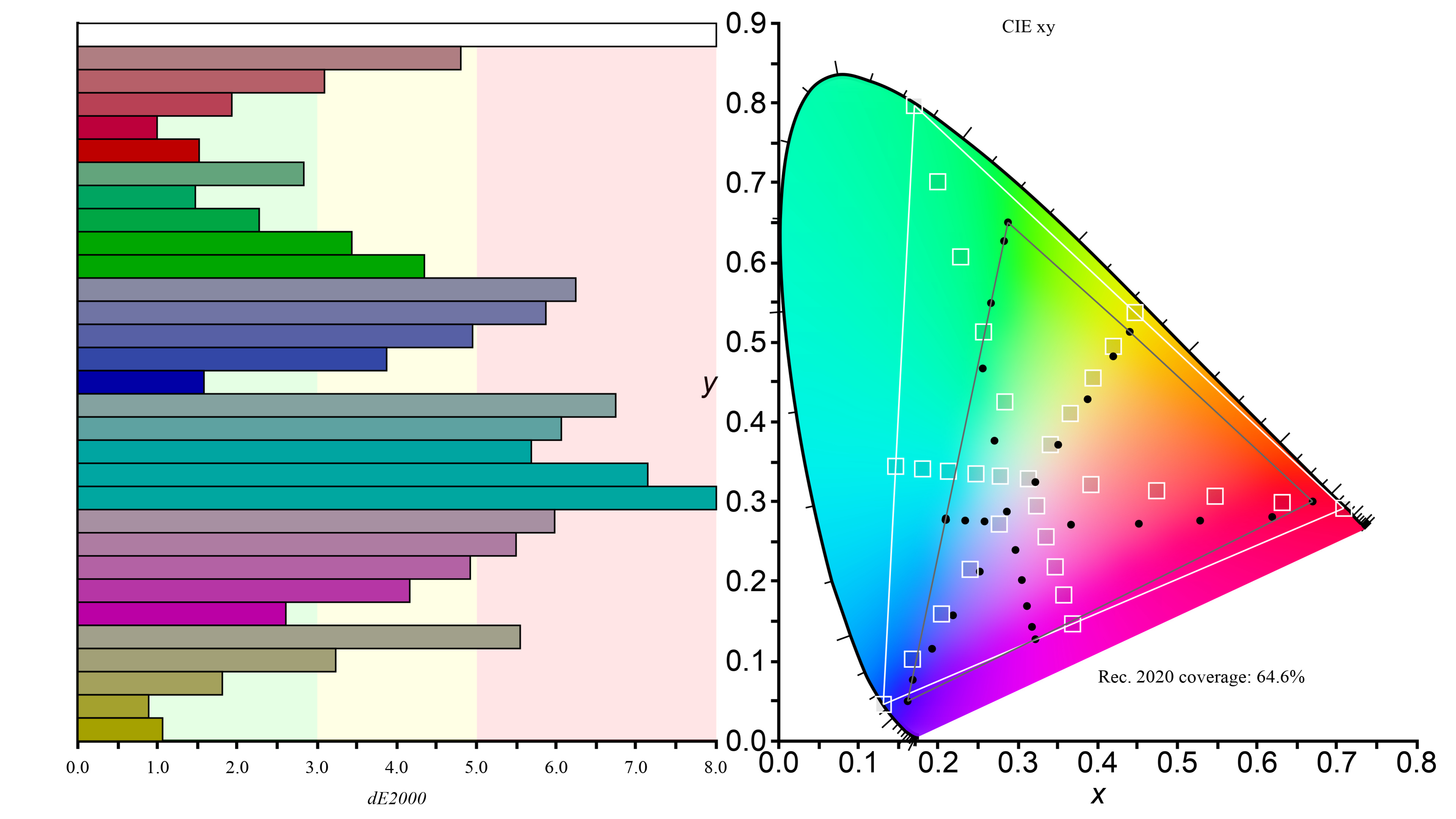 The SDR color gamut is incredible. It has perfect coverage of the common sRGB color space besides saturated blues. It also has good coverage of the Adobe RGB color space used in photo publishing, but it oversaturates reds and blues and undersaturates greens and cyans.