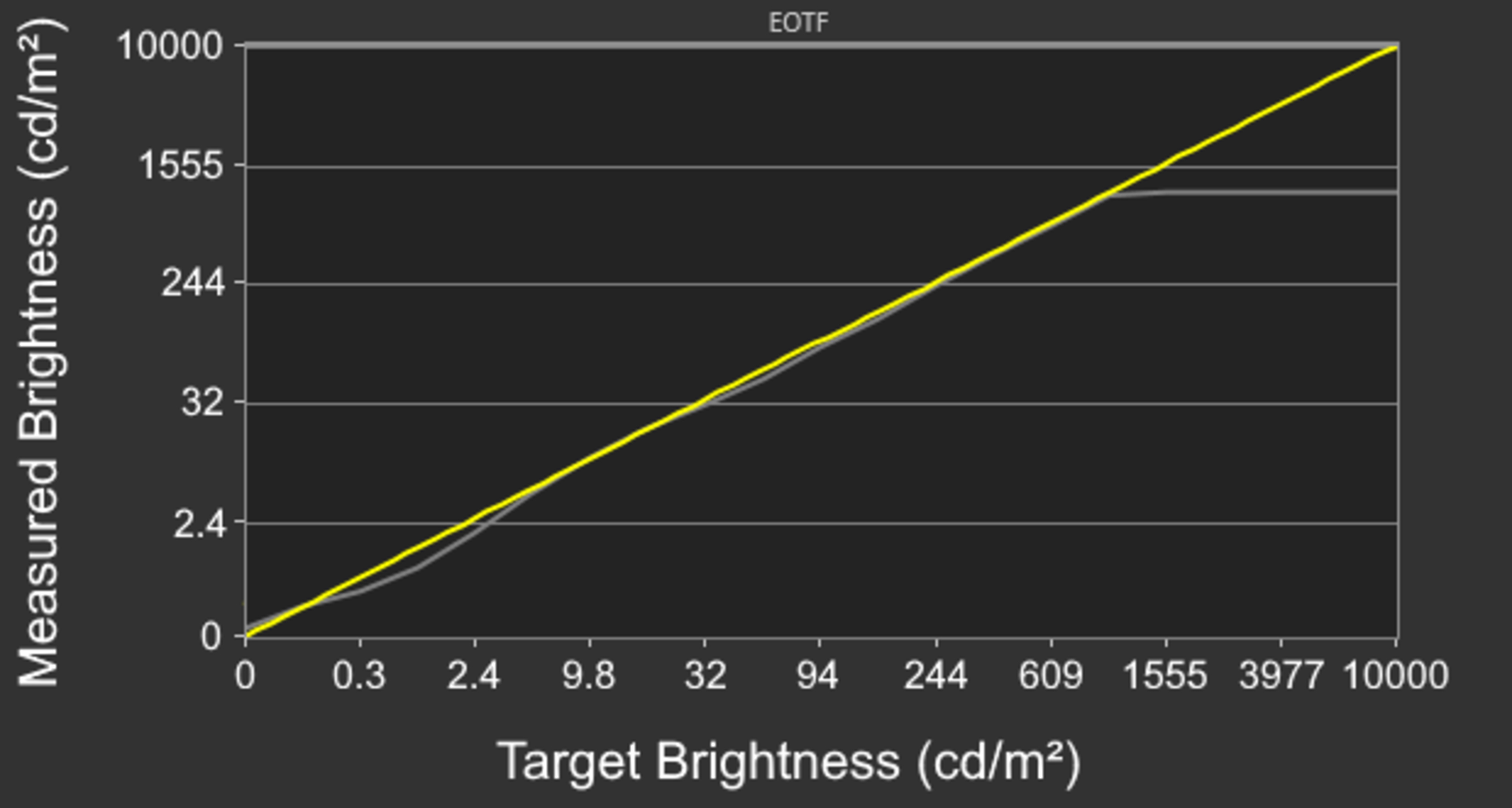 The HDR brightness is great. Bright highlights pop, especially small objects that stand out against the rest of the image. These results are with a 32:9 aspect ratio, and it gets much brighter with a 16:9 aspect ratio as it reaches 815 cd/m² in the Real Scene test. The EOTF is okay, as it crushes blacks and overbrightens brighter scenes. Because of the sharp roll-off at the peak brightness, it lets highlights get the brightest they can. The EOTF performs better with Color Tone set to 'Standard,' as you can see here, but it doesn't get as bright as the 'Warm 1' setting.