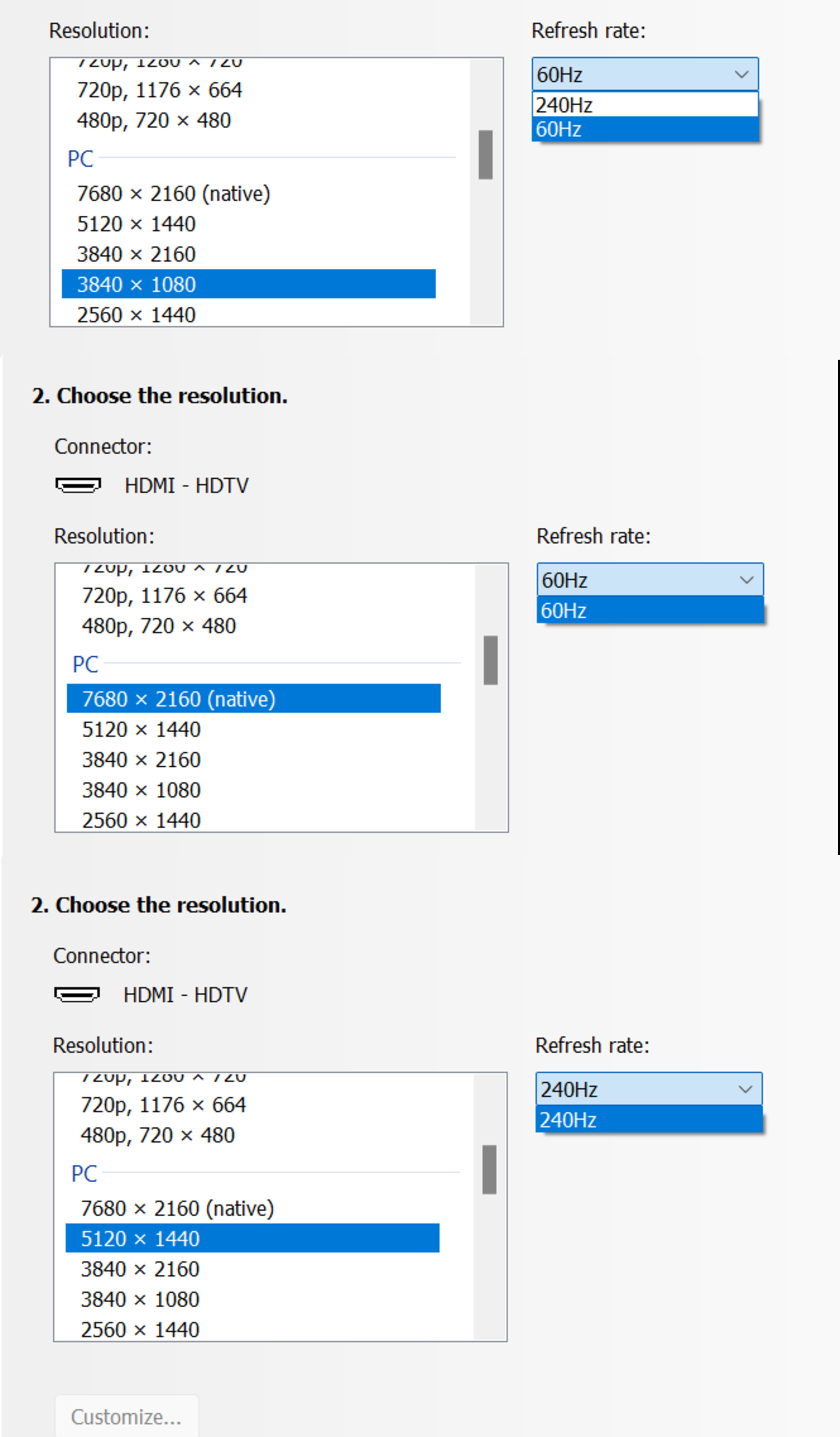 However, connecting over HDMI isn't so straightforward. You need an HDMI 2.1 graphics card and need to connect to HDMI 2 or 3 as they support the full 48 Gbps bandwidth of HDMI 2.1, and HDMI 1 is limited to a max refresh rate of 120Hz at its native resolution. Although there aren't issues reaching the max refresh rate and resolution with 8-bit signals, not all sources support the 240Hz refresh rate with 10-bit signals. The max with an NVIDIA RTX 4080 graphics card is 120Hz, and that's only when setting the Refresh Rate in the monitor's OSD to '120Hz.' Setting it to '240Hz' strangely limits the 10-bit refresh rate to 60Hz, as you can see here. While using the RX 7800 XT graphics card, the max refresh rate with 10-bit was 240Hz though, as it uses Display Stream Compression.