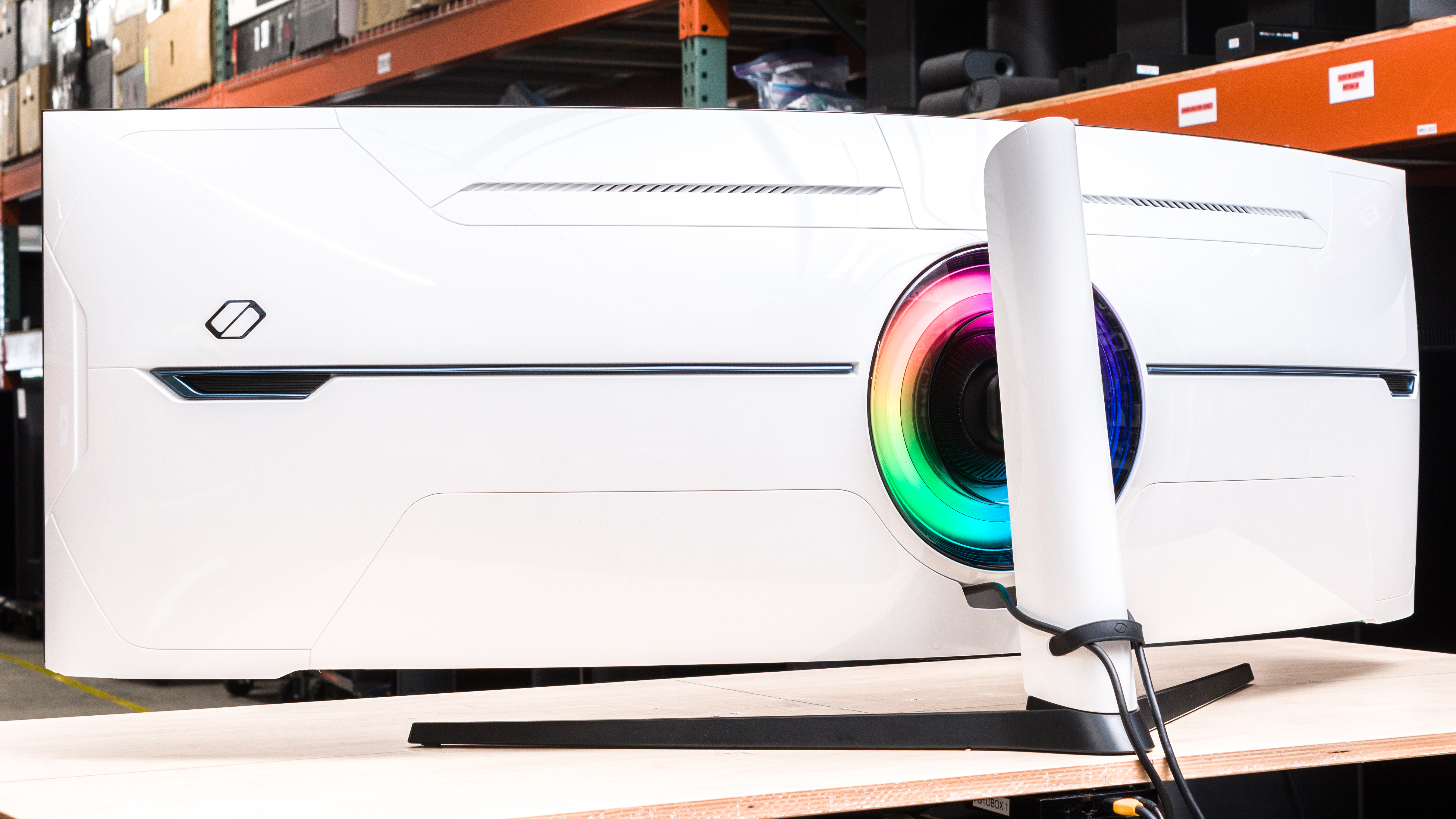 The Samsung Neo G9 has a large 57-inch screen with an aggressive 1000R curve that may take time to get used to, especially if you aren't used to curved displays. It has black feet and bezels, and the body is white plastic. There's also a ring of RGB lighting on the back where the stand attaches to the monitor.