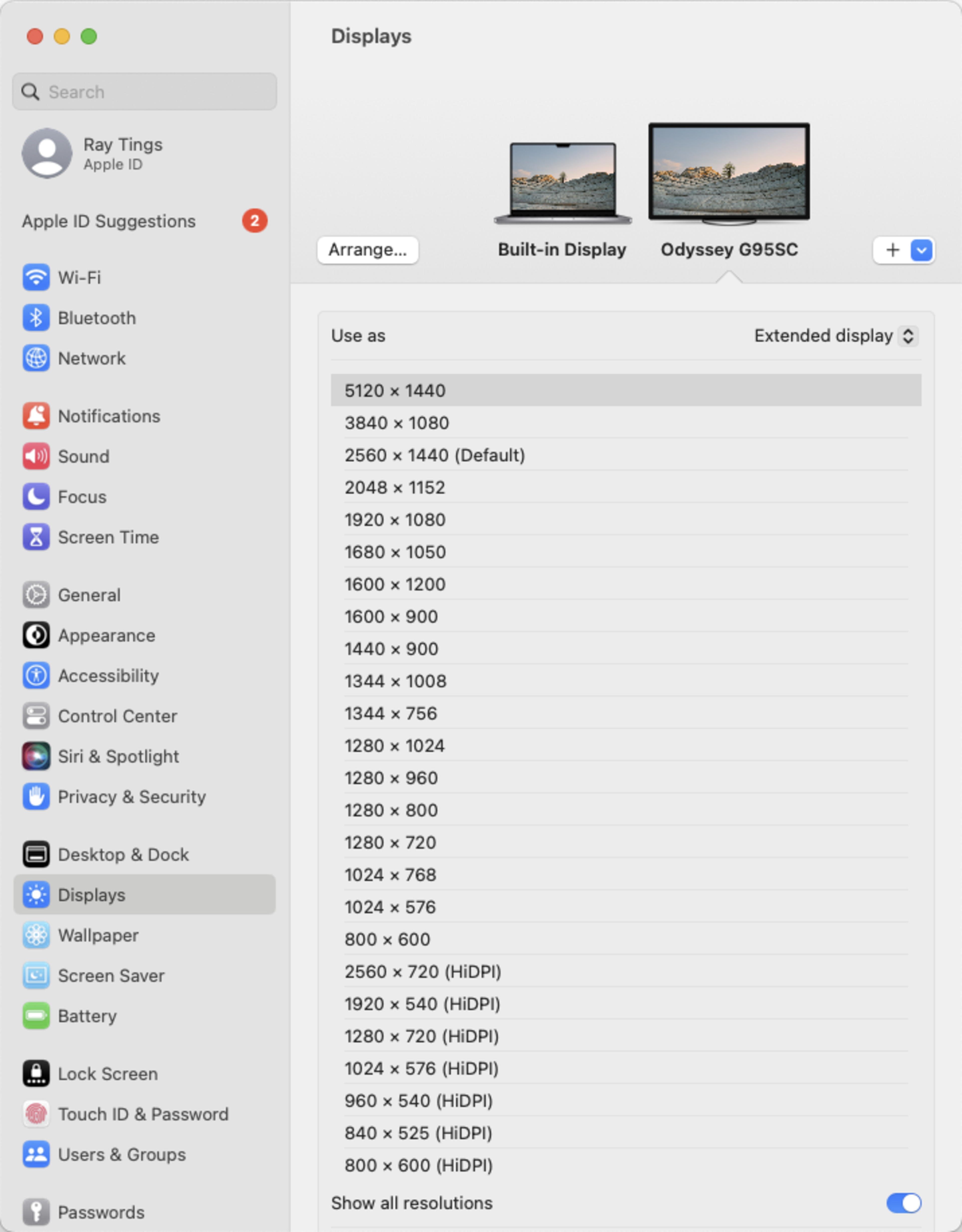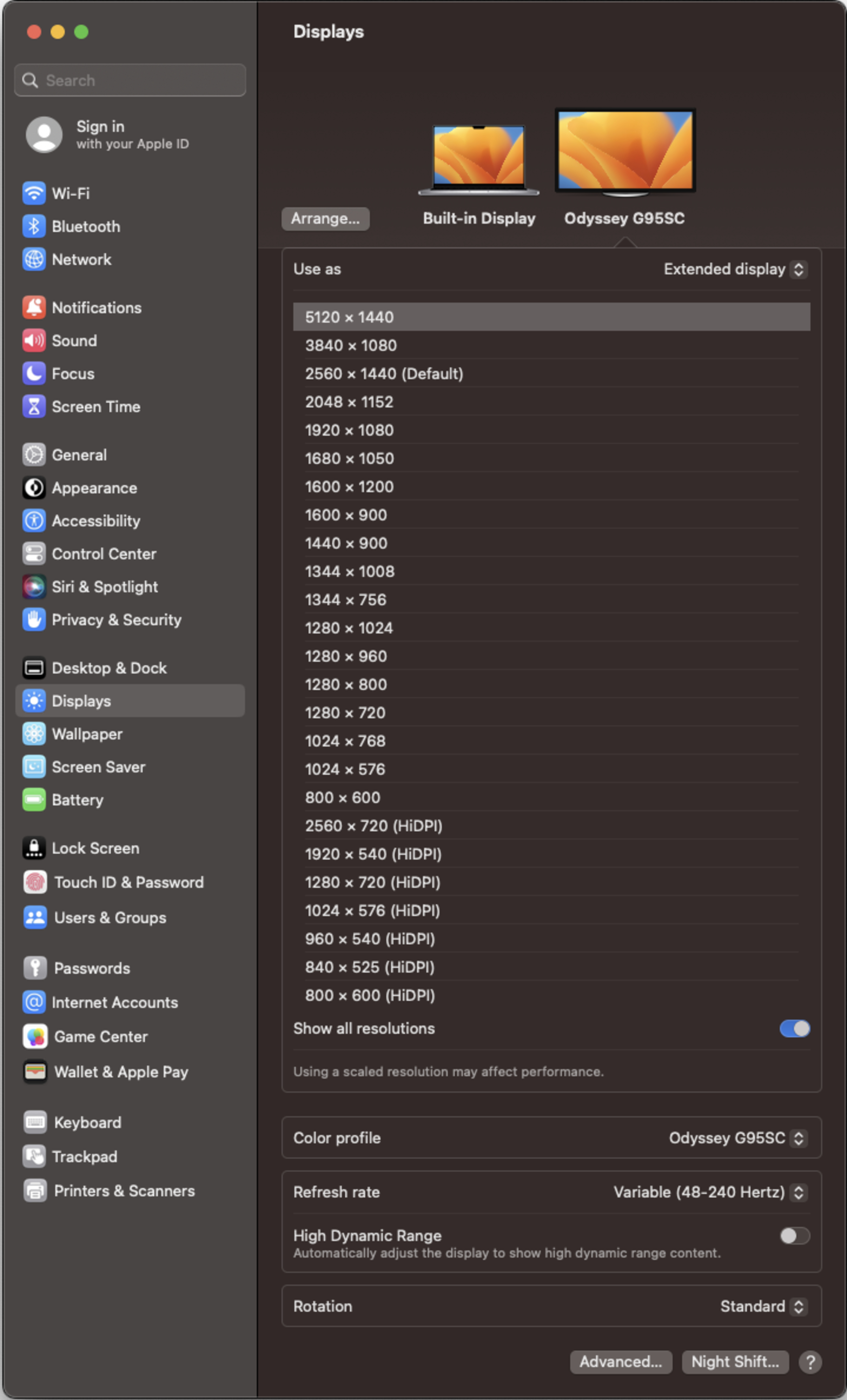 The Samsung G95SC works well with macOS using the DisplayPort connection with a USB-C adapter. The resolutions you can display depend on your computer, as the results vary with different MacBooks. With a 14-inch M1 MacBook Pro (2021) and a 15-inch M2 MacBook Air (2023), you get various resolutions up to 5120x1440 @ 120Hz with both VRR and HDR and there aren't any issues. You can only get the max resolution and 240Hz refresh rate with VRR on a 14-inch M2 Pro MacBook Pro (2023), as you can see here, so you need the power of at least the M2 Pro chip to reach the max refresh rate. The resolution and refresh rate over HDMI is also limited to 2560x1440 @ 60Hz without VRR with the M1 MacBook Pro. Unfortunately, windows don't return to their original position if you use a MacBook and close the lid, but they do if the computer goes to sleep.