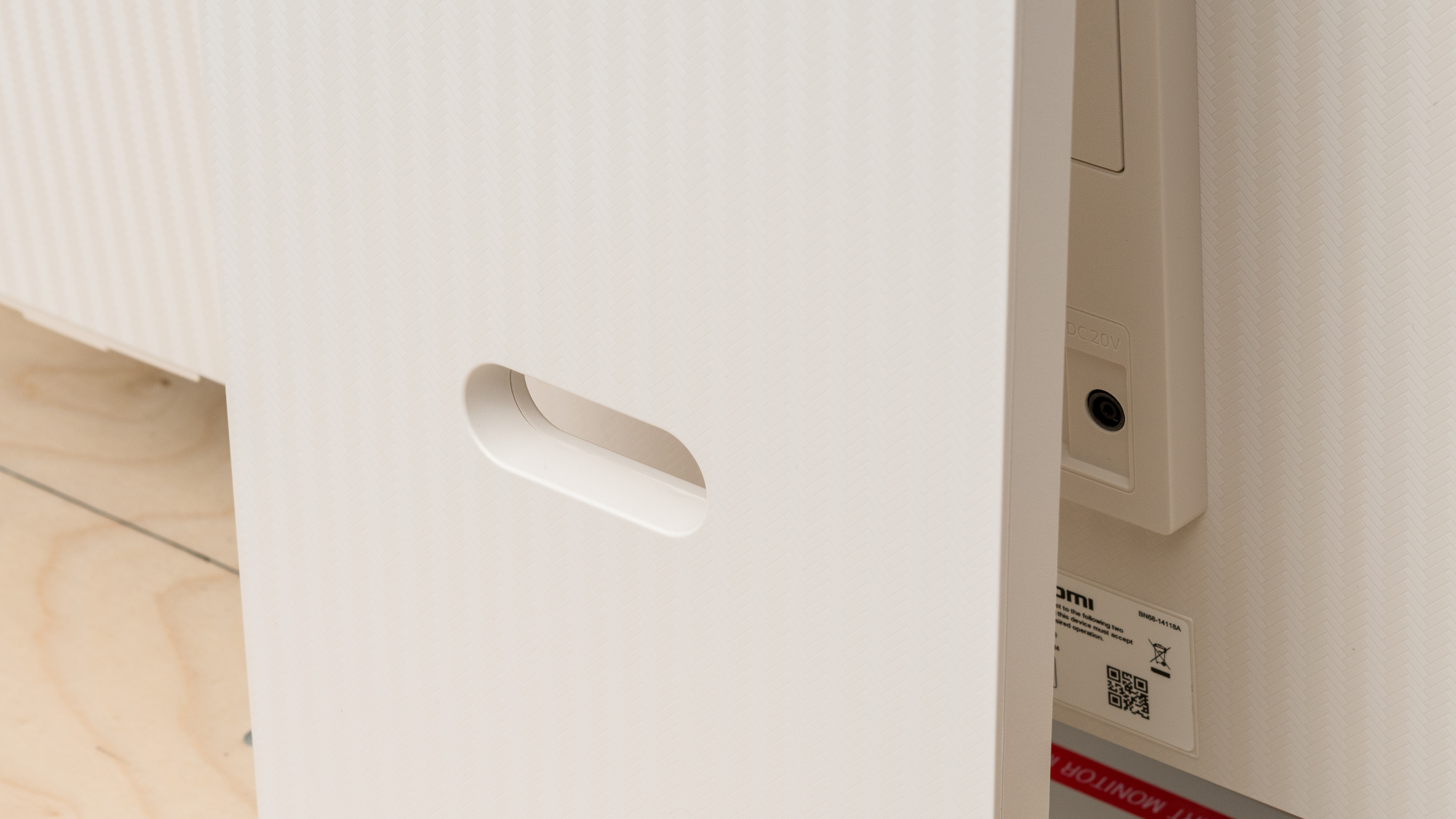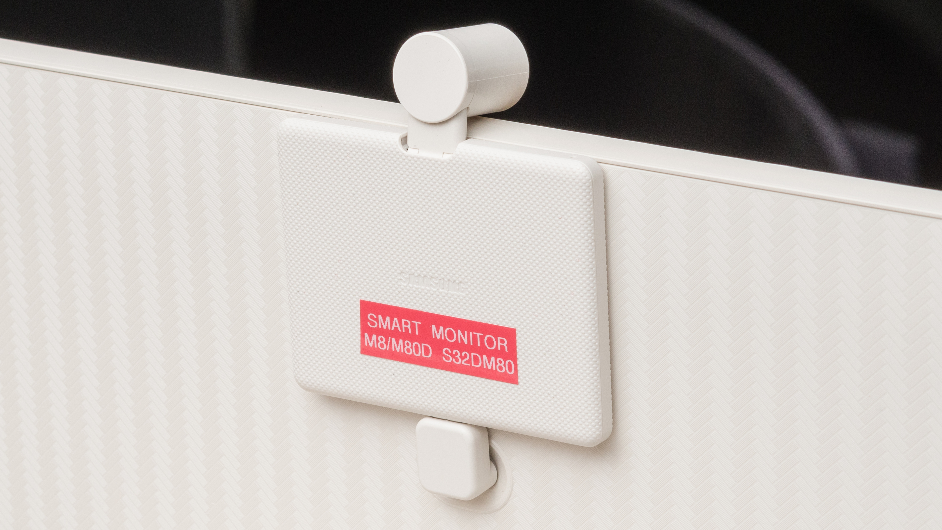 The Samsung M80D has a simple design with thin bezels on three sides and a flat, square-based stand. It has a sensor for the remote on the bottom right side, and it comes with a camera that attaches to the back. One thing to note is that its body color is more of an off-white than a pure white.