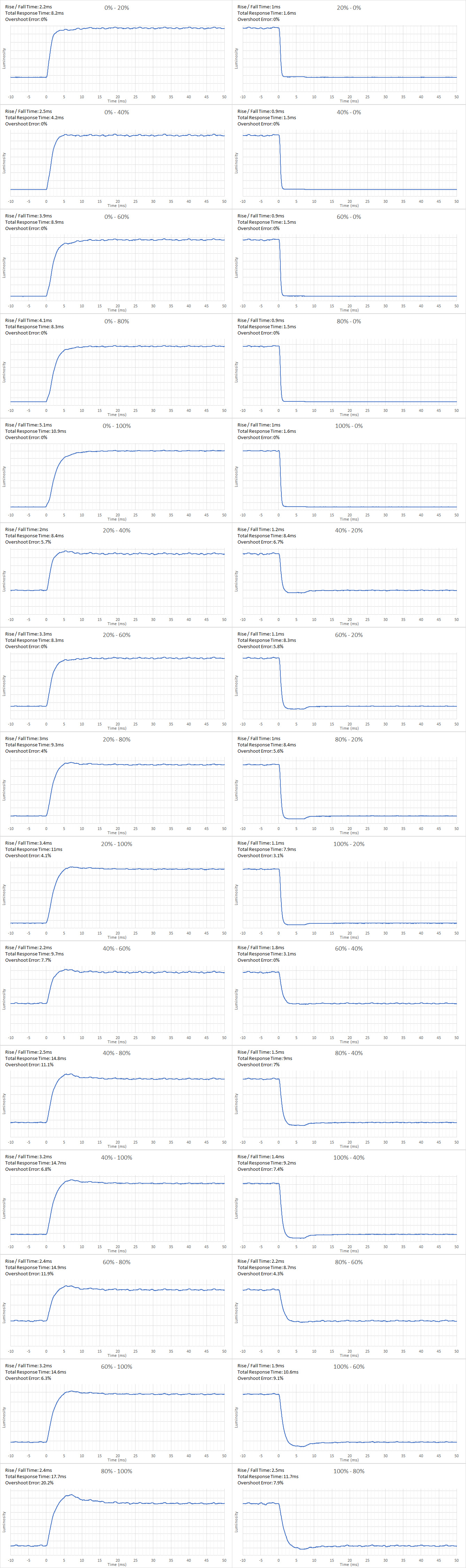 The XG2402 has an outstanding fast response time. Most transitions are nearly instantaneous, and there is almost no measurable overshoot. This produces clear motion, with next to no noticeable motion blur. The lack of motion blur may bother some people if the frame rate drops too low. We recommend the 'Fast' Rampage Response setting, as it delivers the best balance of response time and overshoot. There's some overshoot in that mode, but it's not really noticeable. Higher settings have slightly faster rise/fall times, but the total response time increases with each setting, as there's significantly more overshoot in each successive mode.