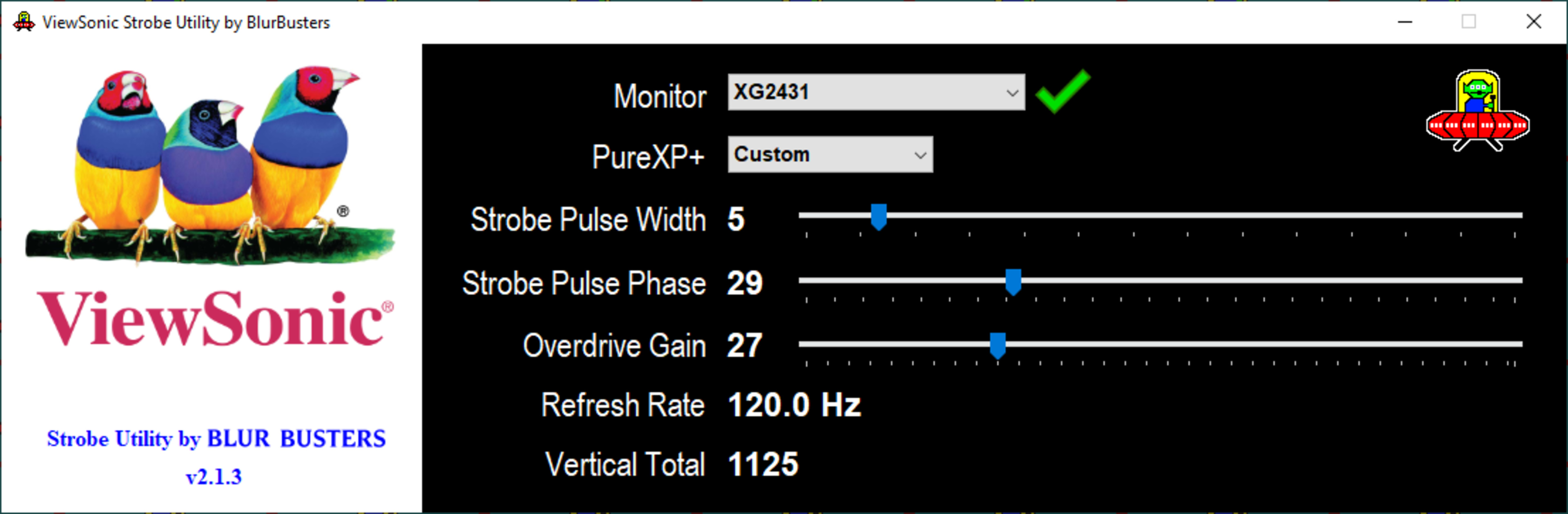 The ViewSonic OMNI XG2431 has an optional backlight strobing feature to reduce persistence blur called PureXP, and it's certified in the Blur Busters Approved Certification Programme, Version 2.0. It's customizable as you can adjust the setting to different modes, and there's also a 'Custom' mode that allows you to control the pulse width and phase and the overdrive. You need to download the ViewSonic Strobe Utility application with the USB-B cable connected to the computer to use it. The photo above is at 240Hz in the 'Ultra' mode, and you can also see the performance with other modes and refresh rates above.