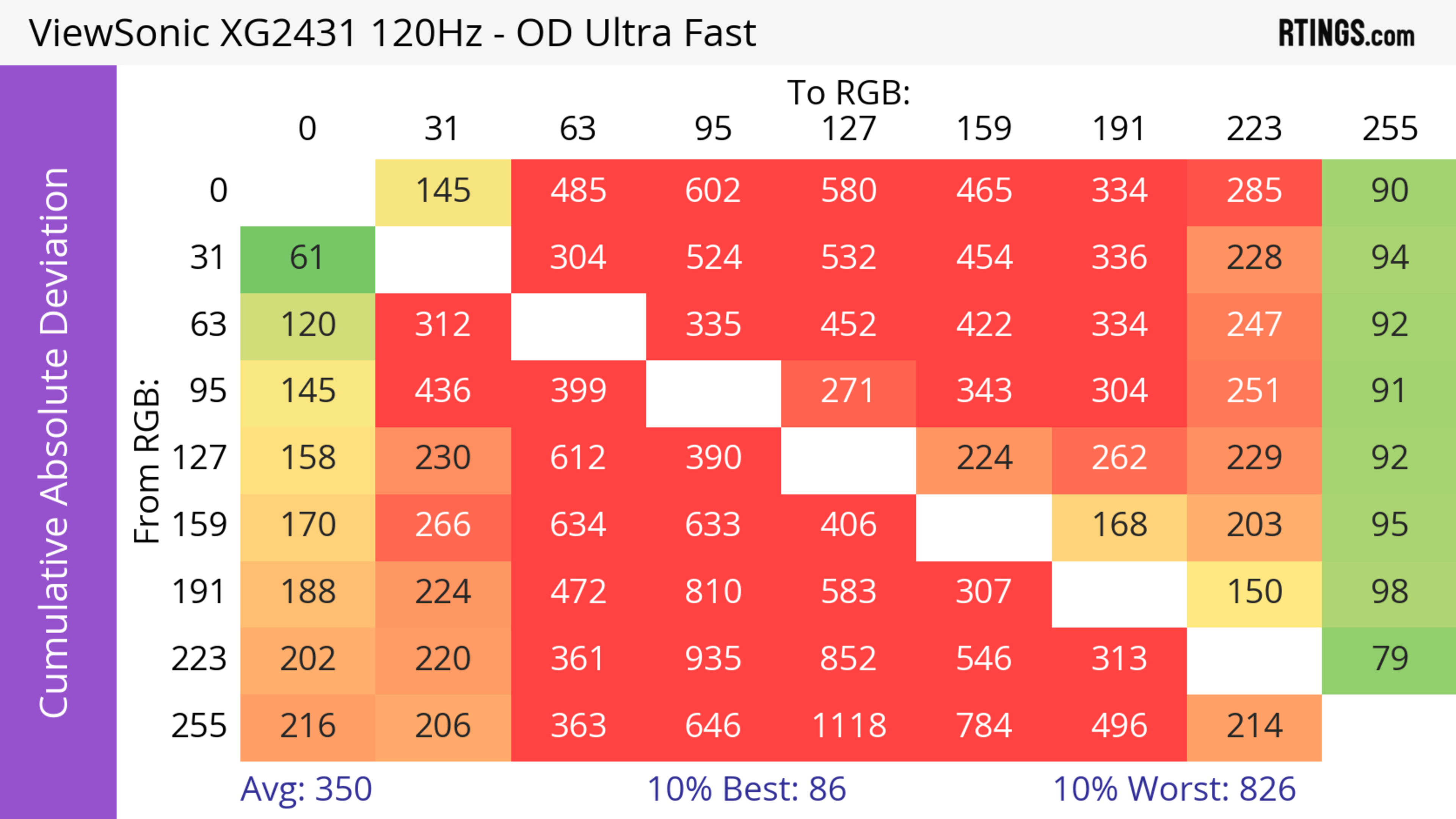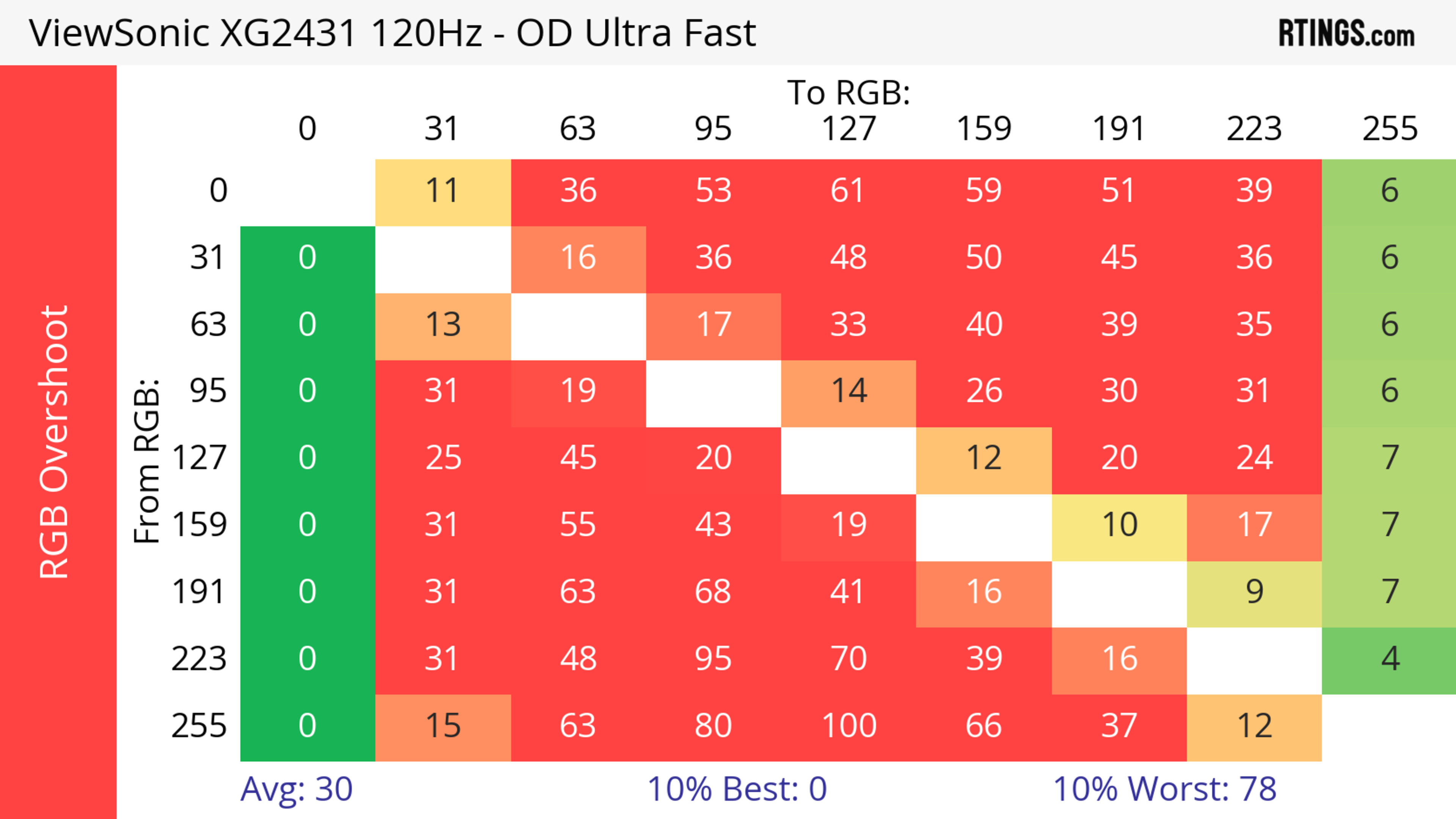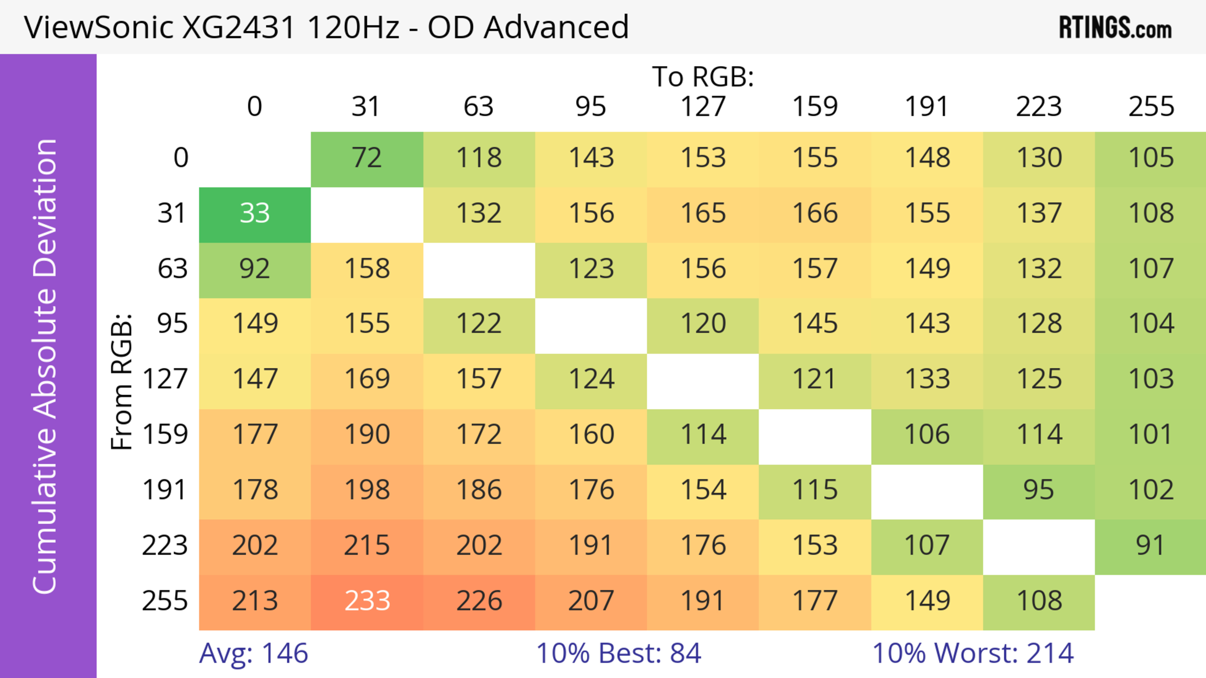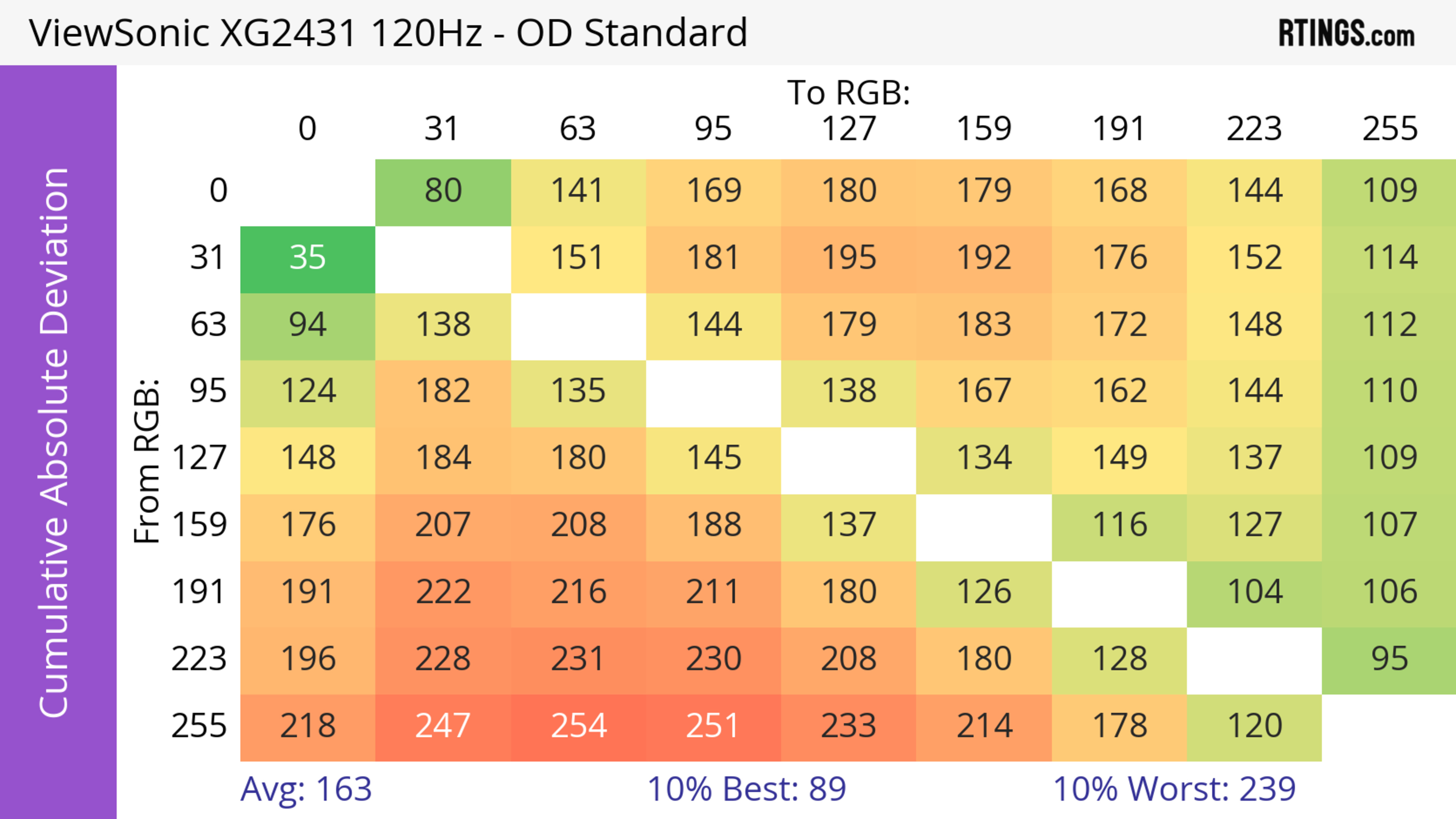 The CAD at 120Hz is great. Similar to its max refresh rate, the recommended overdrive is 'Advanced' as it has minimal blur and smearing. Like at the max refresh rate, the 'Ultra Fast' overdrive setting is better if you set Color Temperature to 'Native' instead of 'Custom'.