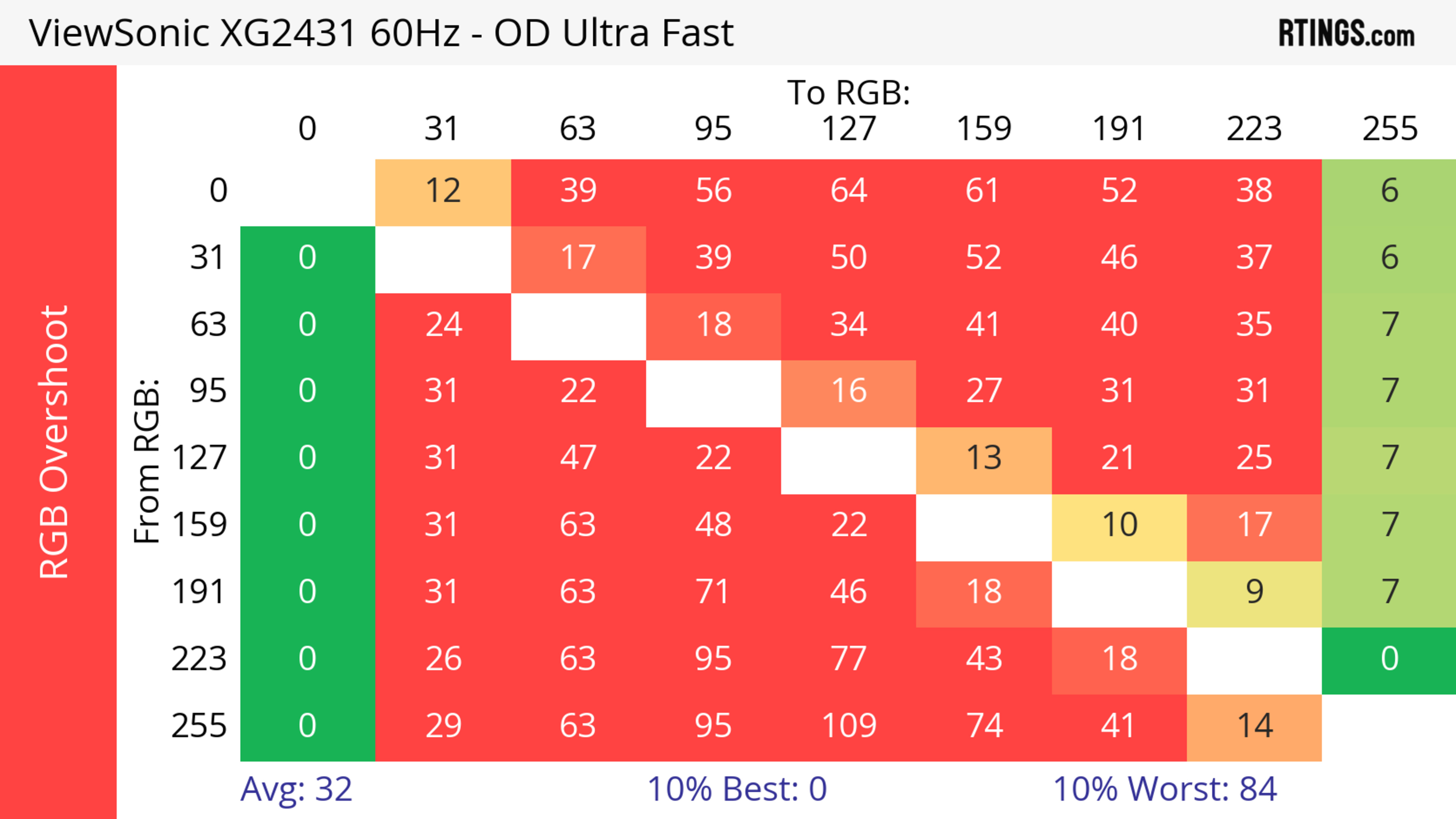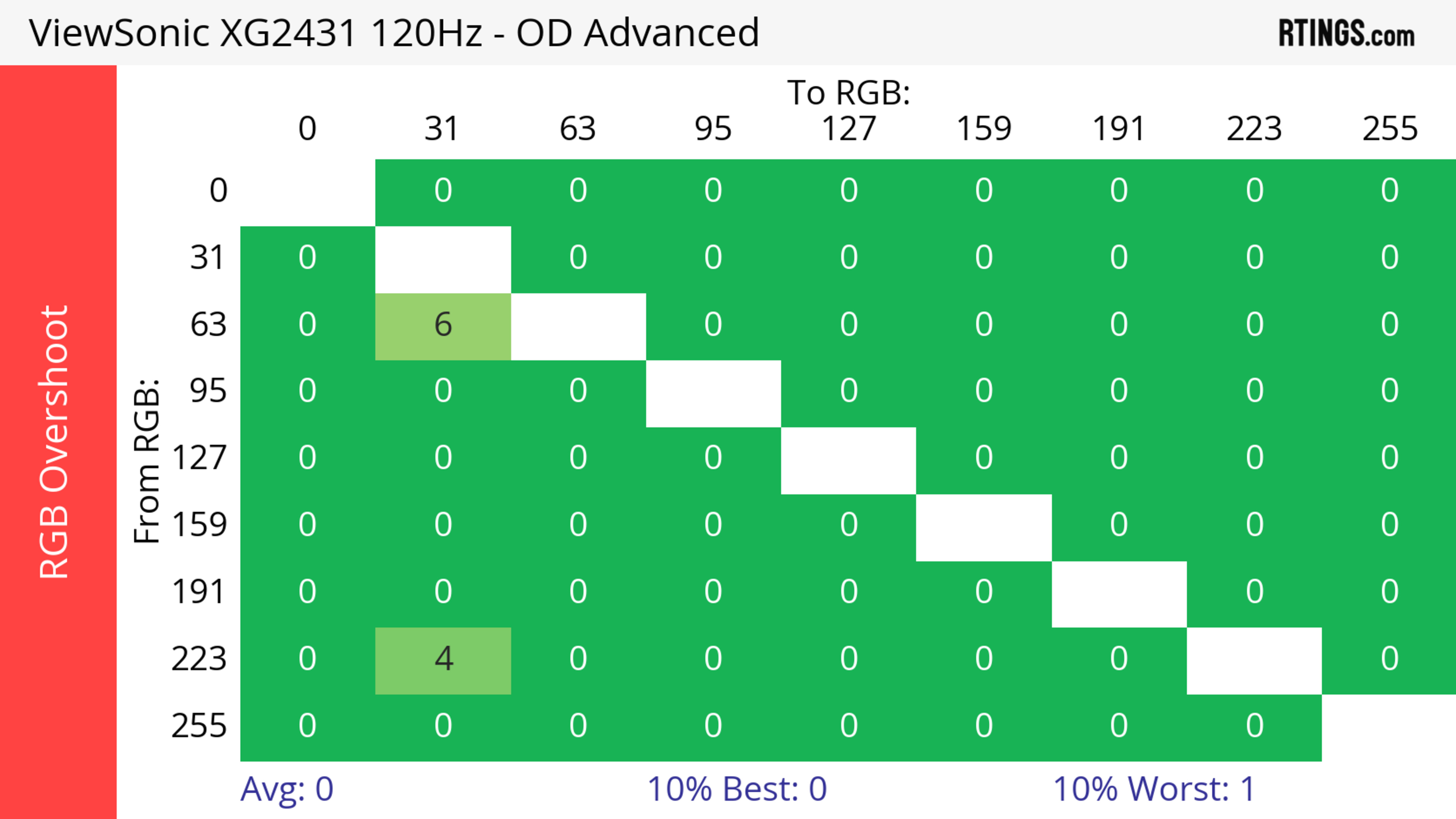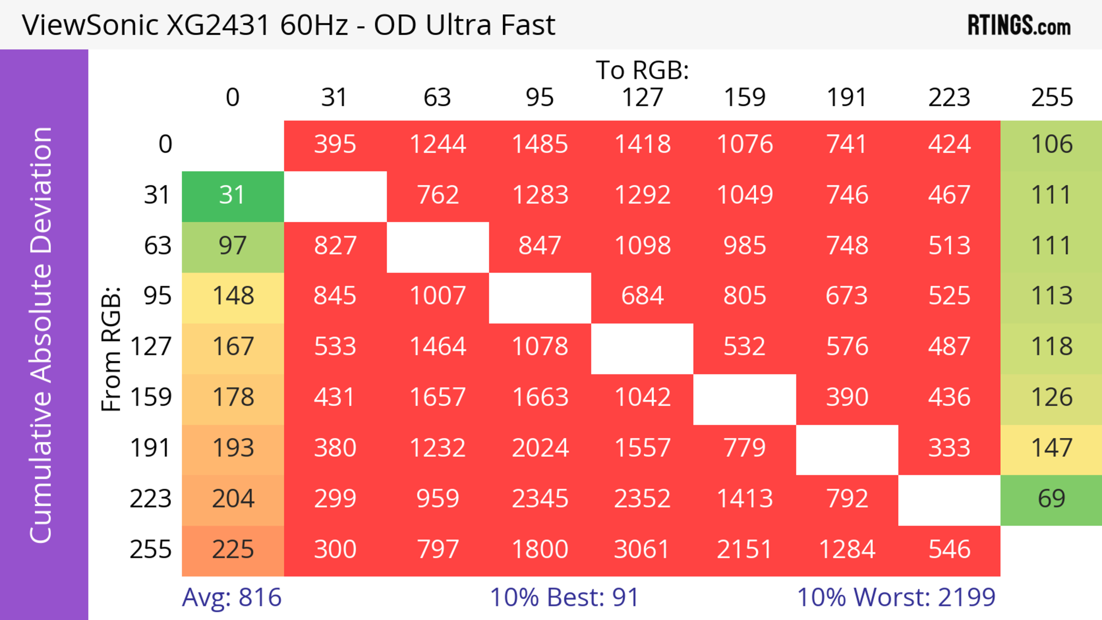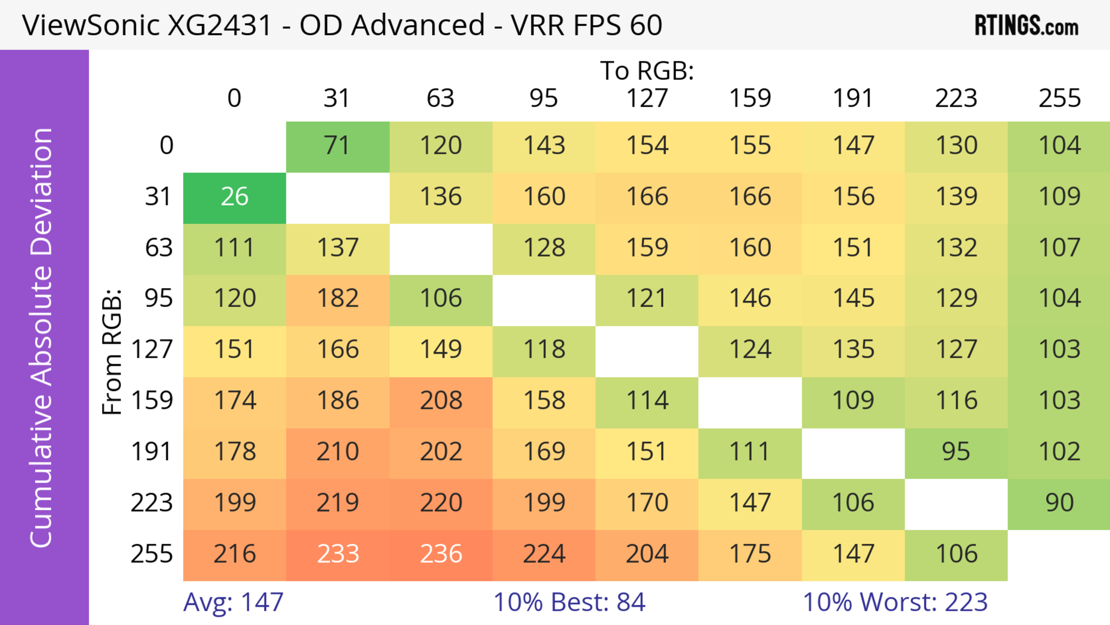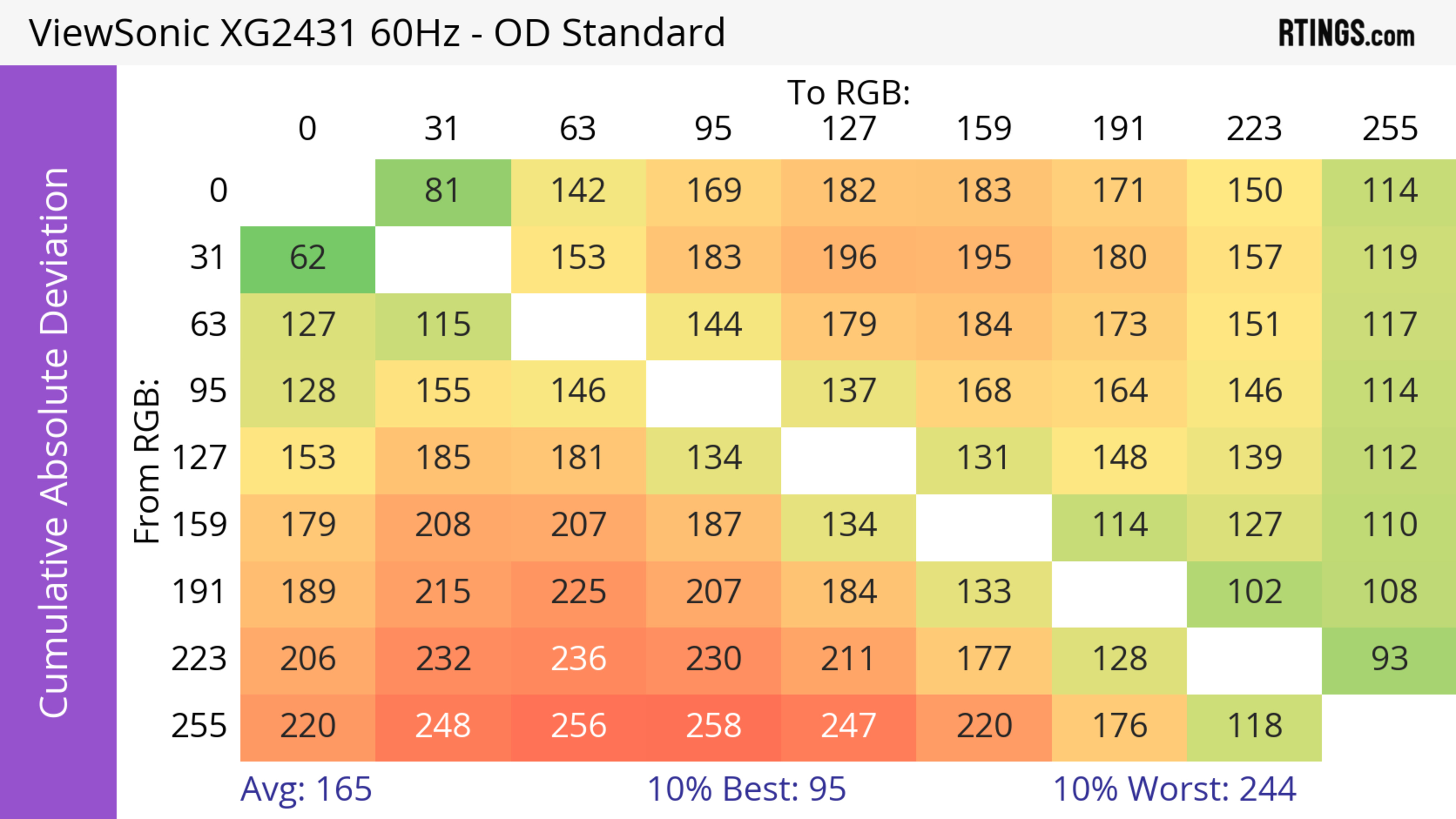 The CAD at 60Hz is very good. The recommended overdrive is once again 'Advanced' because it has less blur than 'Standard' and less inverse ghosting than 'Ultra Fast.' Unlike at higher refresh rates, the recommended overdrive setting is 'Advanced' whether you set Color Temperature to 'Custom' or 'Native.'