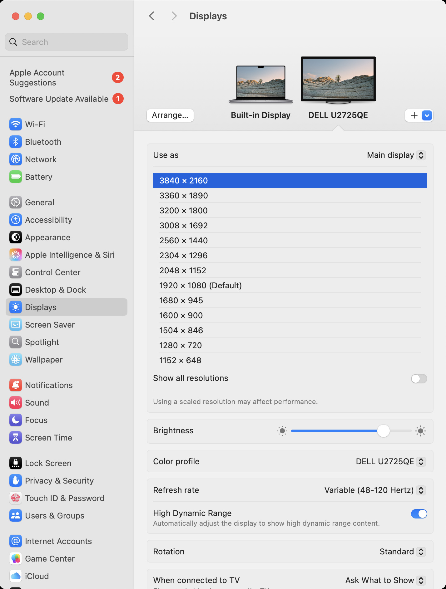 We use the version of macOS that's available at the time of testing the monitor, so we've tested monitors on Monterey 12, Ventura 13, Sonoma 14, and Sequoia 15. This means that the screenshots we include may look different between reviews, especially for older reviews, but the differences are aesthetic only and don't affect compatibility. Below is an example of macOS Sequoia 15's display settings with the Dell U2725QE connected.