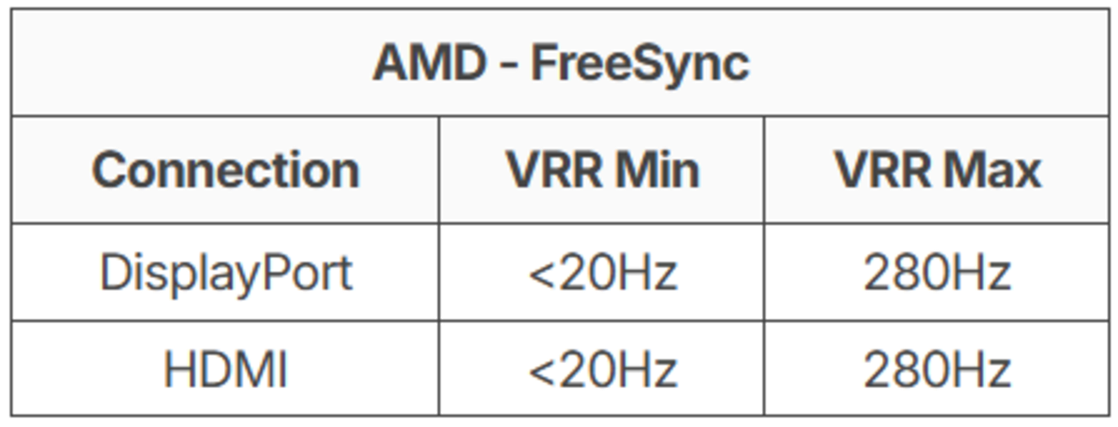 We also include a table in the text to show the VRR range with FreeSync over HDMI and DisplayPort. Most monitors work without issue over DisplayPort and HDMI.