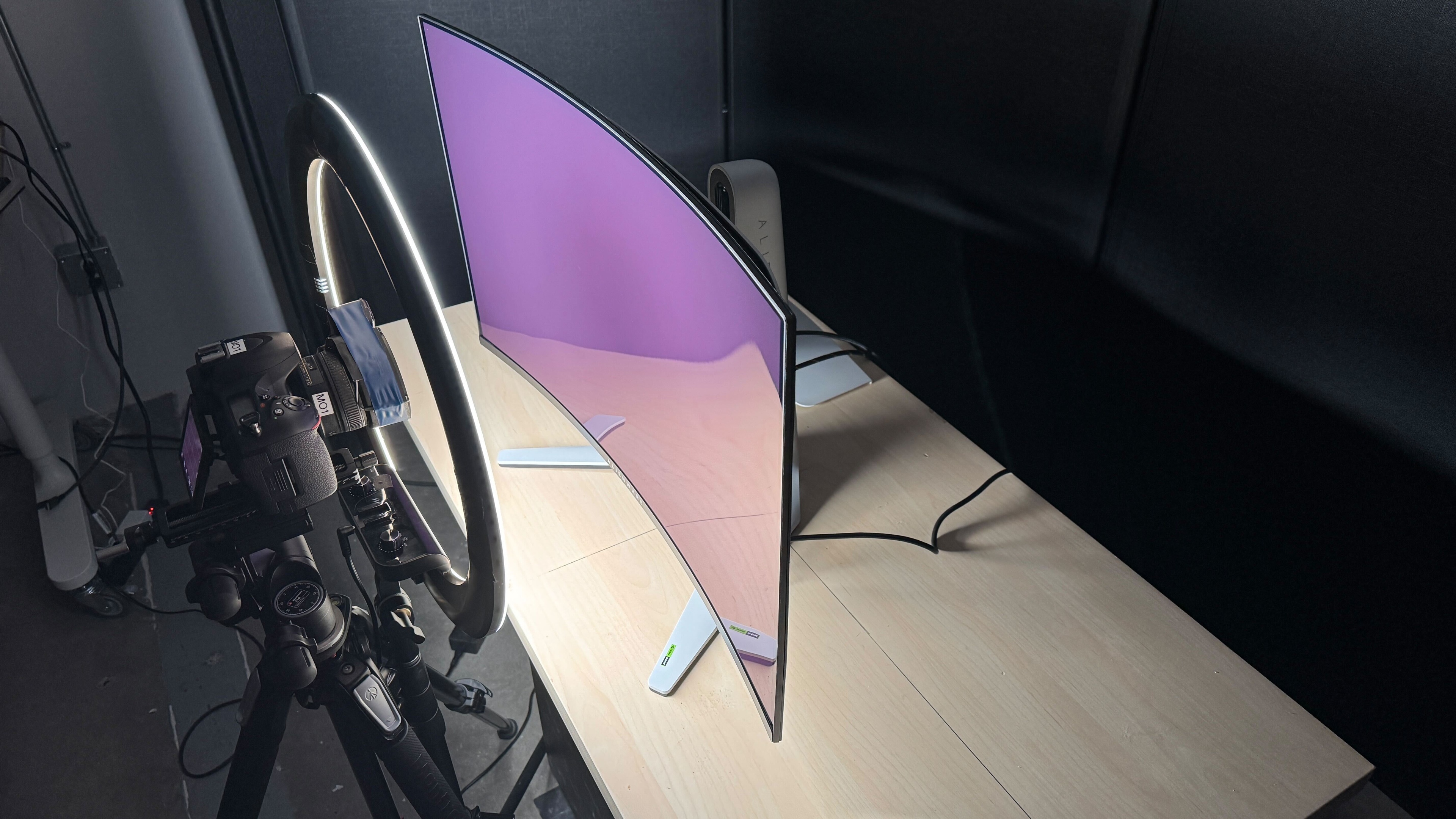 During this test, we place a Neewer RP18B Pro ring light 8.5" (21.5 cm) away from the monitor, centering it with the monitor, and we have a non-reflective black backdrop behind the ring light. We use a Colorimetry CR-100 colorimeter and a Nikon D750 camera with a Nikkor AF-S 50mm 1.8G lens as part of the test. We use these instruments at different times, but place them at the center of the ring light when we do.