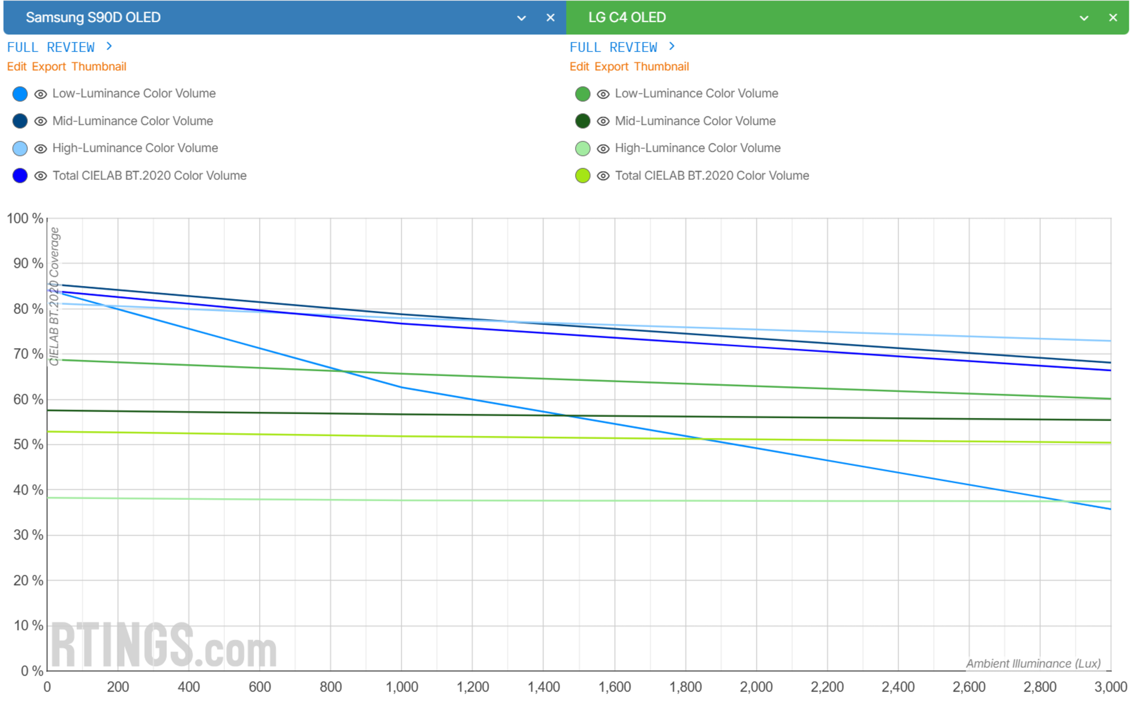 However, we also measure the color saturation of mid and high-luminance colors in this test, so the correlation between panel types isn't as clear as with Ambient Black Level Raise. For example, QD-OLEDs are better at displaying bright colors than WOLEDs, so these colors look better in any environment, but WOLEDs do a better job at maintaining a consistent color volume in any environment. You can see an example of this with the graph below comparing the WOLED LG C4 and the QD-OLED Samsung S90D.
