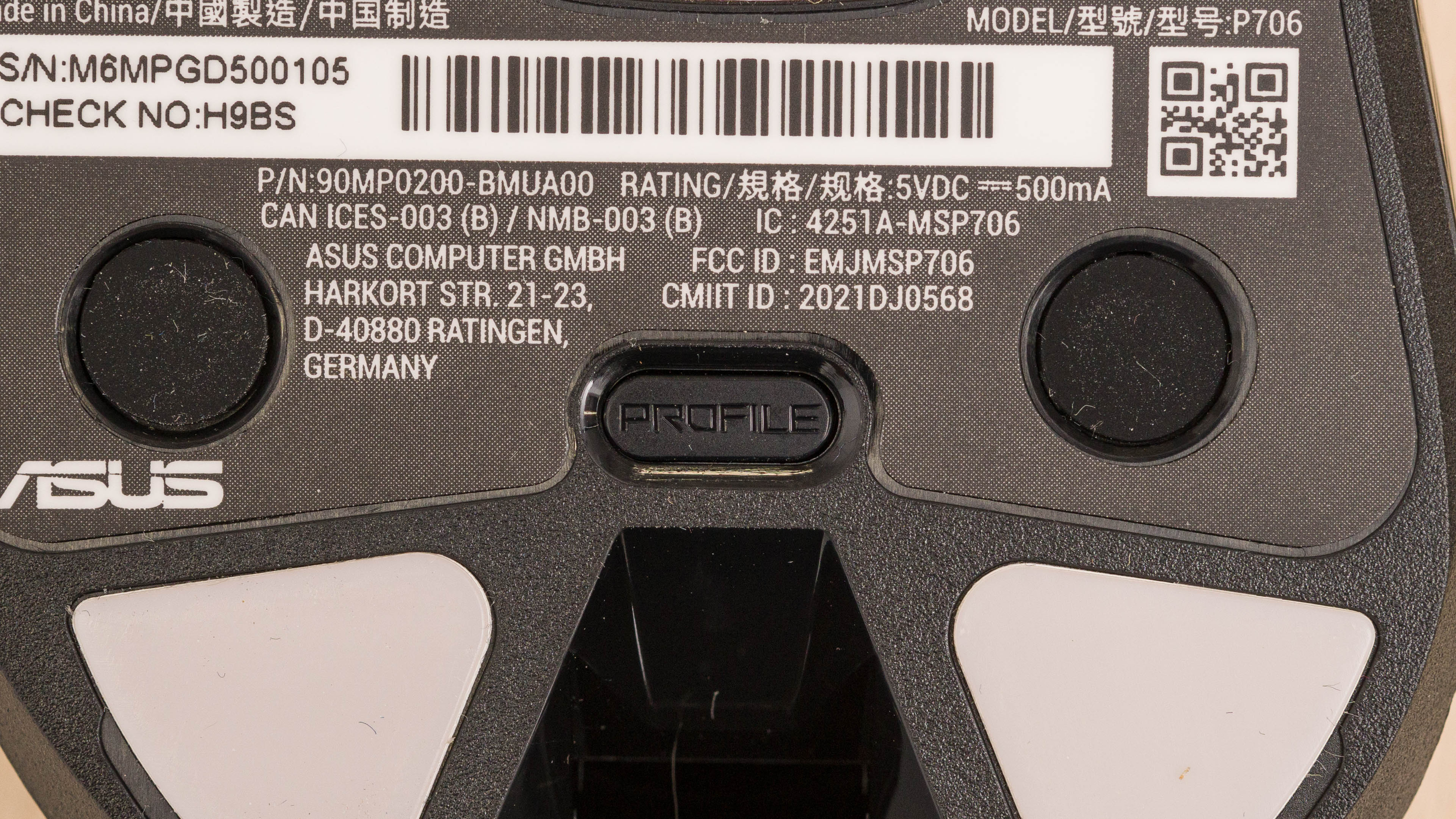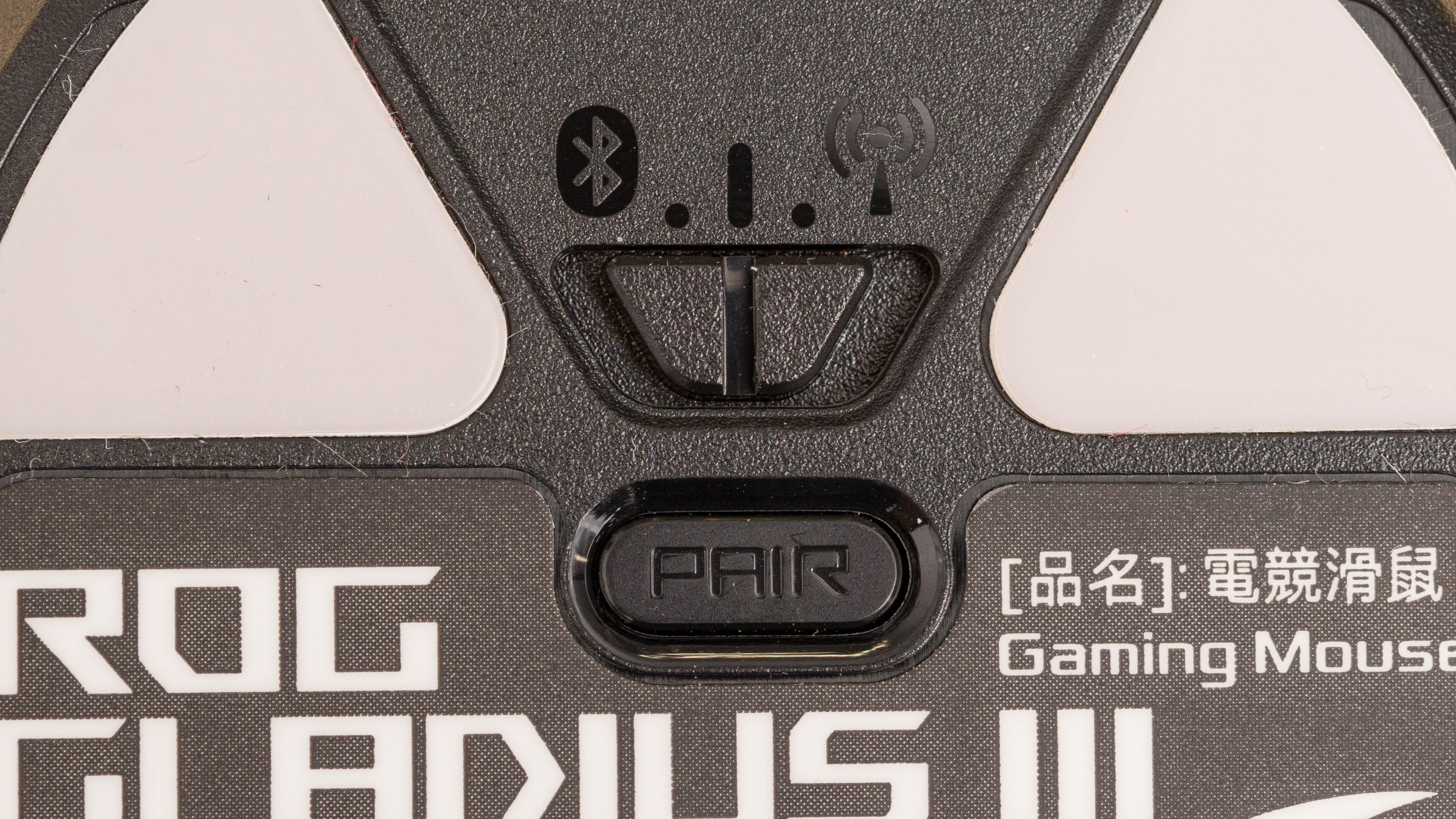 ASUS advertises that the battery in the ASUS ROG Gladius III Wireless should last up to 55 hours when used with the receiver and up to 85 hours when used over Bluetooth, both with the lighting off. You can pair the mouse with three devices via Bluetooth and cycle through them with the "Pair" button on the underside.