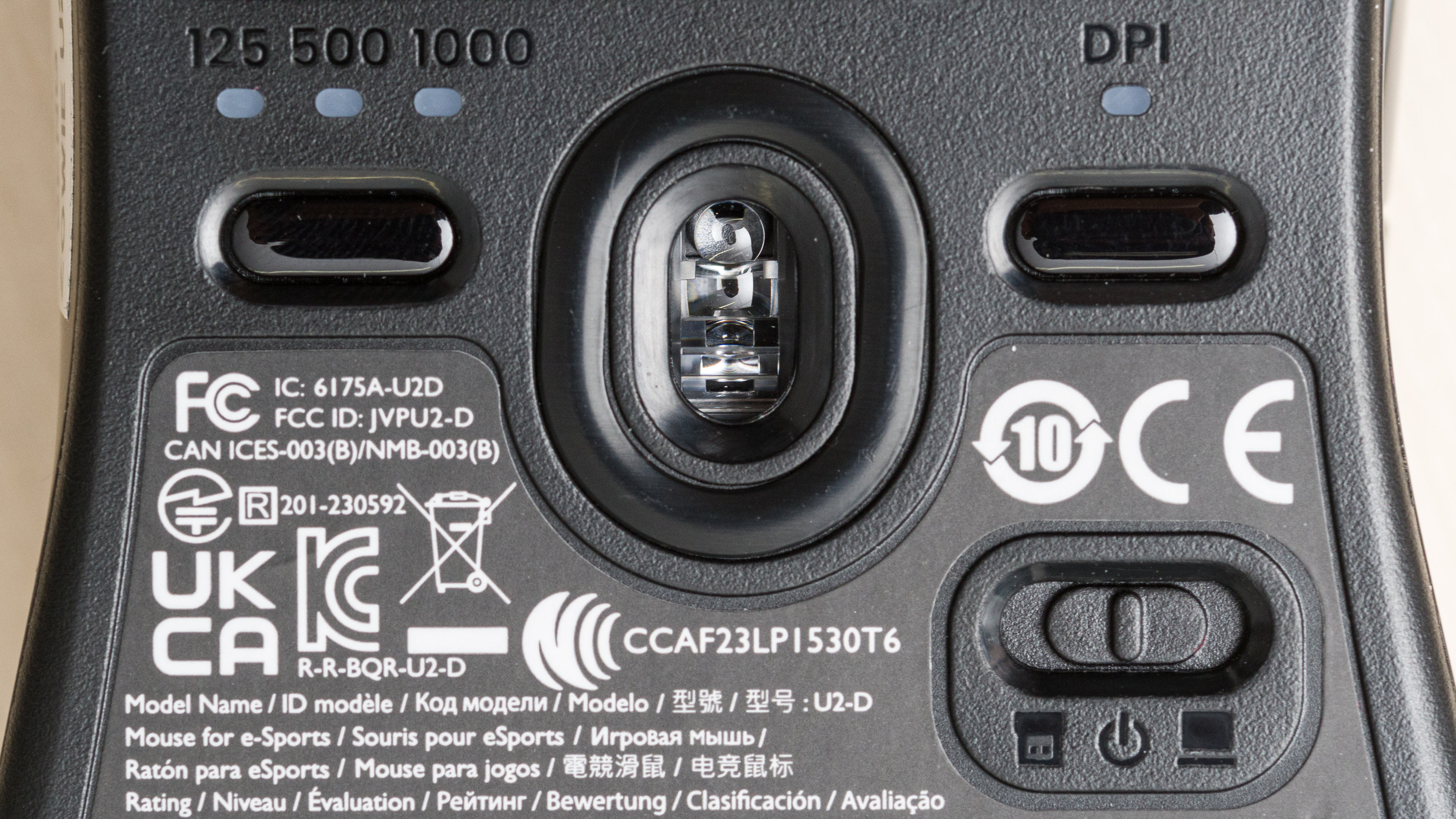 The polling rate options on the BenQ ZOWIE U2 are 125Hz, 500Hz, and 1000Hz. The CPI preset options are 400, 800, 1000, 1200, 1600, and 3200. You can cycle between polling rate and CPI presets with buttons on the underside of the mouse.