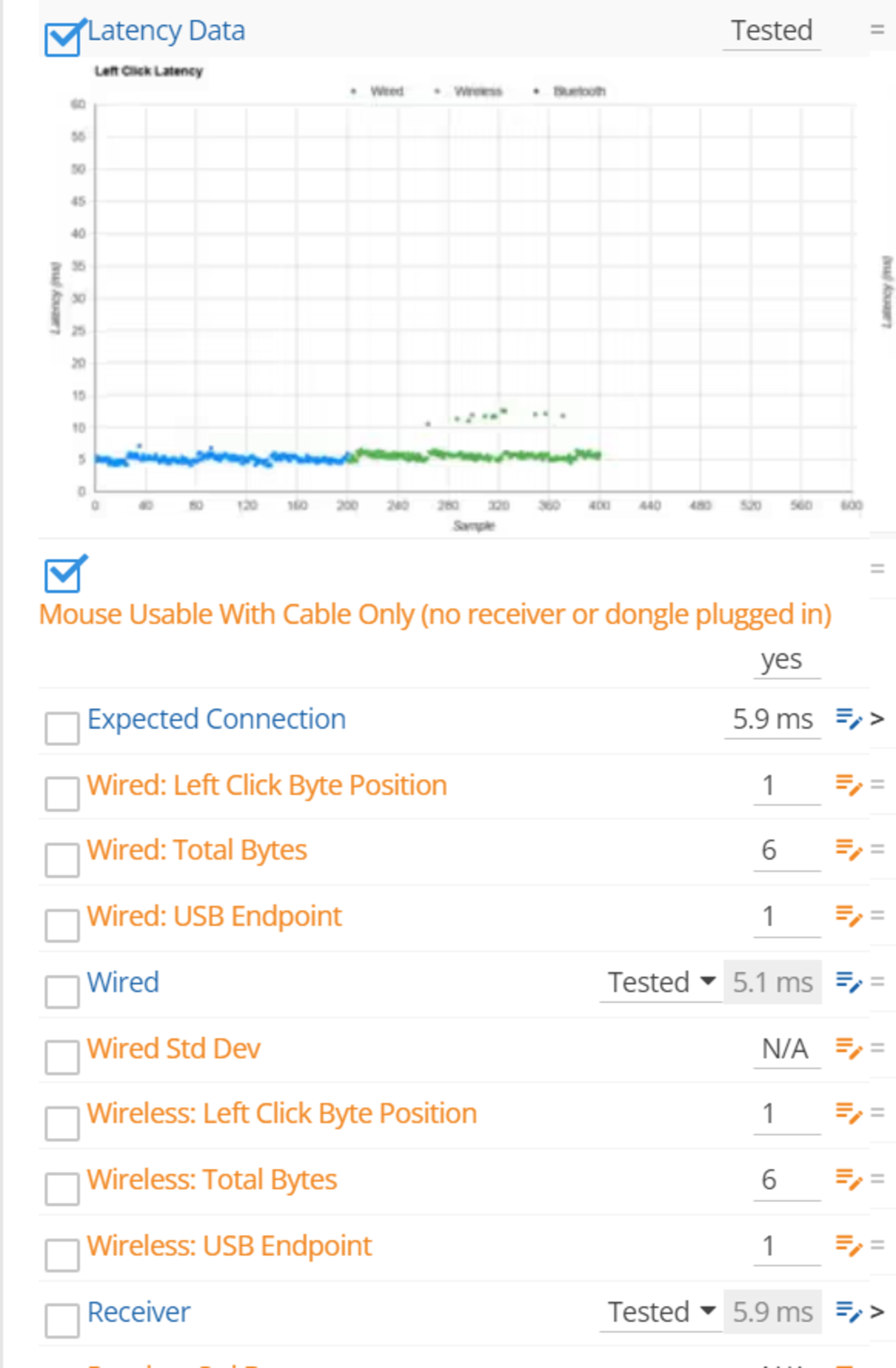 We tested this mouse connected with the Enhanced Receiver, at its maximum polling rate of 1000Hz, and with the Fast Response Time (lowest debounce) setting enabled via button combinations.