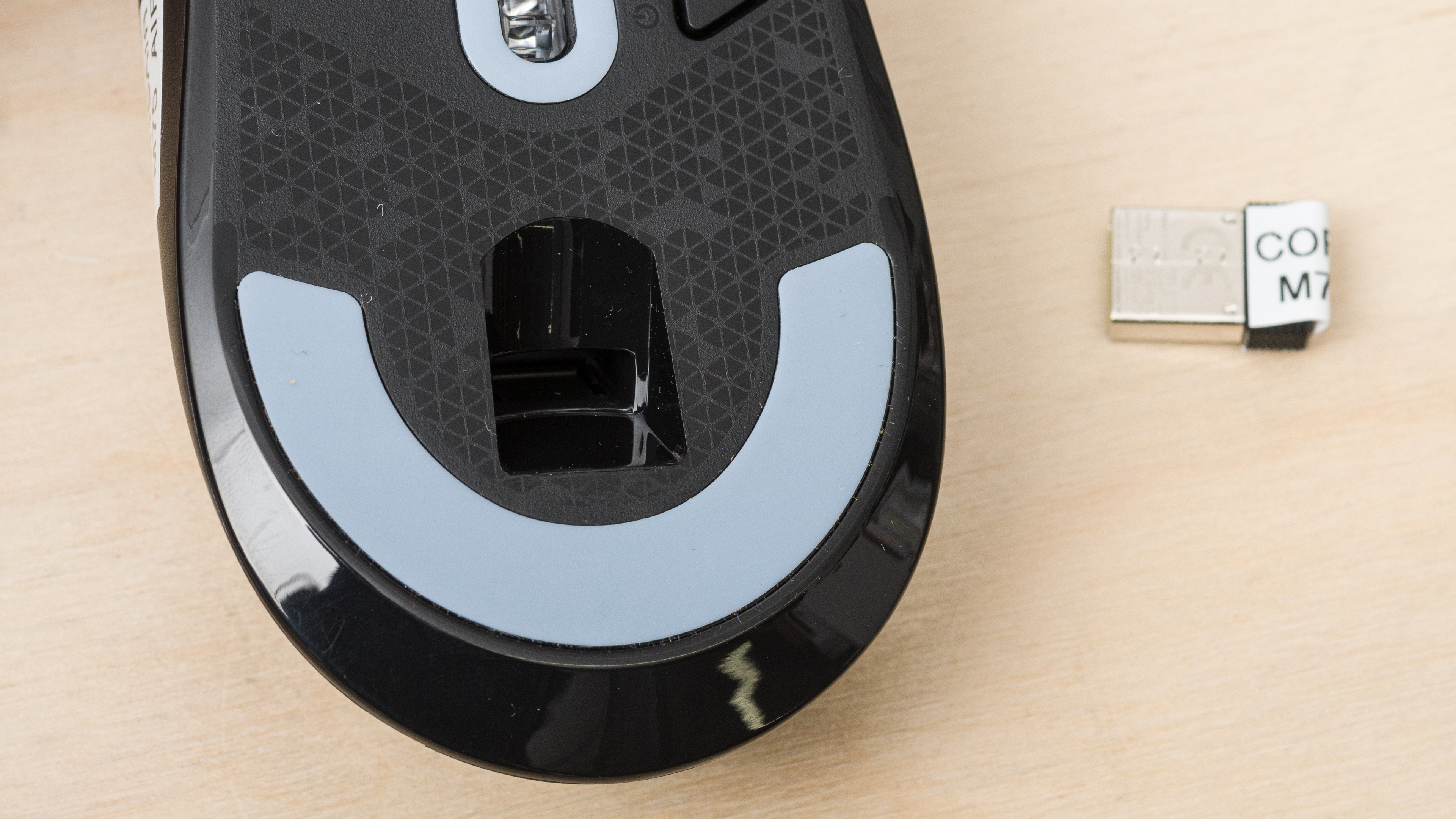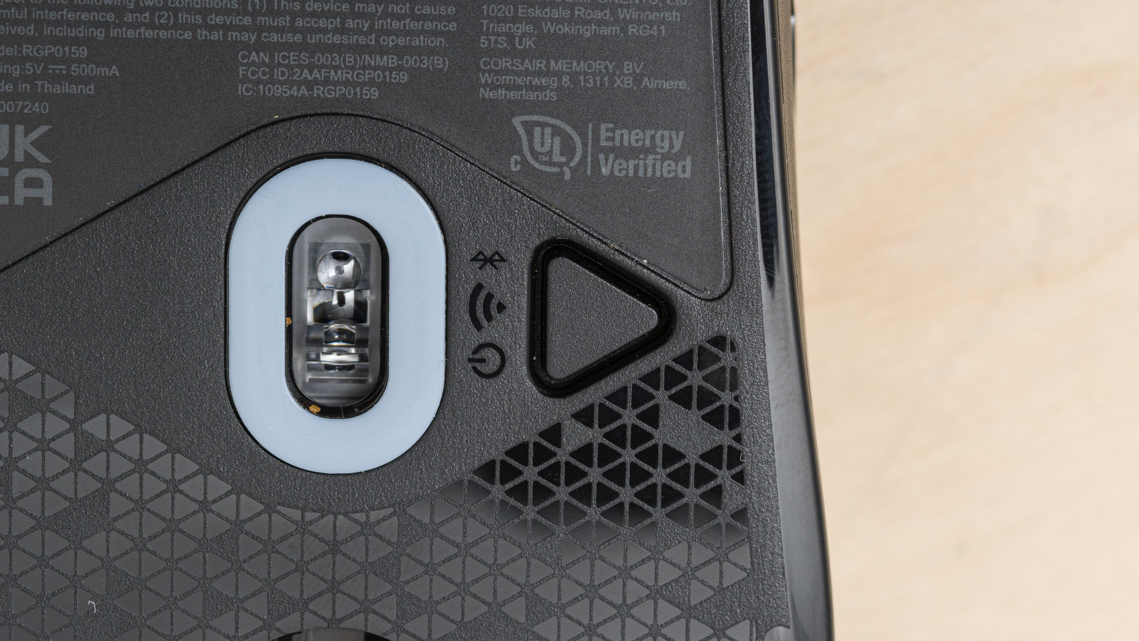 You can connect to this mouse wirelessly using its 2.4 GHz USB receiver or Bluetooth. Corsair advertises that it has up to 34 hours of battery life with the USB receiver or up to 100 hours via Bluetooth. You can also connect to two devices simultaneously and switch between them using the button on the bottom of the mouse.