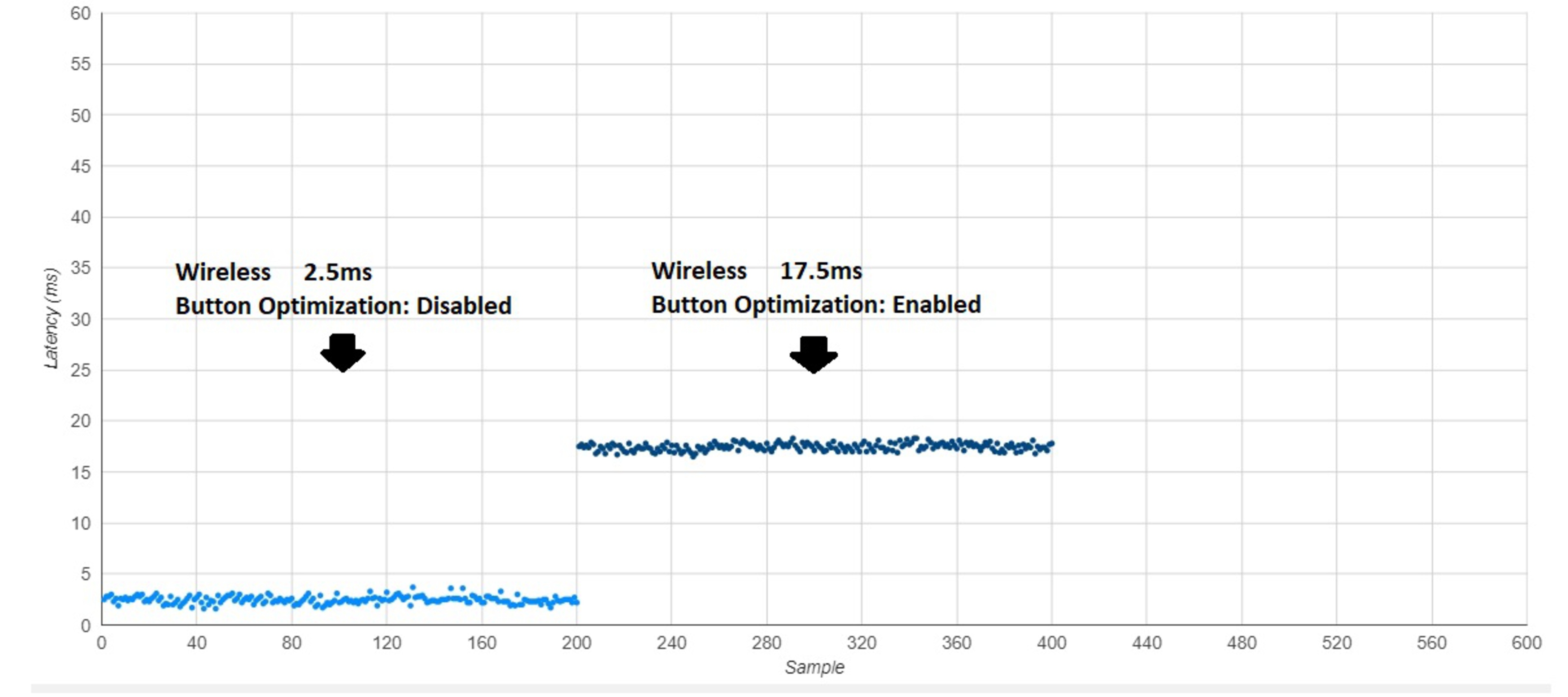 Button Response Optimization is a software setting that adds debounce delay to prevent slam clicks. We ran an additional test to see how much click latency it adds and found that it increased it to 17.5ms. Here is the graph of our results.