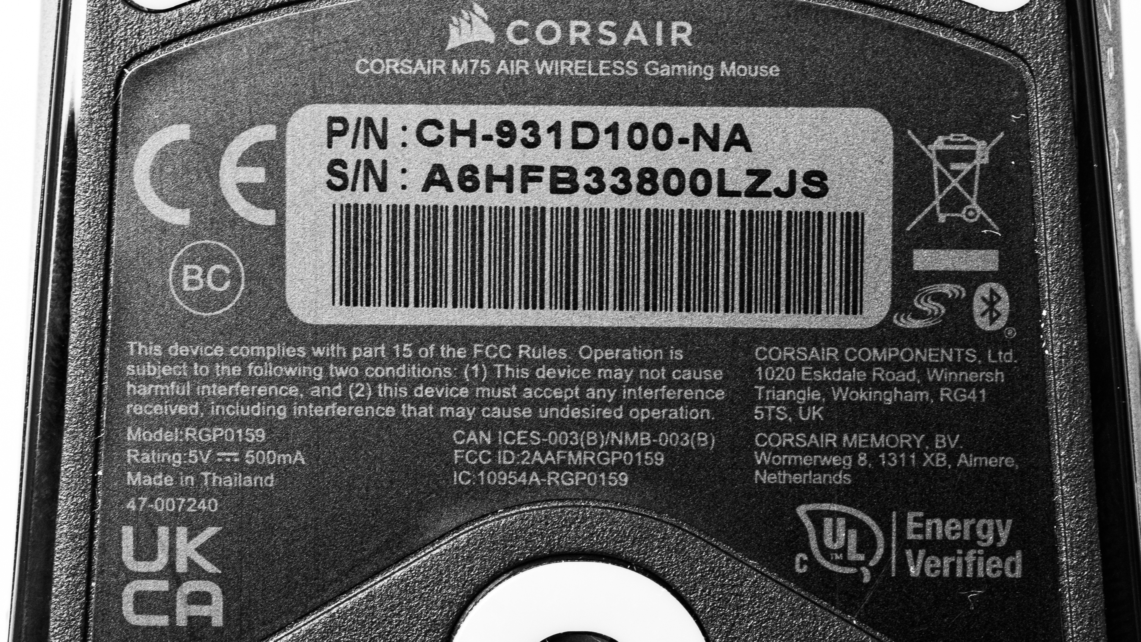 The Corsair M75 AIR is available in Black, White, or Gray color options. Corsair also sells a limited "Launch Edition" bundle, which includes the mouse in a Thunderbolt Yellow colorway, a mousepad, glass mouse skates, and grip tape, but it's only available directly on their website. We bought and tested the Black color model, and you can see the label for our unit here.