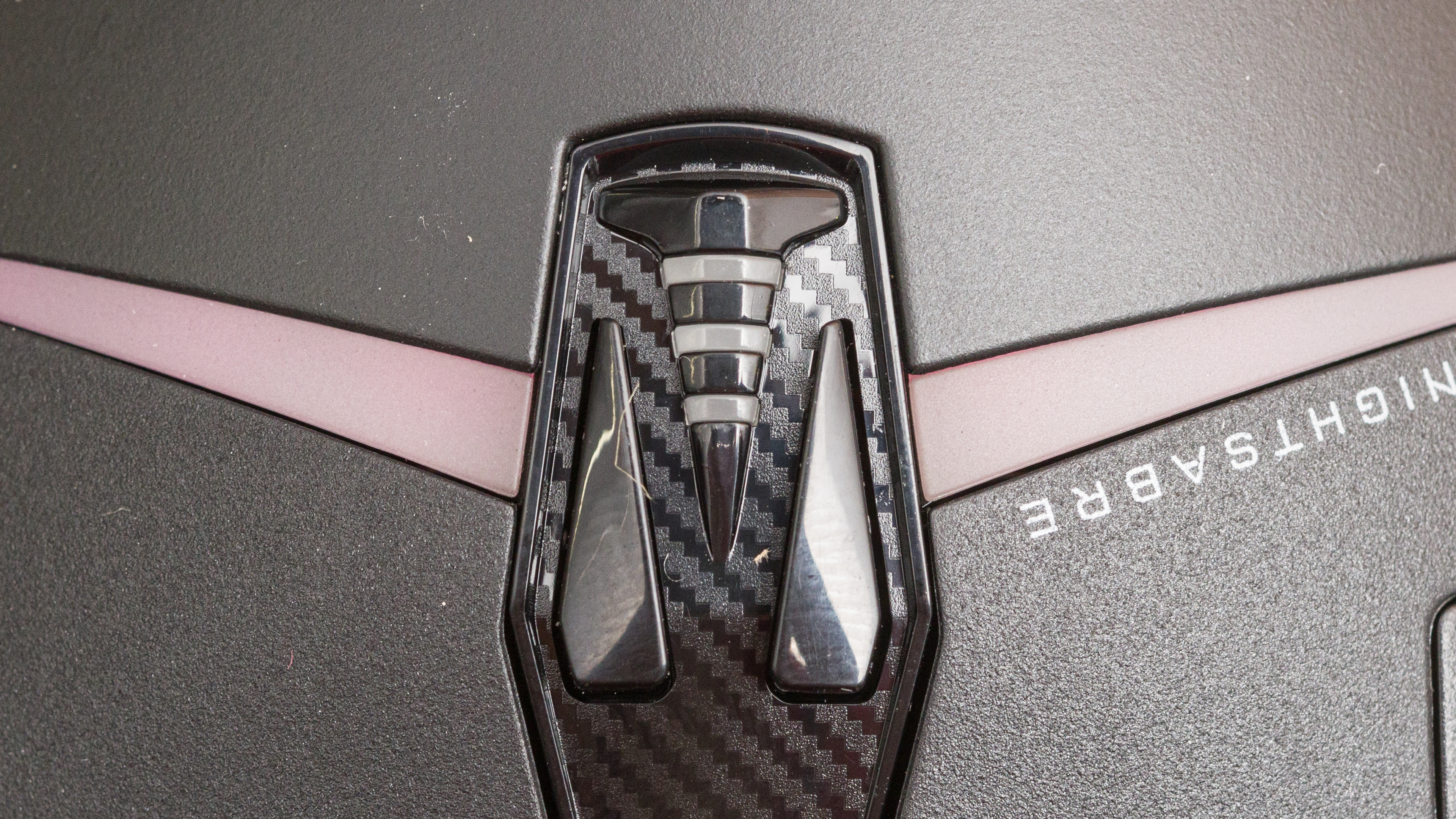 The Corsair NIGHTSABRE has a matte black plastic body with metal and faux carbon fiber accents. There are twelve customizable RGB zones, including two on the front, one on the logo in the palm rest, six in the glossy accent area below the left- and right-click buttons, and three zones around the bottom rear end.