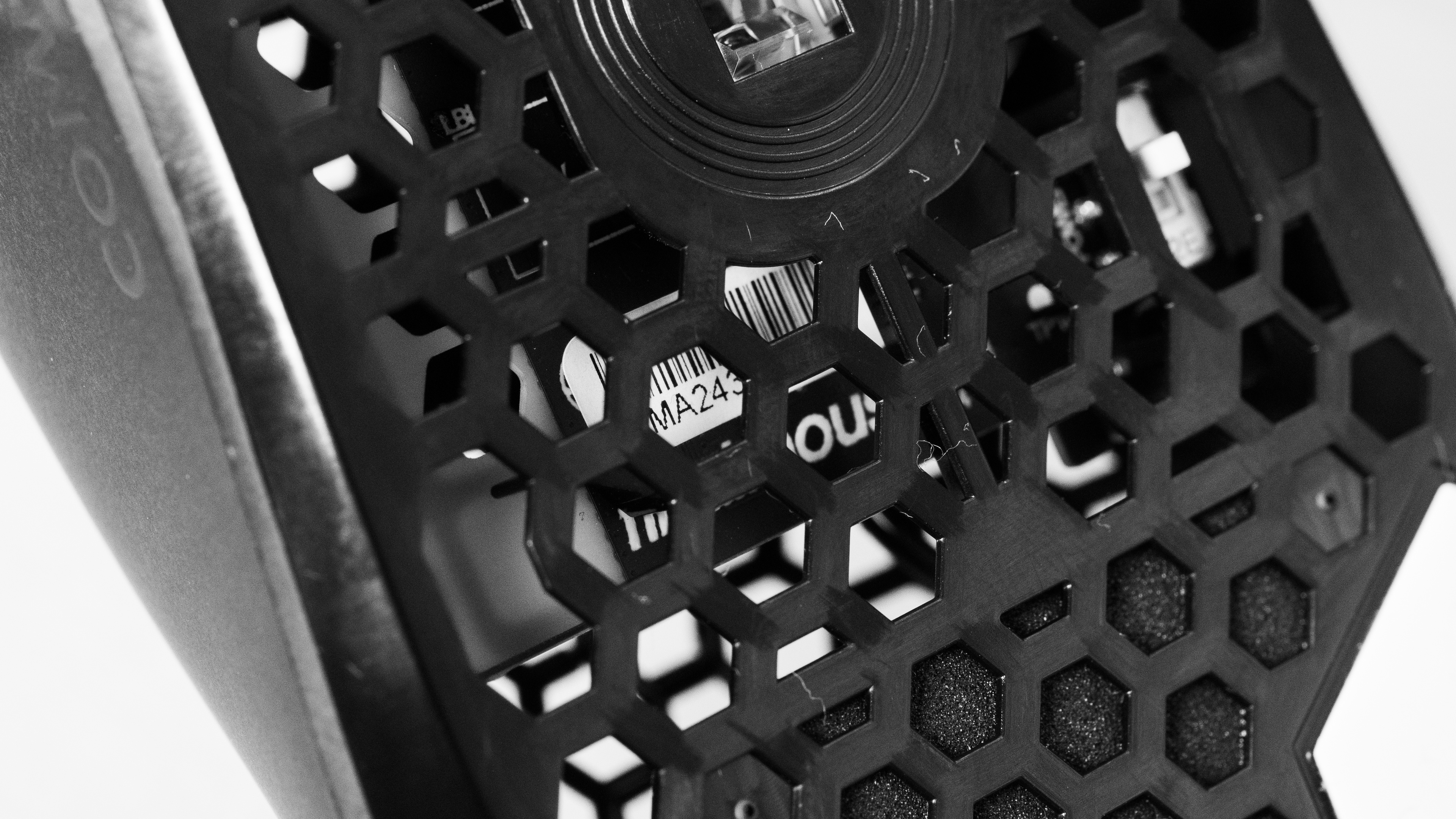 The Finalmouse UltralightX Competition is available in three sizes and only in a dark gray colorway. We bought and tested the medium-size variant. You can see an image of our unit's label here. The label is mostly obscured because it's on the inside of the mouse and partially blocked by the honeycomb body. The serial number indicated on the PCB is MA243502060. Our unit's model number is 02727 / 10,000.