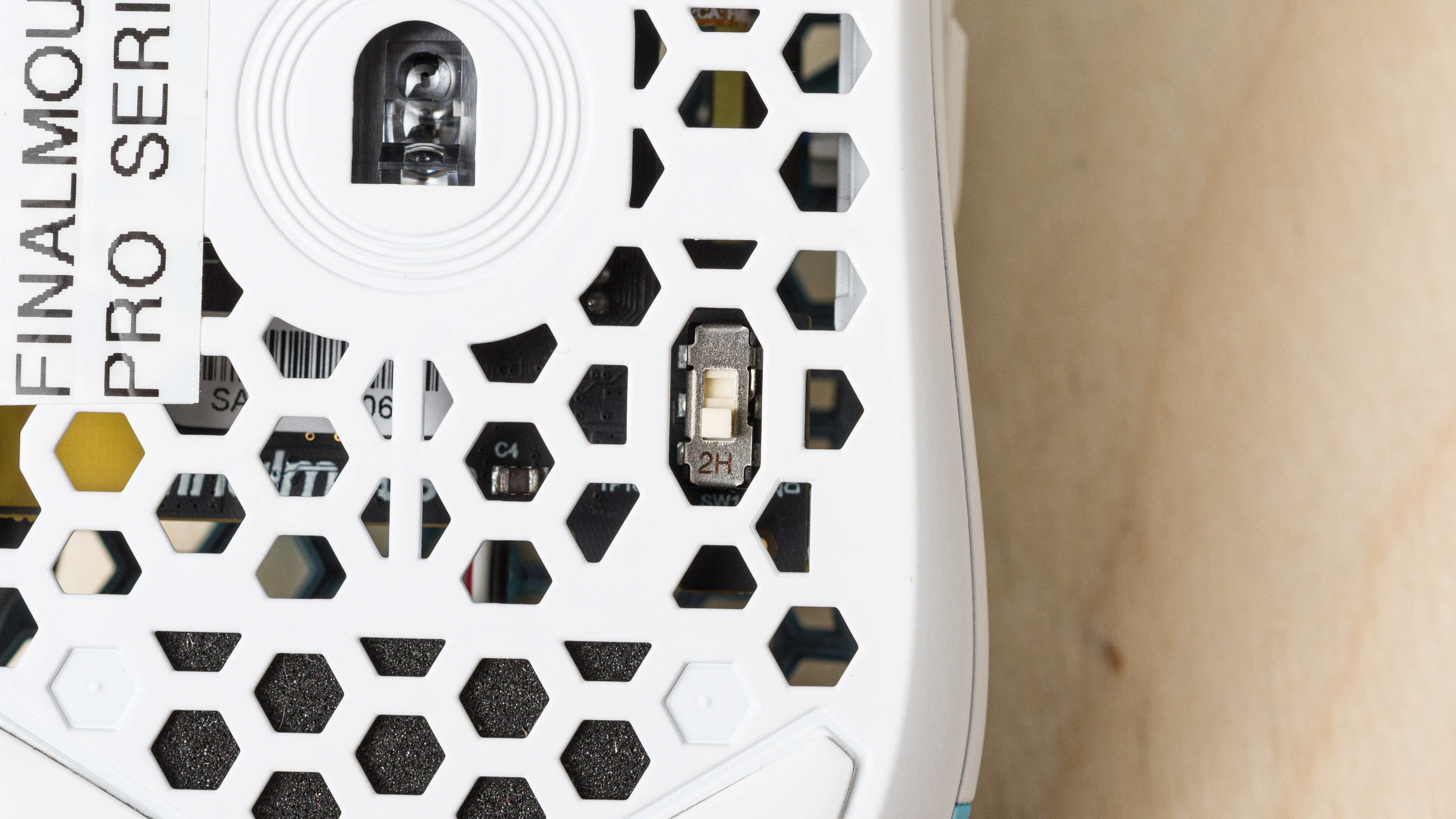 The Finalmouse ULX Pro Series is available in three size variants: small (Cheetah), medium (Lion), and large (Tiger). We bought and tested the small (Cheetah) variant. Our unit's label is here. The label is mostly obscured because it's on the inside of the mouse and partially blocked by the honeycomb exterior. The model number on our unit is S/N: SA241704063.