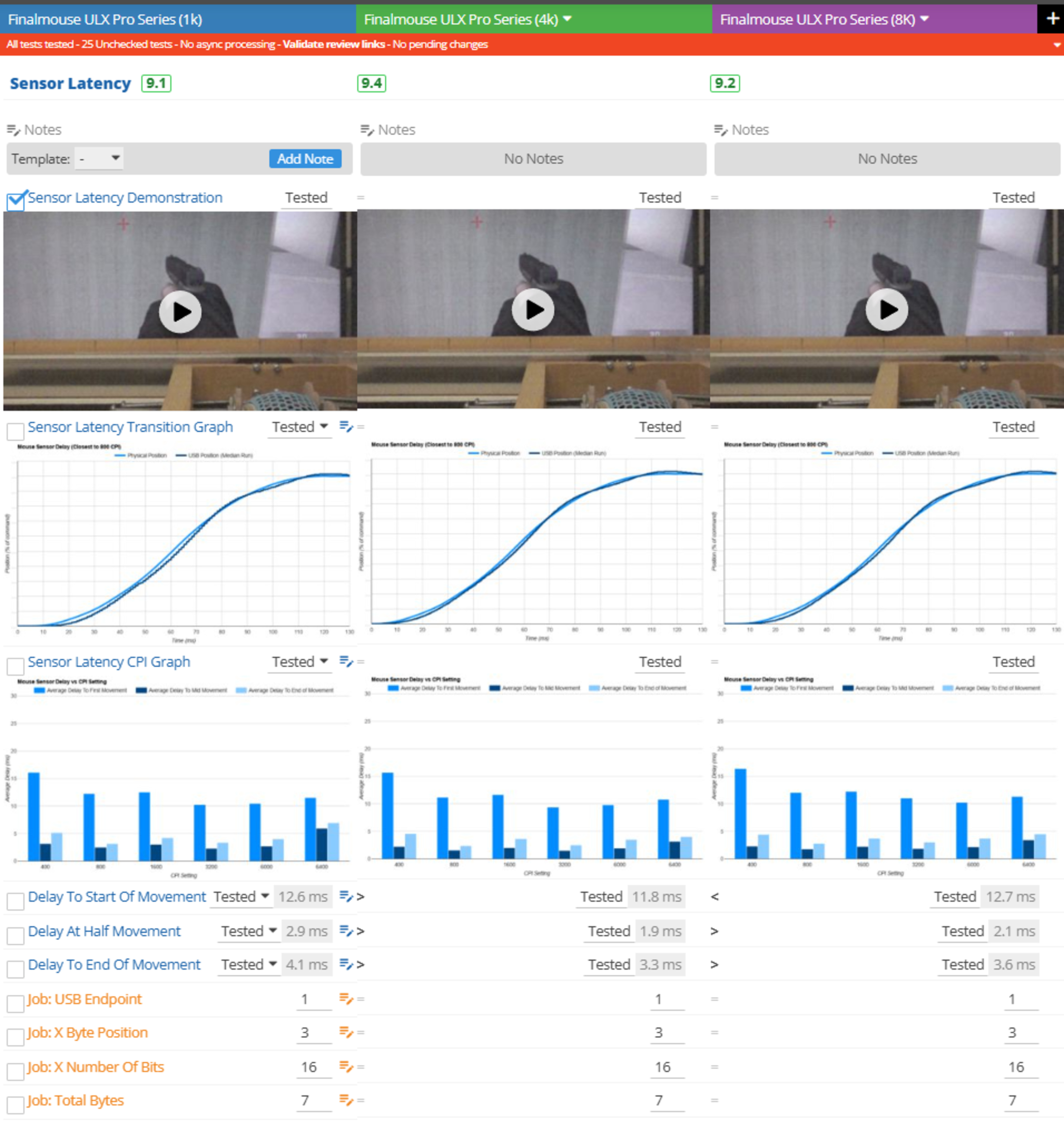 For comparison, we conducted additional testing of multiple polling rates. These results demonstrate very similar performance between 4000hz and 8000Hz settings, which we've also confirmed with other models in the wider UltralightX family, including the original Finalmouse UltralightX and the newer Finalmouse UltralightX Competition.
