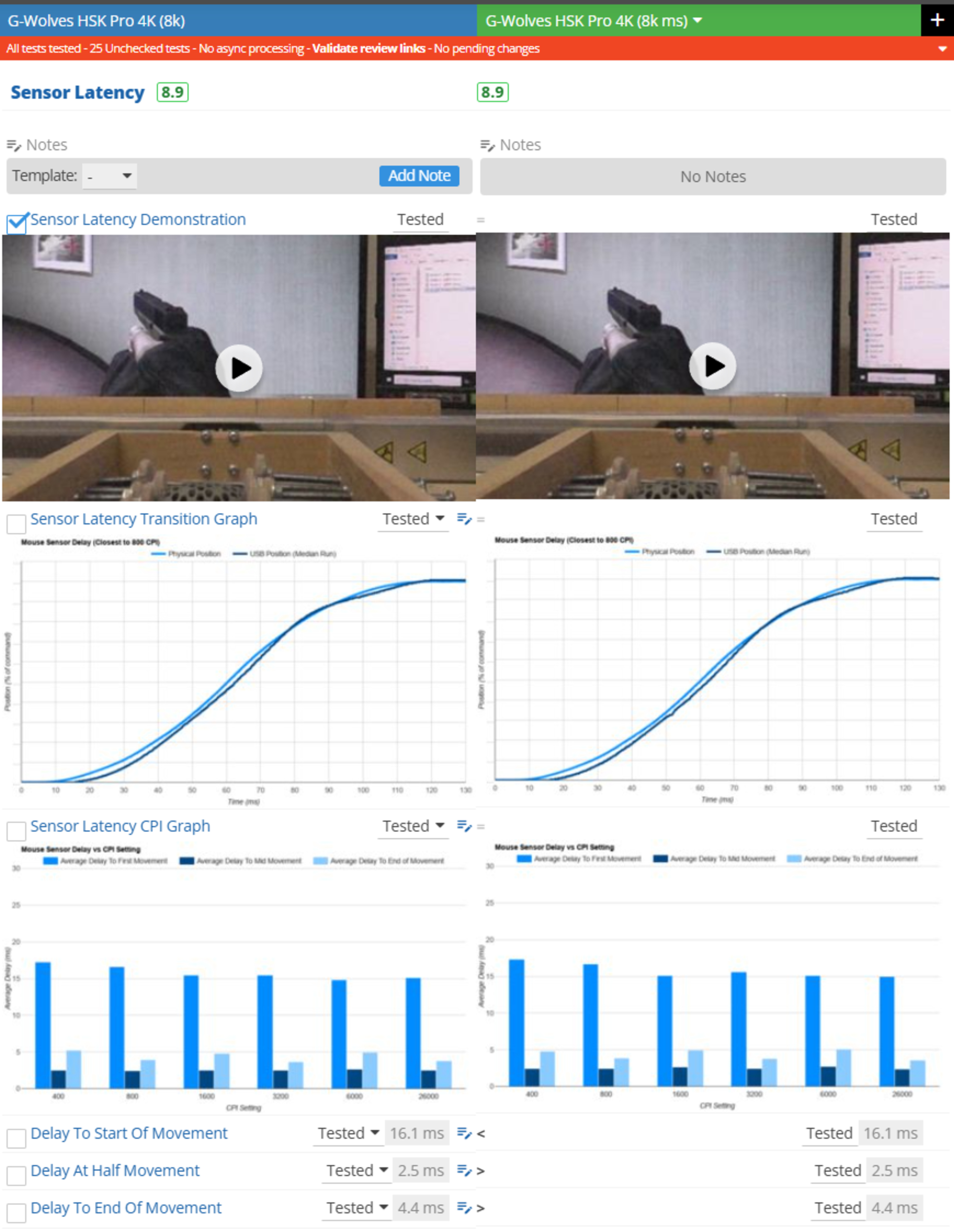 The G-Wolves HSK Pro 4K has excellent sensor latency performance. It reacts quickly to your movements and is suitable for casual and competitive gaming. We conducted this test at a polling rate of 4000Hz with Motion Sync turned off. These results, especially the delay at half movement and the delay to end of movement, are on the higher side of what's expected for a gaming mouse with a 4000Hz polling rate.