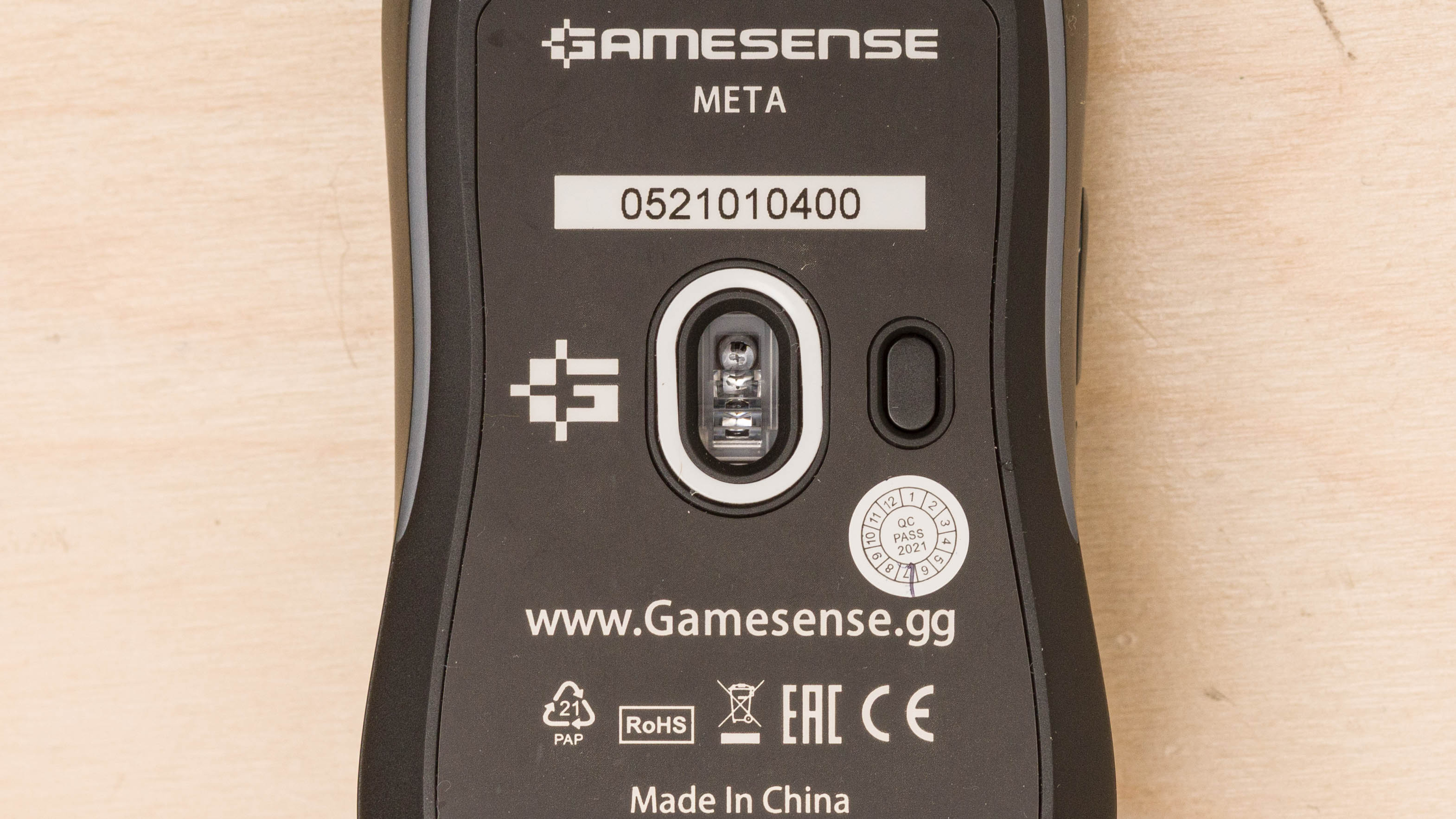 The Gamesense Meta is a lightweight, ambidextrous mouse with two buttons on its left side and a dedicated CPI button behind its scroll wheel. It has low click latency, a very low lift-off distance, a wide CPI range, and a CPI that you can adjust in increments of 100. It's suitable for all grip types and most hand sizes; however, people with extra-large hands might find the mouse too small to hold comfortably with a palm or claw grip. Also, people with small hands may struggle to reach the scroll wheel when using a fingertip grip. It feels well-built, though the mouse rattles when shaken, and the scroll wheel wobbles side to side.