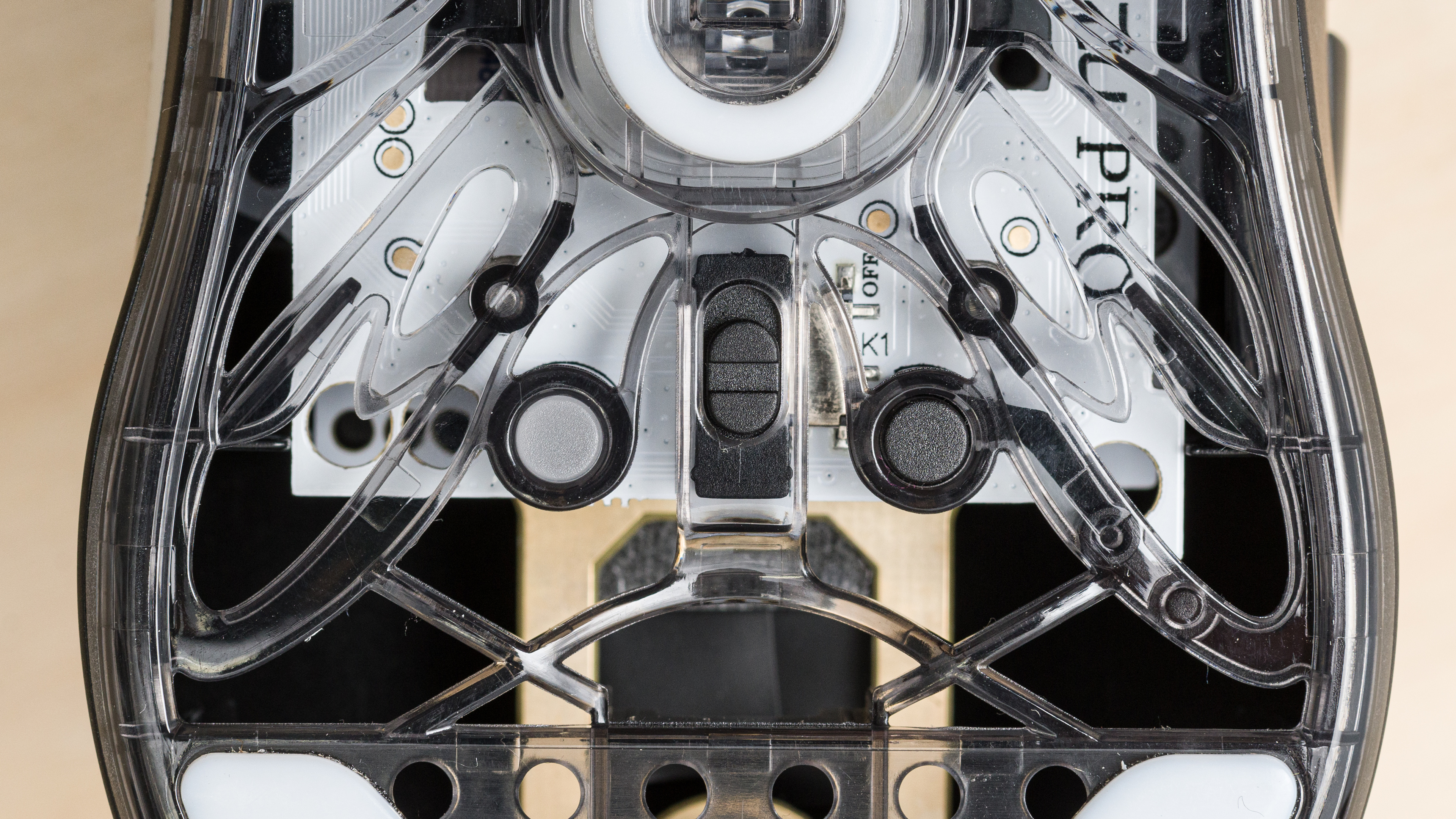 The LAMZU Atlantis Mini 4K has a matte black plastic body that looks and feels similar to other mice with the same finish in LAMZU's lineup, like the LAMZU THORN. It has a plastic framework on its underside that leaves the interior open. The scroll wheel has a black finish and a translucent, smokey gray rubberized grip. It has a small LED behind the left- and right-click buttons to indicate the battery level and another LED indicator that shines faintly through the baseplate to indicate your CPI setting.