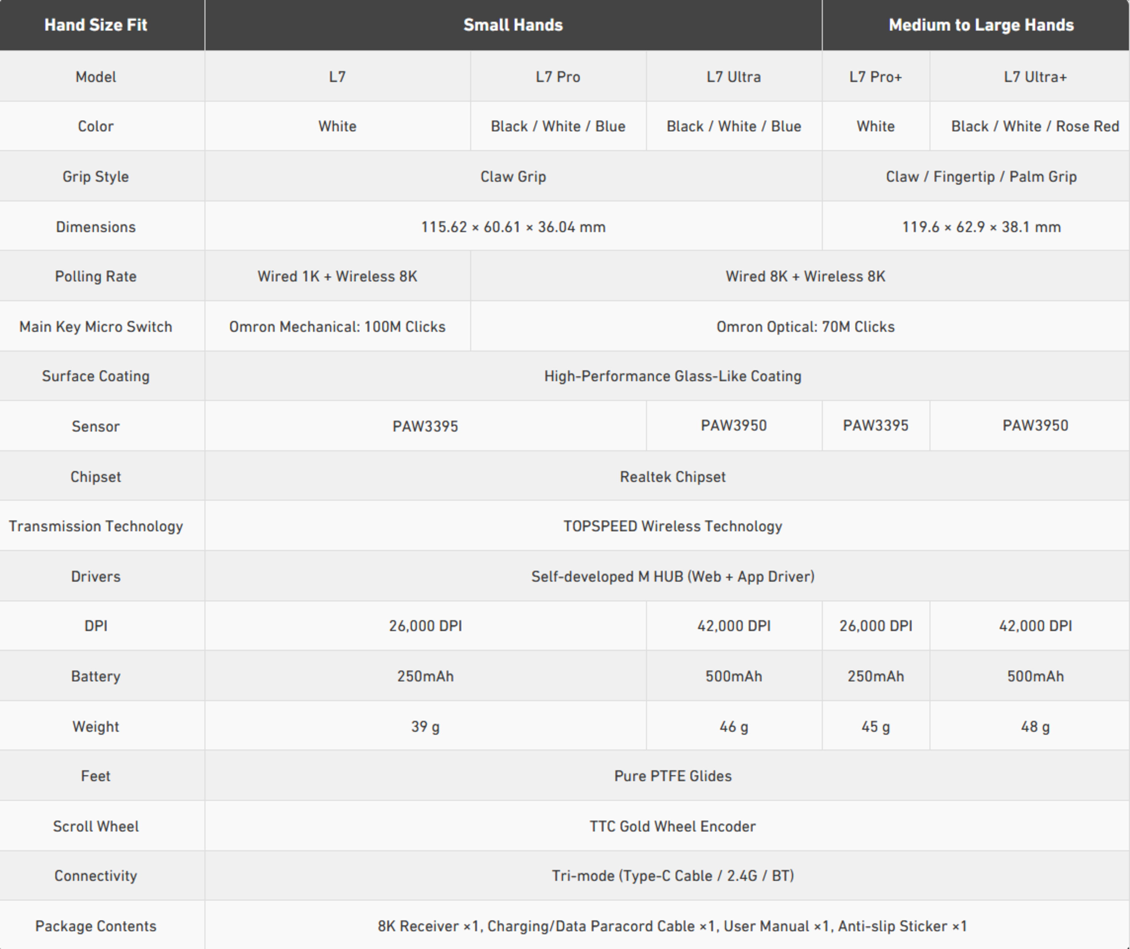 | L7 Ultra | White, Black, Blue | Omron Optical | PixArt PAW3950 | 500mAh | 46g (± 2g) |