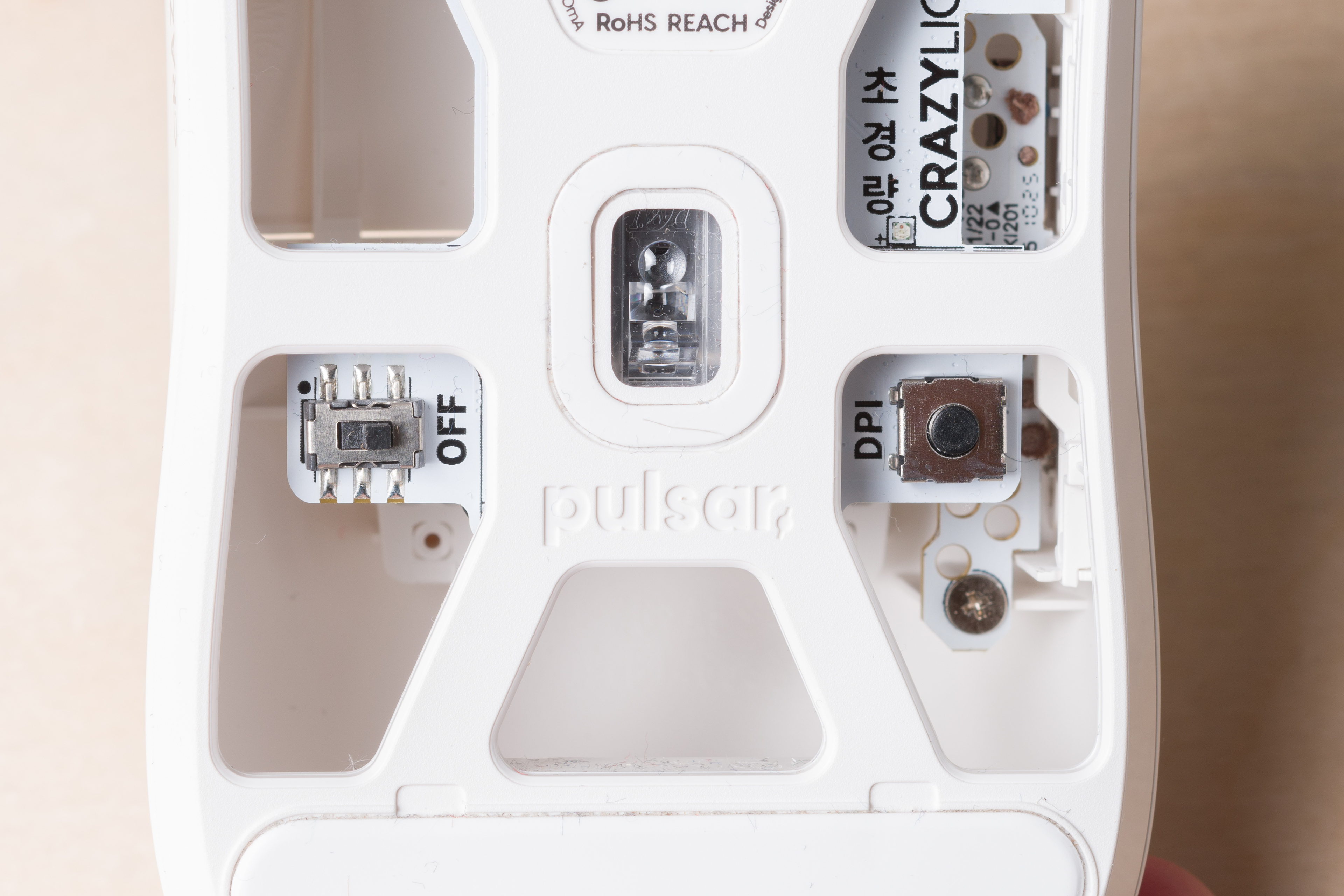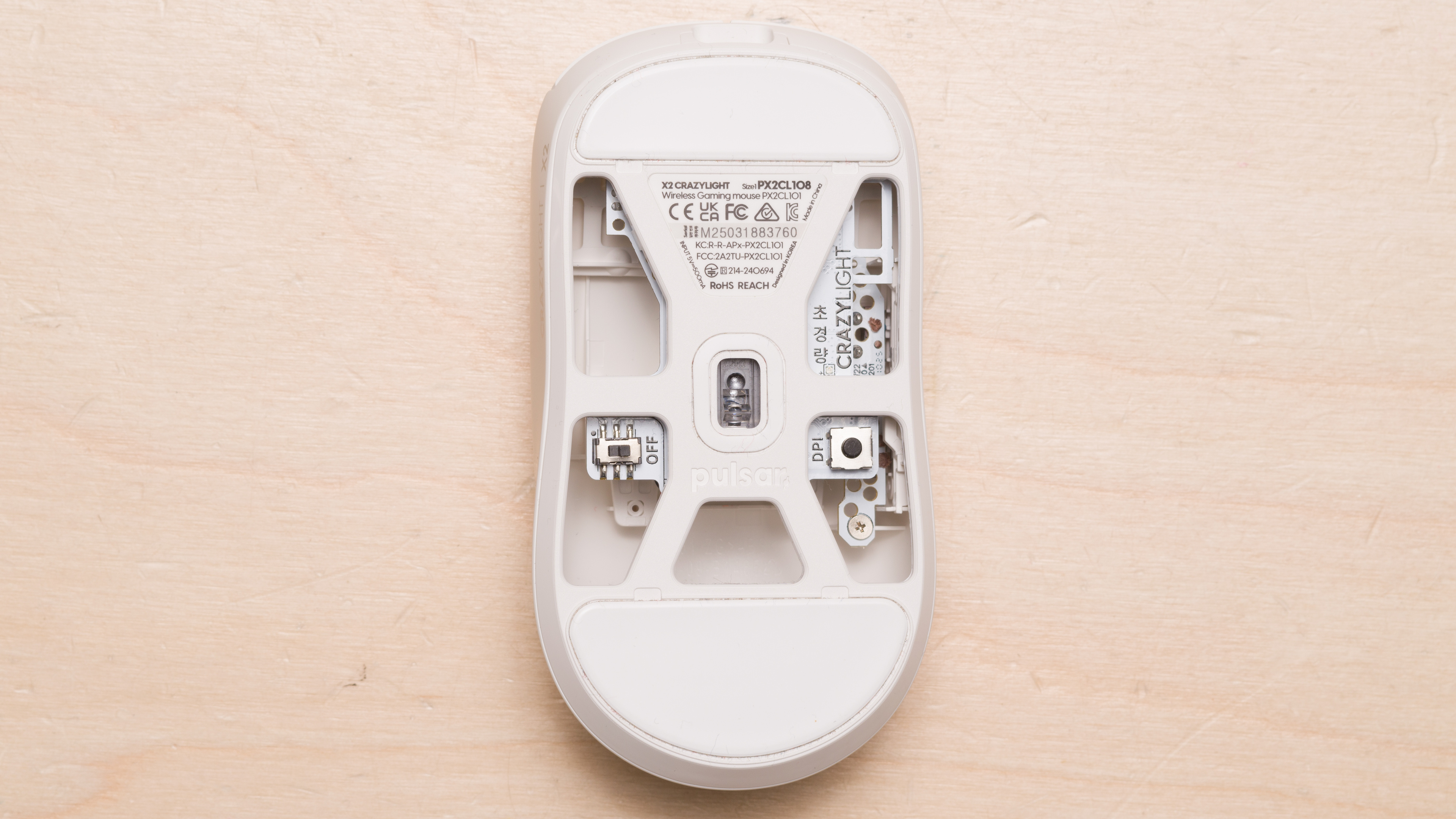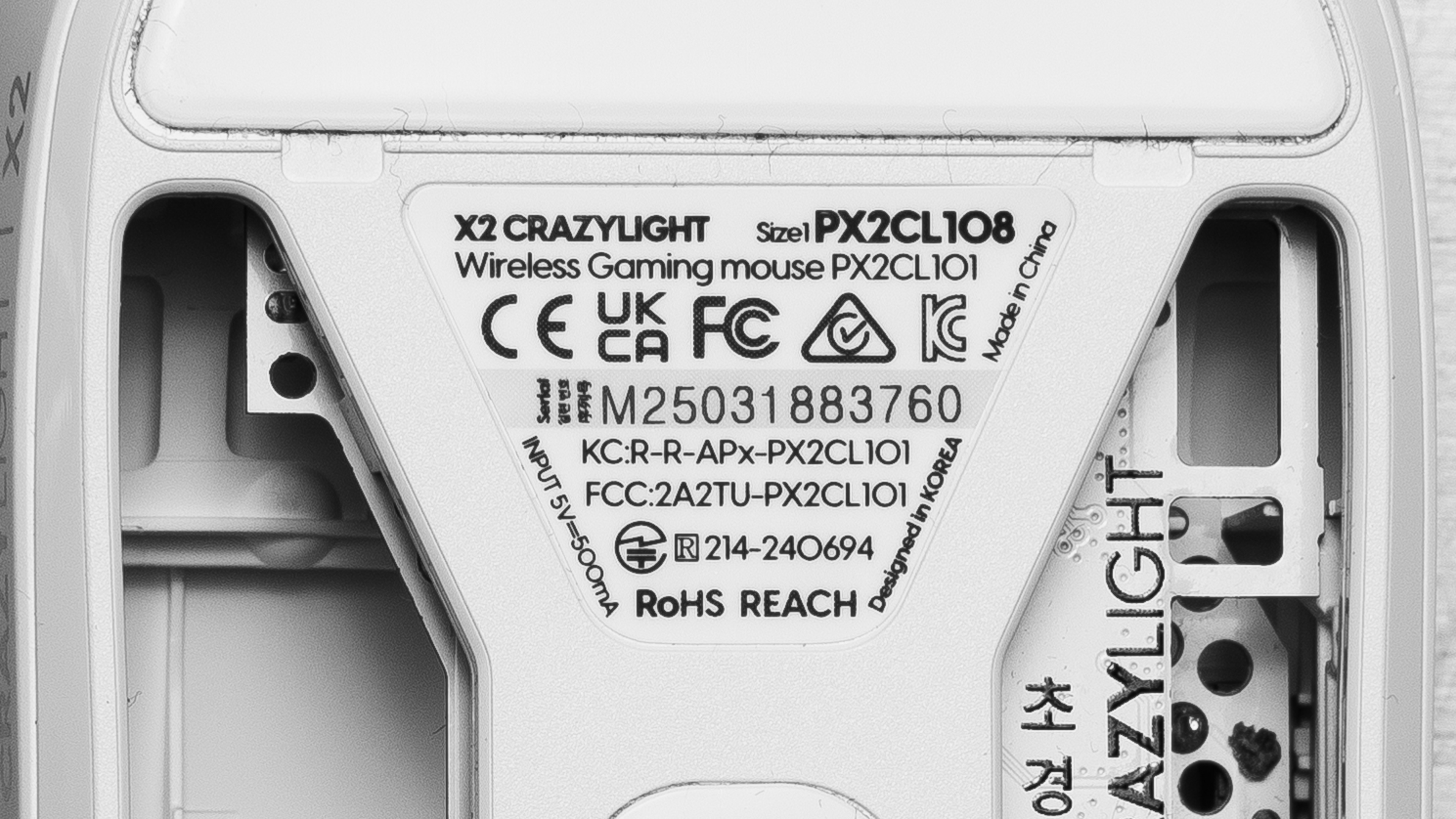 The Pulsar X2 CrazyLight is available in several colorways. We bought and tested a Uyuni White unit. Pulsar also releases many limited edition or regional colorways, but we've chosen to avoid including mention of them because, apart from the visual design of the shell, these "edition" models are identical to their base model counterparts. You can see a photo of our unit's label for reference.