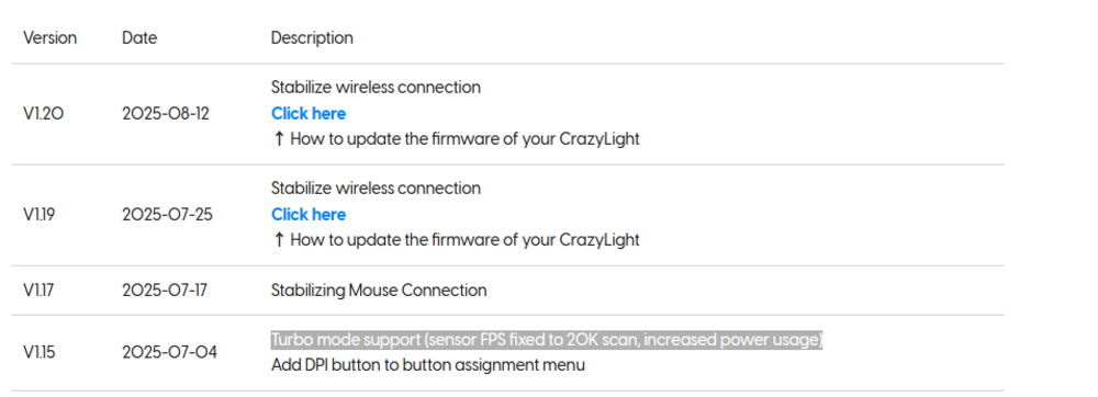 We attempted to use the software's Turbo mode setting, but it didn't function correctly at the time of testing. In any case, we don't expect it to meaningfully affect our results. According to Pulsar, Turbo mode locks the sensor scan rate to 20K, which may provide benefits at lower CPI settings, though it comes at the cost of higher battery consumption. See the Configuration Software section for more details.