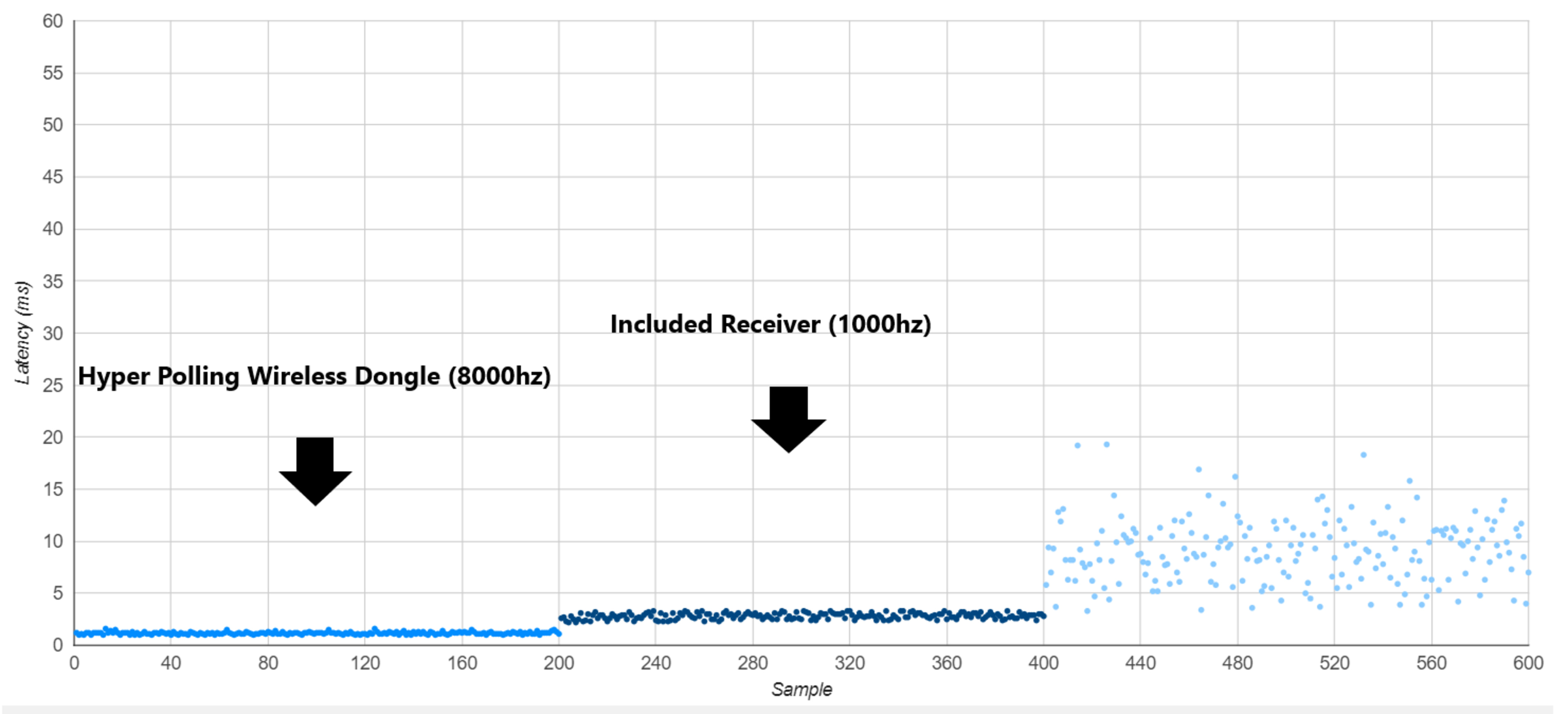 We also tested this mouse at a polling rate of 8000Hz using Razer's HyperPolling Dongle, which Razer sells separately. Using the HyperPolling Dongle, we measured the click latency at 1.2 ms. You can see an image comparing our results here as well as a video of our testing at 8000Hz here.