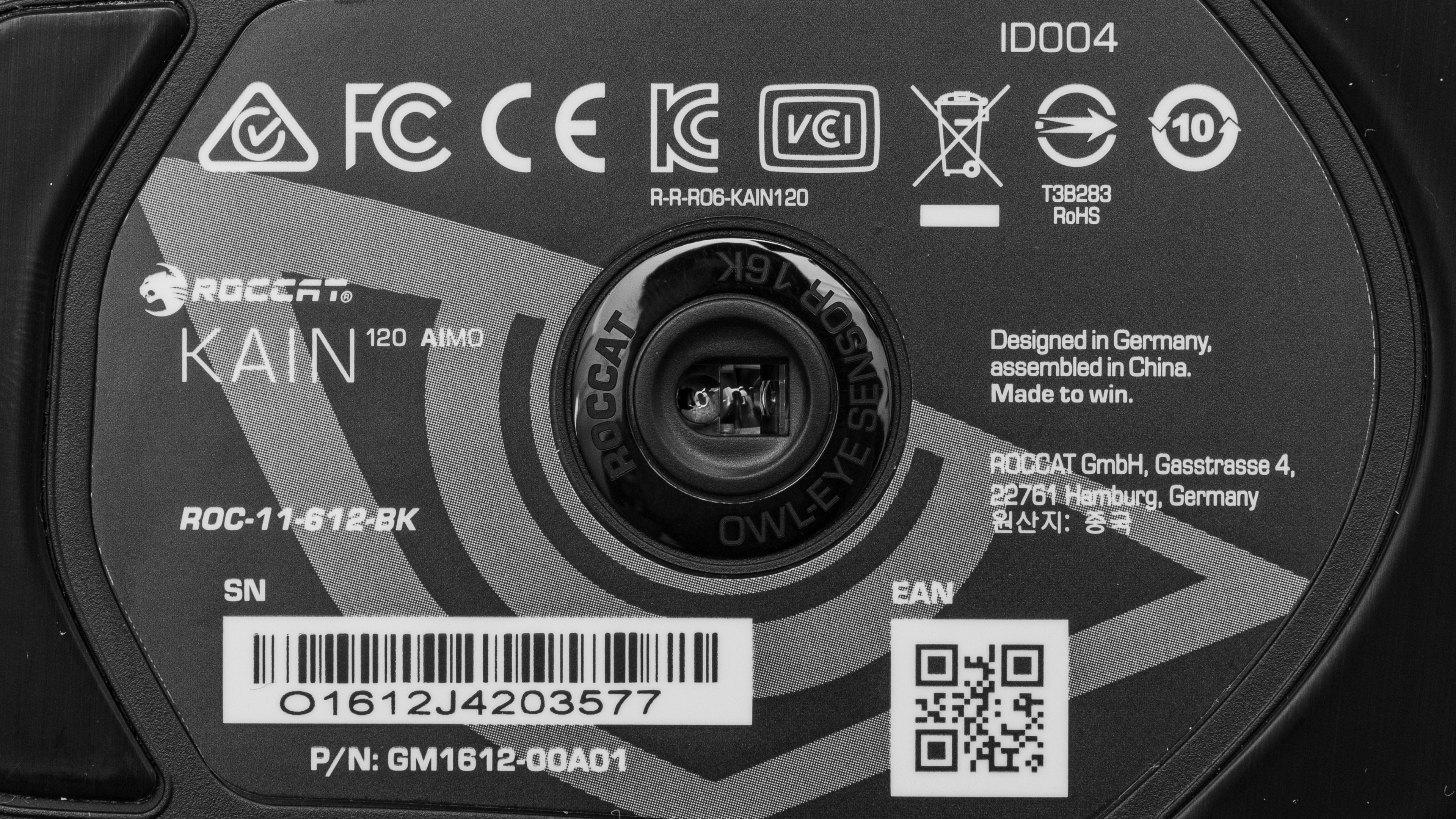 We tested the ROCCAT Kain 120 in the black color variant. There's also a white color variant available named the ROCCAT Kain 122 AIMO. Although differently named, the differences between the two variants seem to be exclusively the color, so we expect our test results to apply to the Kain 122 as well. You can see our unit's label here.