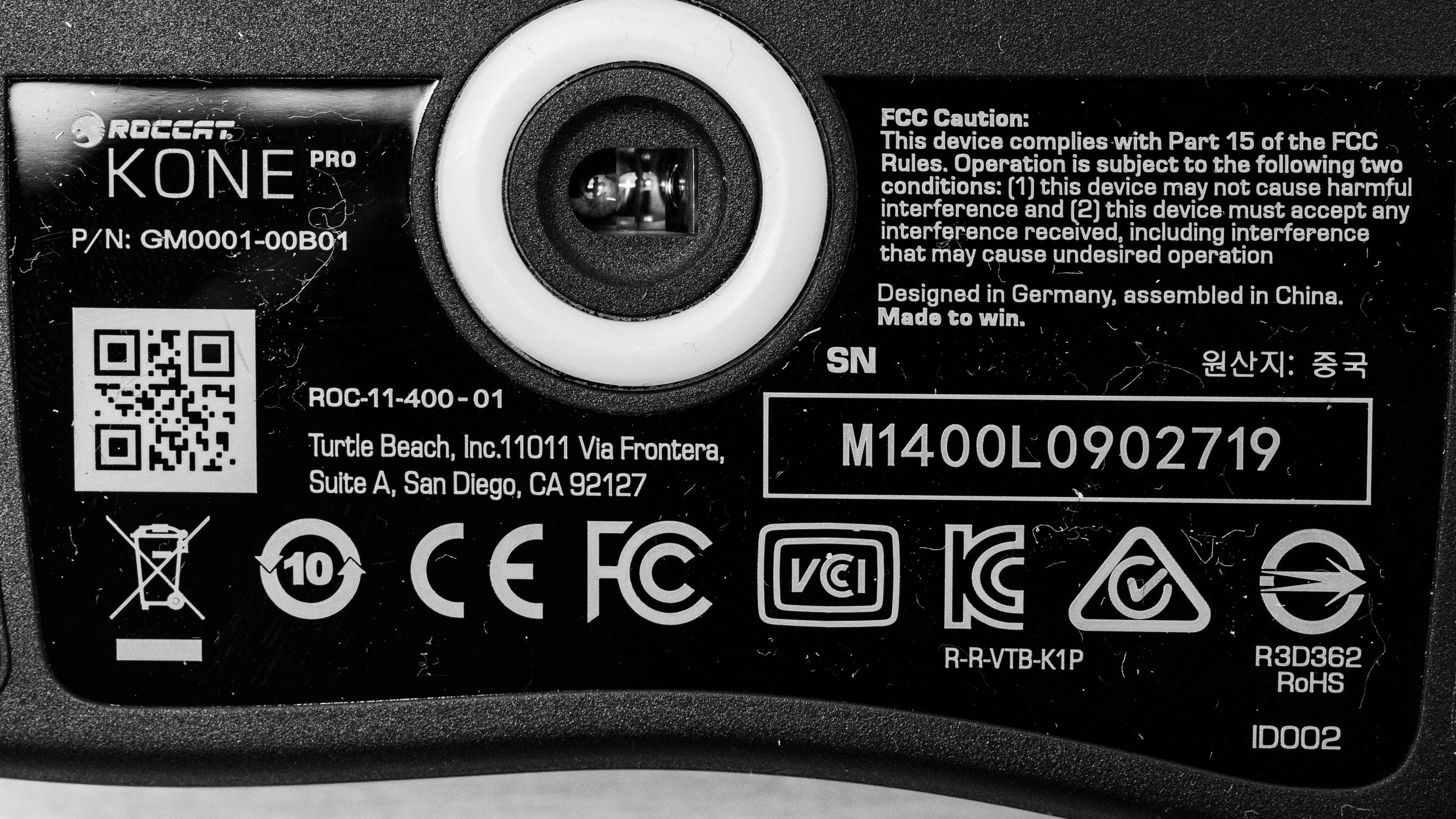 The ROCCAT Kone Pro we tested is the black color variant, and it's also available in white. The very similar ROCCAT Kone Pro Air is a wireless version of this mouse. You can see the label for our unit here.