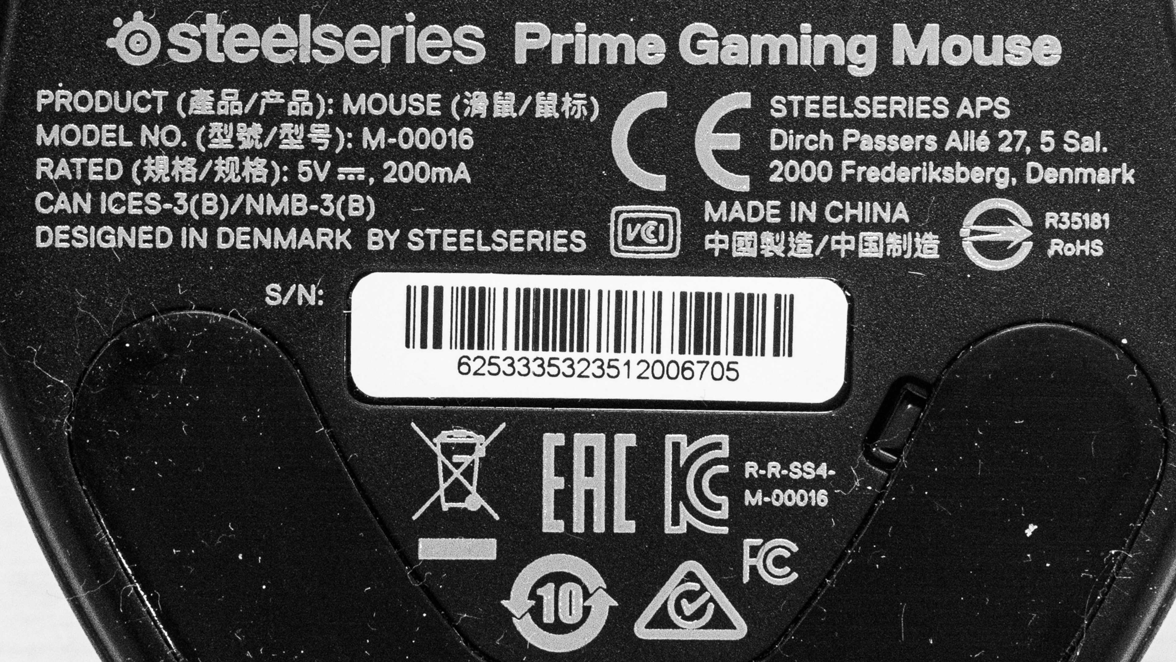 The SteelSeries Prime belongs to a lineup of three SteelSeries mice that share the same ergonomic shape. The SteelSeries Prime is the base version, but there's also a SteelSeries Prime+, which has an OLED screen and a secondary sensor on the underside, and the SteelSeries Prime Wireless, a version with wireless connectivity options. The model we tested is black, and there are no other color variants. You can see the label for our unit here.
