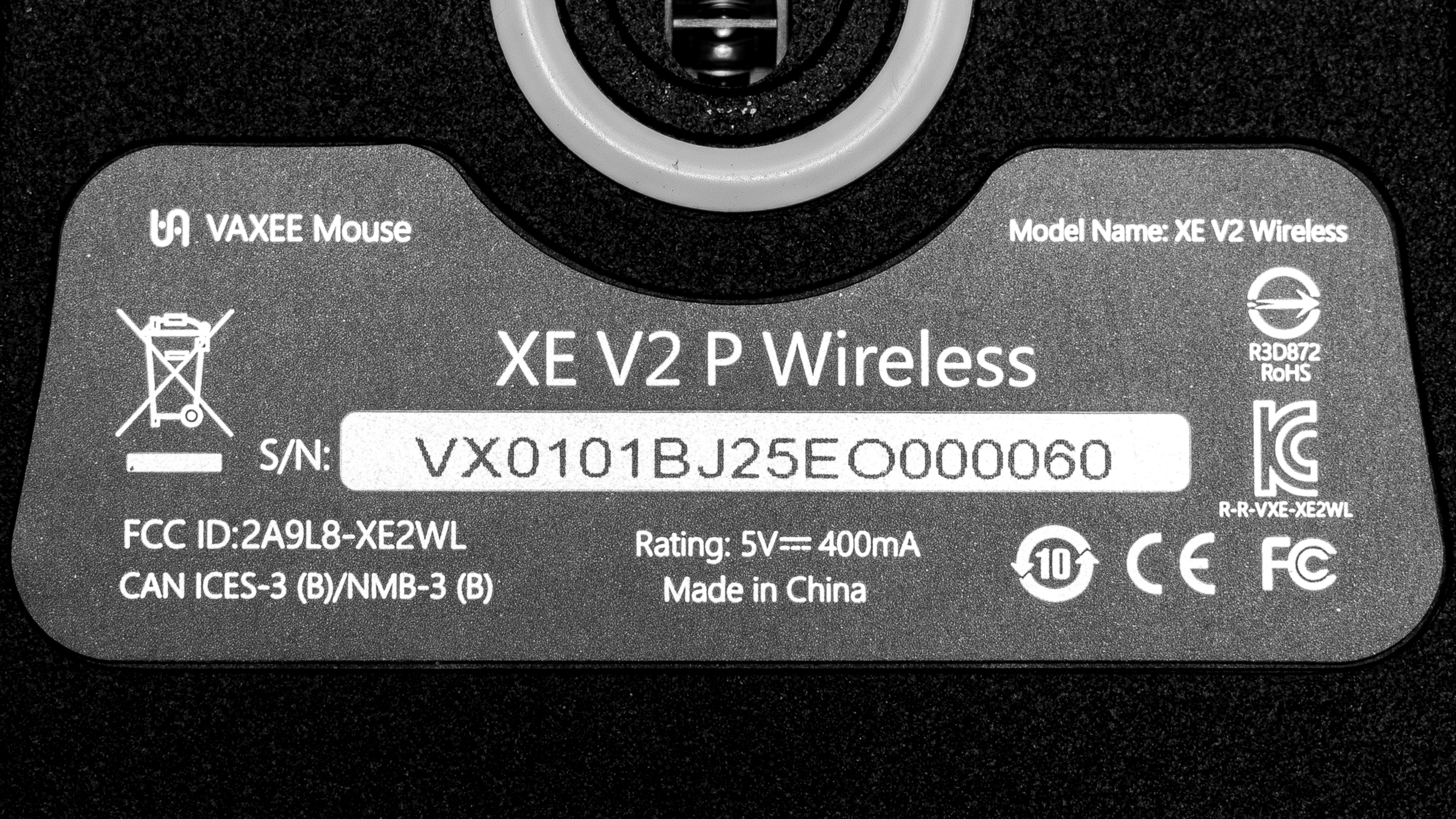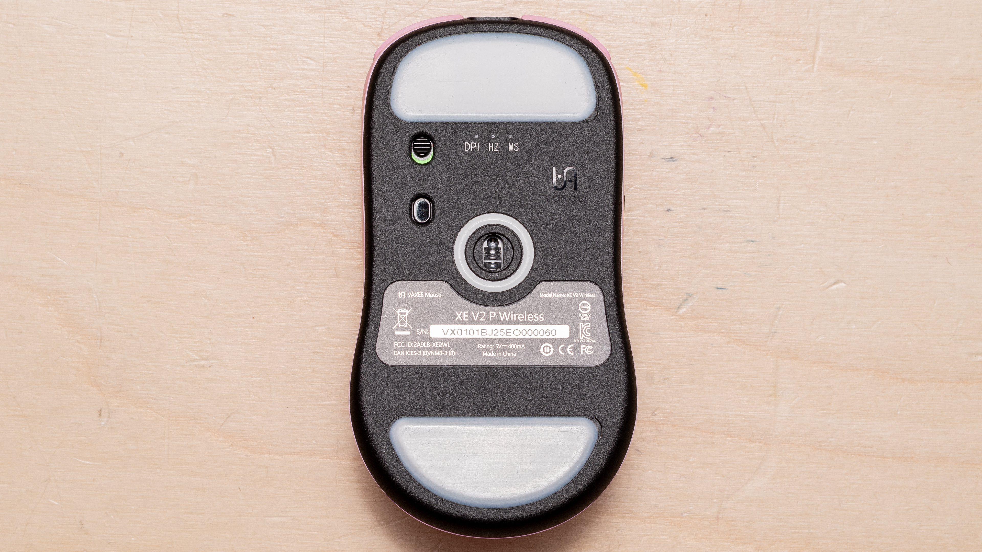 The Vaxee XE v2 Wireless (4K) is available in Obsidian Black, Pink, White, Lake Green, Red, and Fluorescent Green. We bought and tested the Pink colorway. See our unit's label here.
