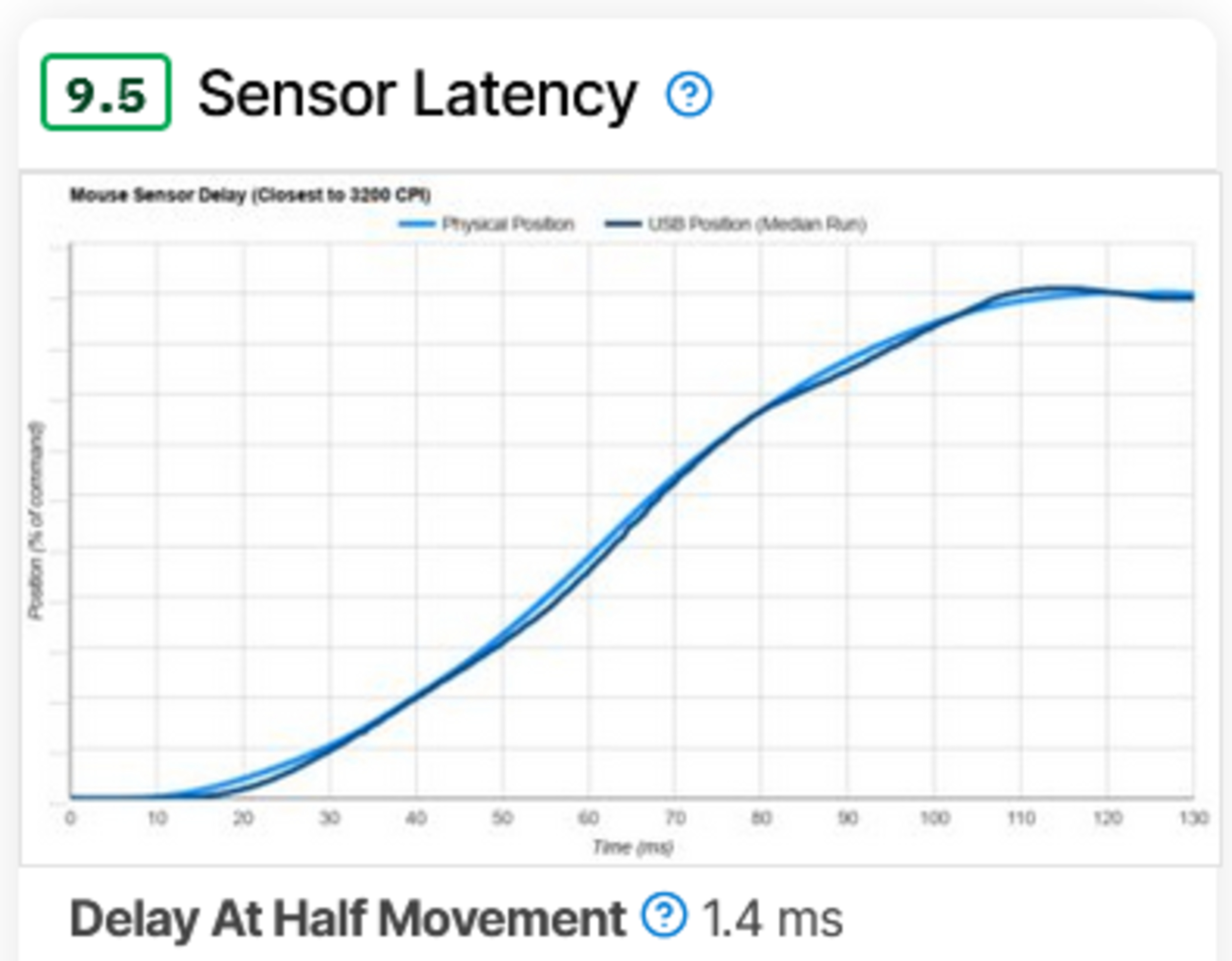 - The Delay To End Of Movement results also suffered from inconsistency. We determined this measurement was highly dependent on mechanical factors in our testing rig, including inertia, cradle rigidity, and mousepad friction. Each of these was prone to small variations and could have an outsized effect on our measurements. Furthermore, due to the improvement in the quality of modern sensors, these differences are increasingly on the order of sub-microsecond variation.
